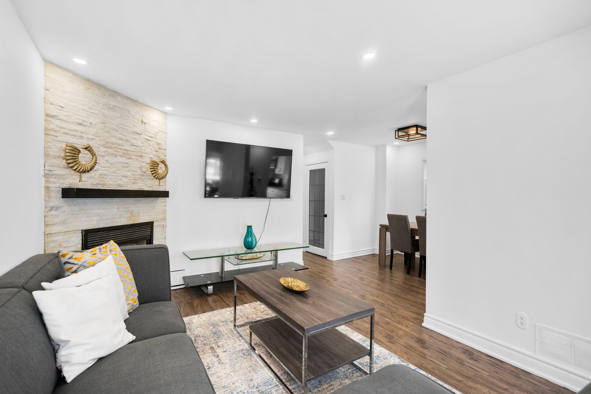 • L-shaped living and dining area with a cozy fireplace.