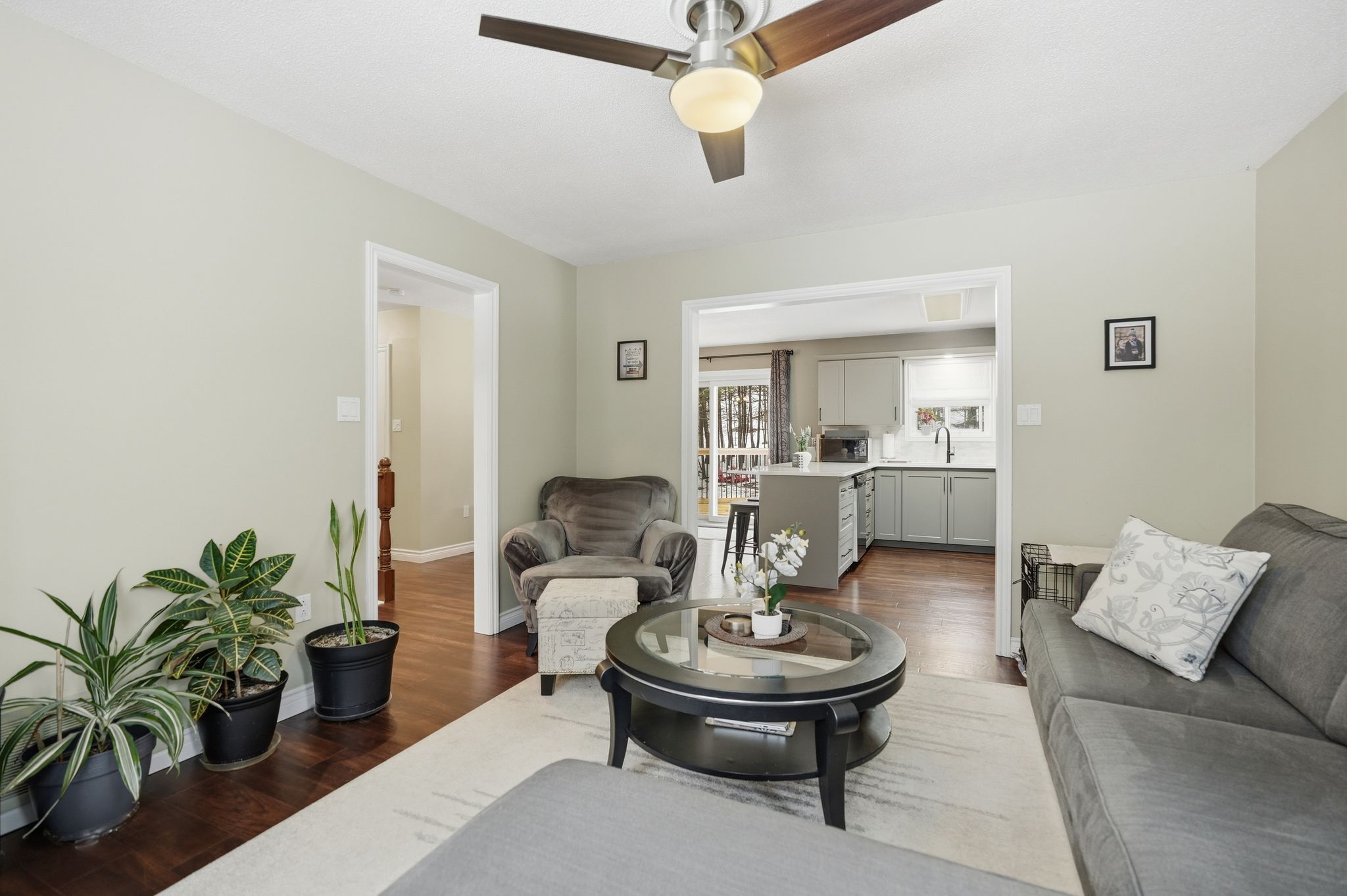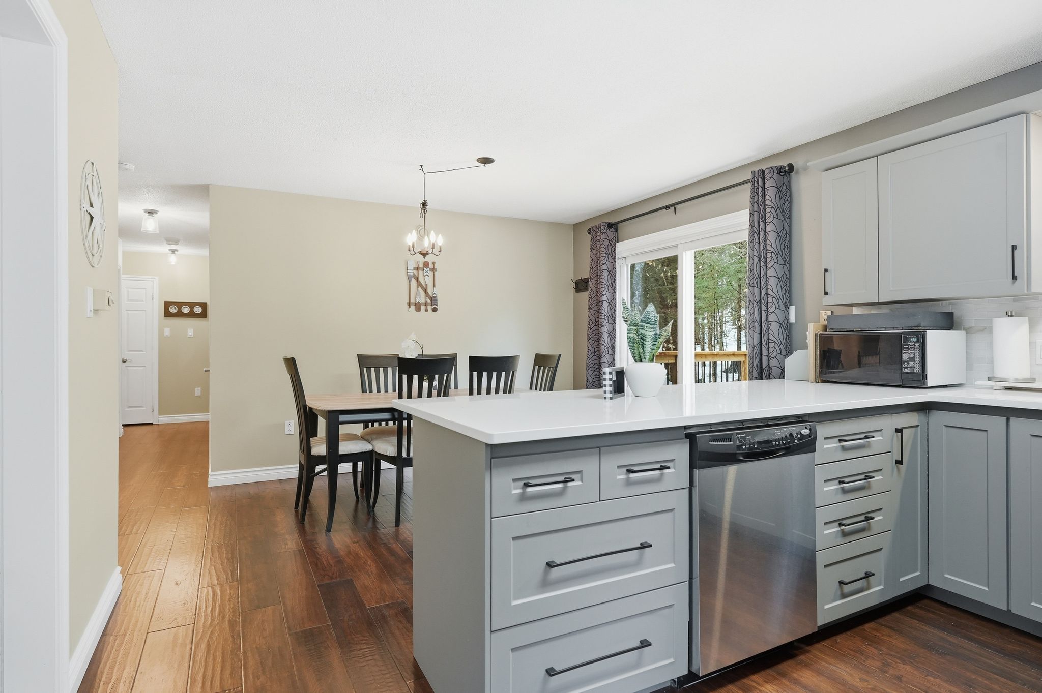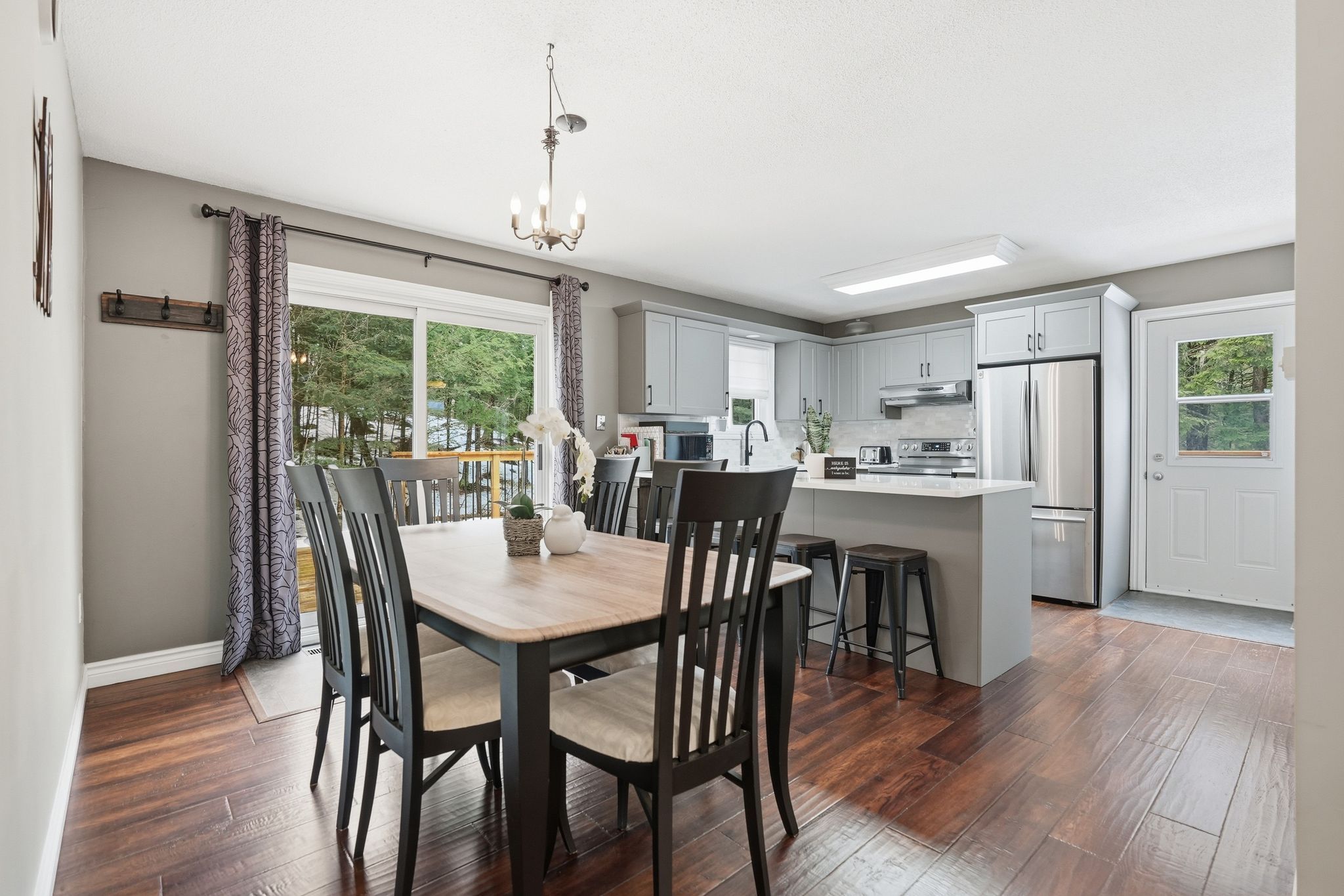 Tucked into the natural beauty of muskoka, this impeccably kept country bungalow offers the perfect blend of everyday comfort and year-round adventure. Lovingly maintained and thoughtfully updated, the home features a refurbished kitchen with timeless yet on-trend cabinetry, quartz countertops, and a welcoming breakfast bar-perfect for slow mornings or casual entertaining. The dining area walks out to a newly installed, generously sized deck, ready for summer bbqs, evening gatherings, and peaceful morning coffee surrounded by nature. The light-filled living room creates a warm and inviting space to unwind, while engineered hardwood flooring flows seamlessly throughout the main level. Here you'll find three comfortable bedrooms and a well-appointed full bath ideal for families or those looking for easy one-level living. Downstairs, the fully finished lower level offers impressive extra high ceilings and large windows that bring in natural light making it feel anything but below grade. With two additional bedrooms, a full bath, and a spacious rec room anchored by a cozy corner wood stove, it's the perfect setup for guests, extended family, or a blended household. A brand new septic system adds peace of mind, while the location truly shines for those who love the outdoors. Just minutes to lake vernon access for a refreshing swim or a quiet cast of the line, and only two minutes to the marina where you can rent a boat slip and explore the sought after four-lake chain. Snowmobile trails are nearby, making winter just as exciting as summer. Whether you're looking for a full-time home or a muskoka retreat, this property brings together comfort, style, and the lifestyle you've been waiting for.