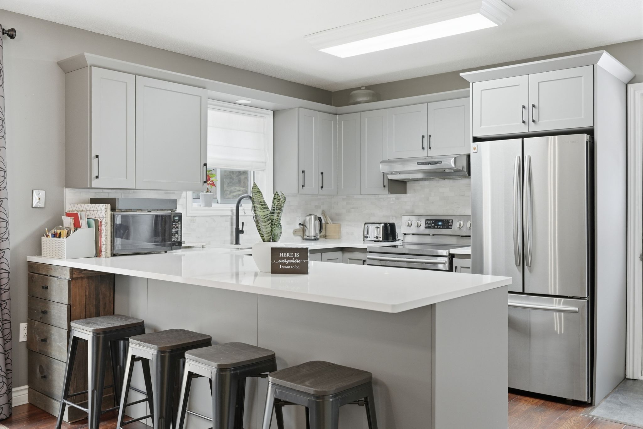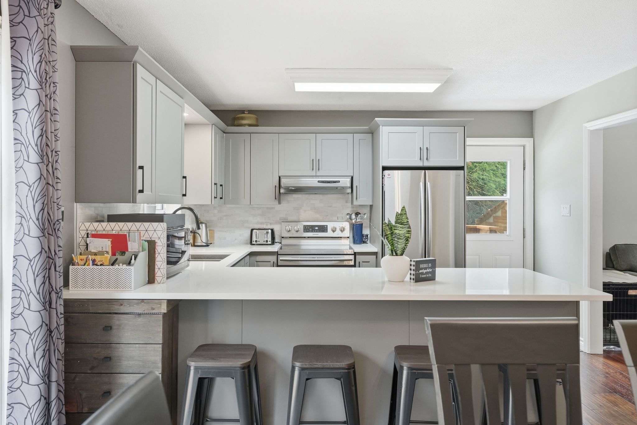 • Refurbished kitchen with quartz countertops and a breakfast bar for casual dining.