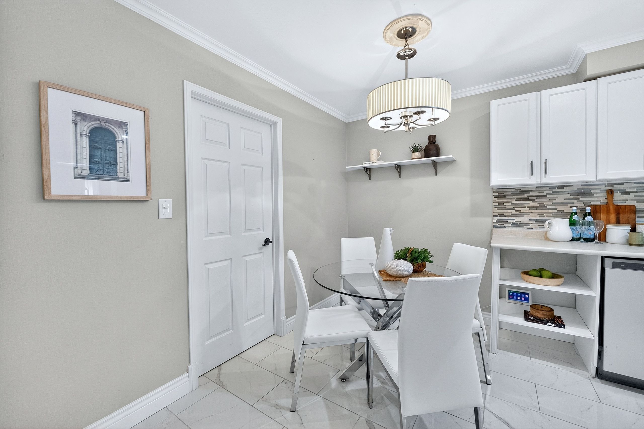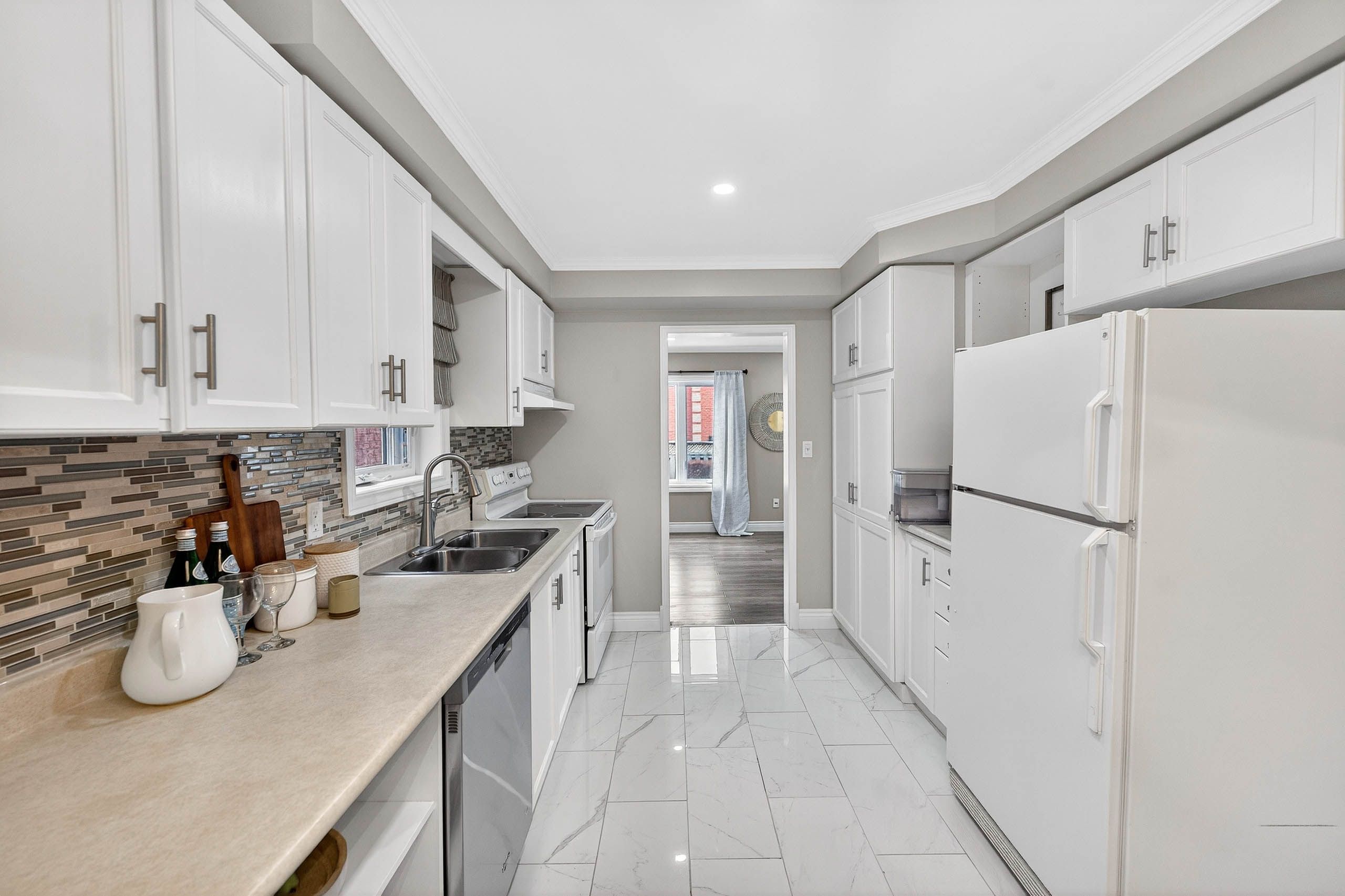 • Eat-in kitchen equipped with built-in pantry and modern appliances.