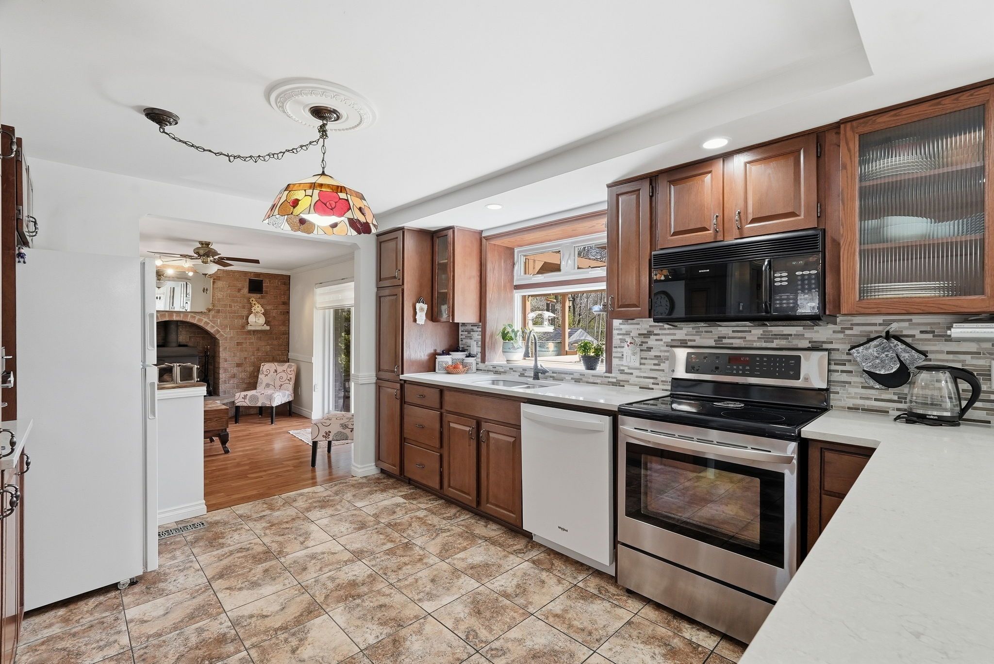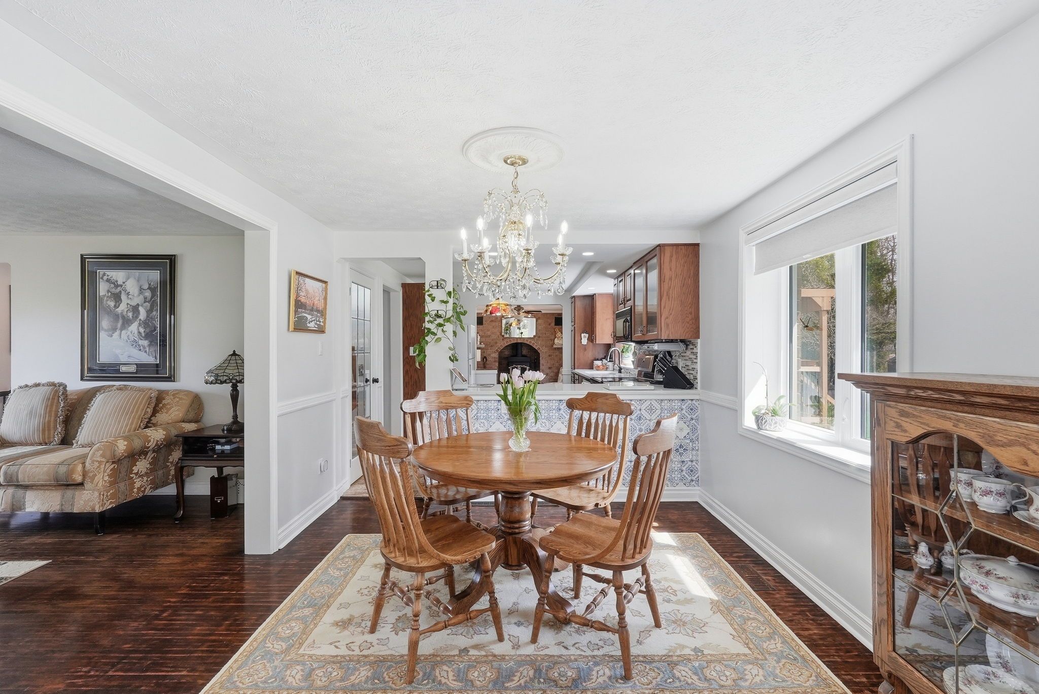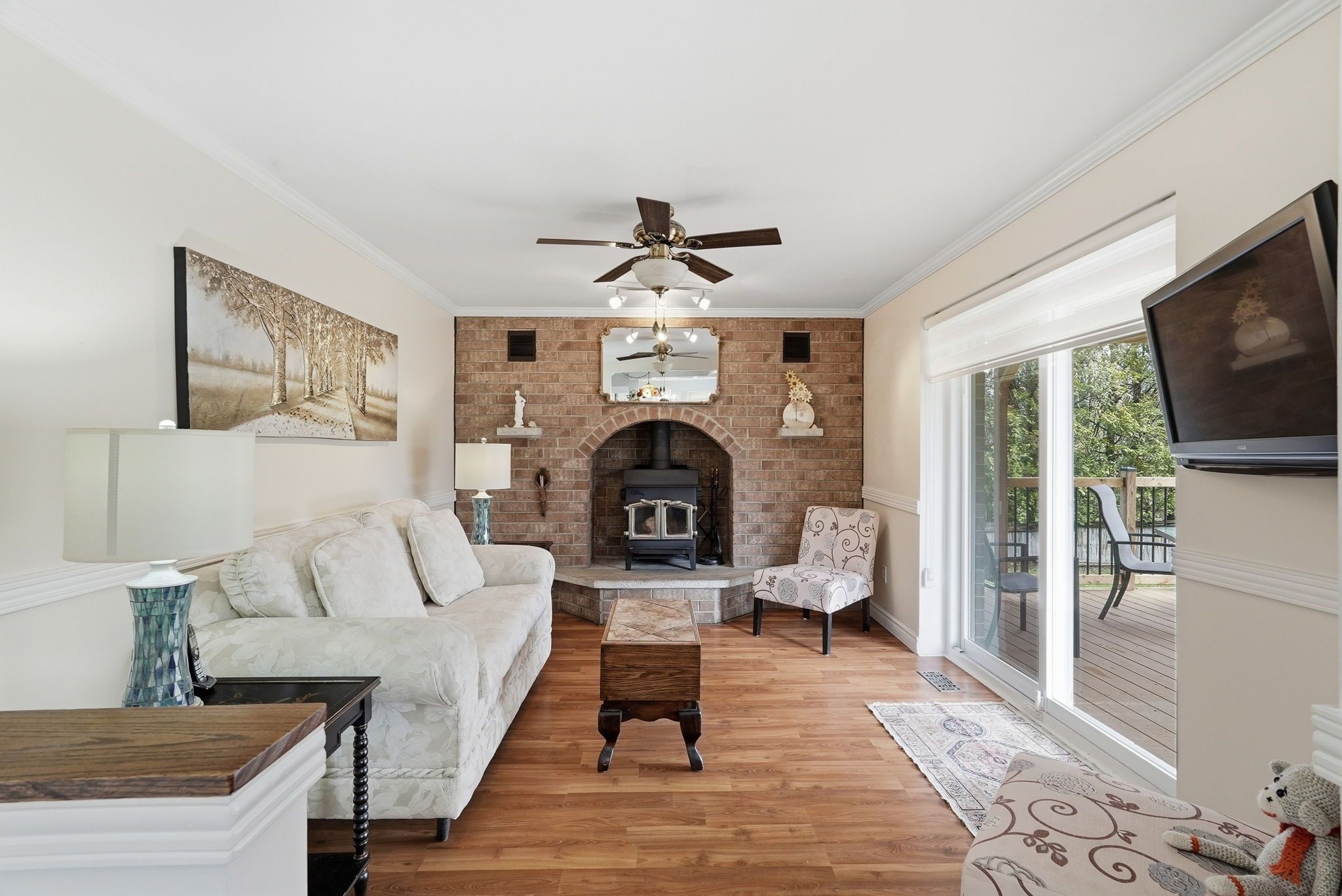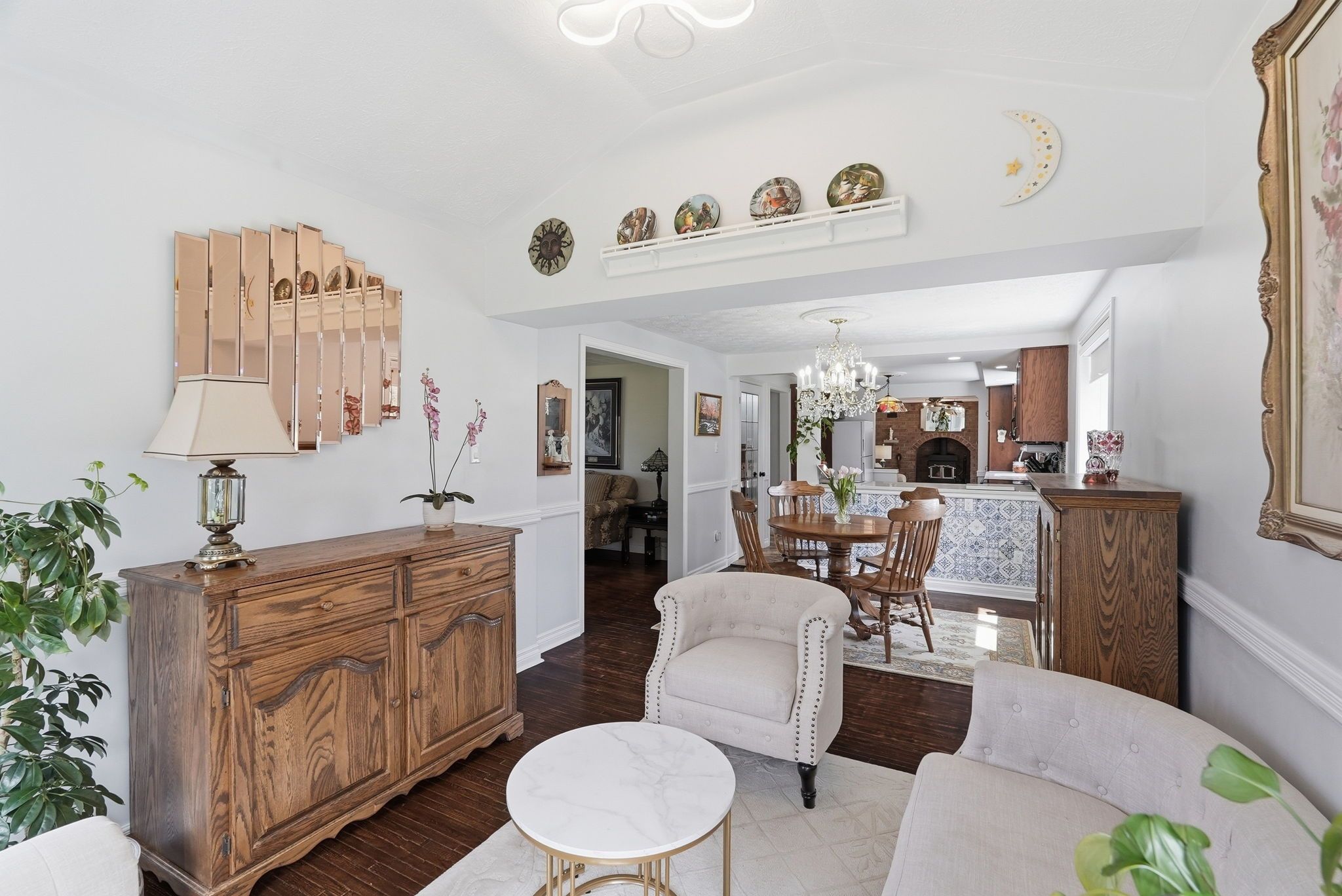• Spacious main floor with multiple sitting areas and a wood-burning fireplace.