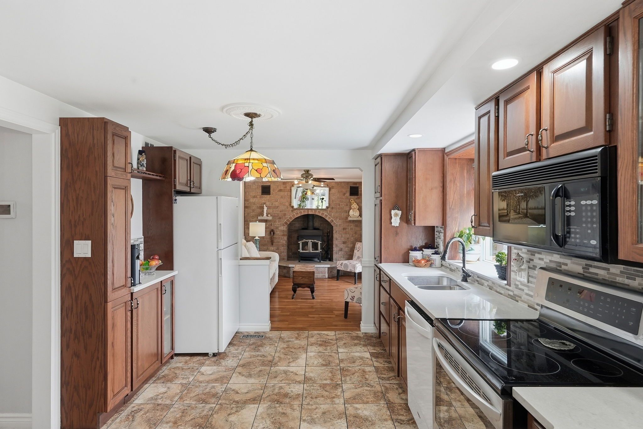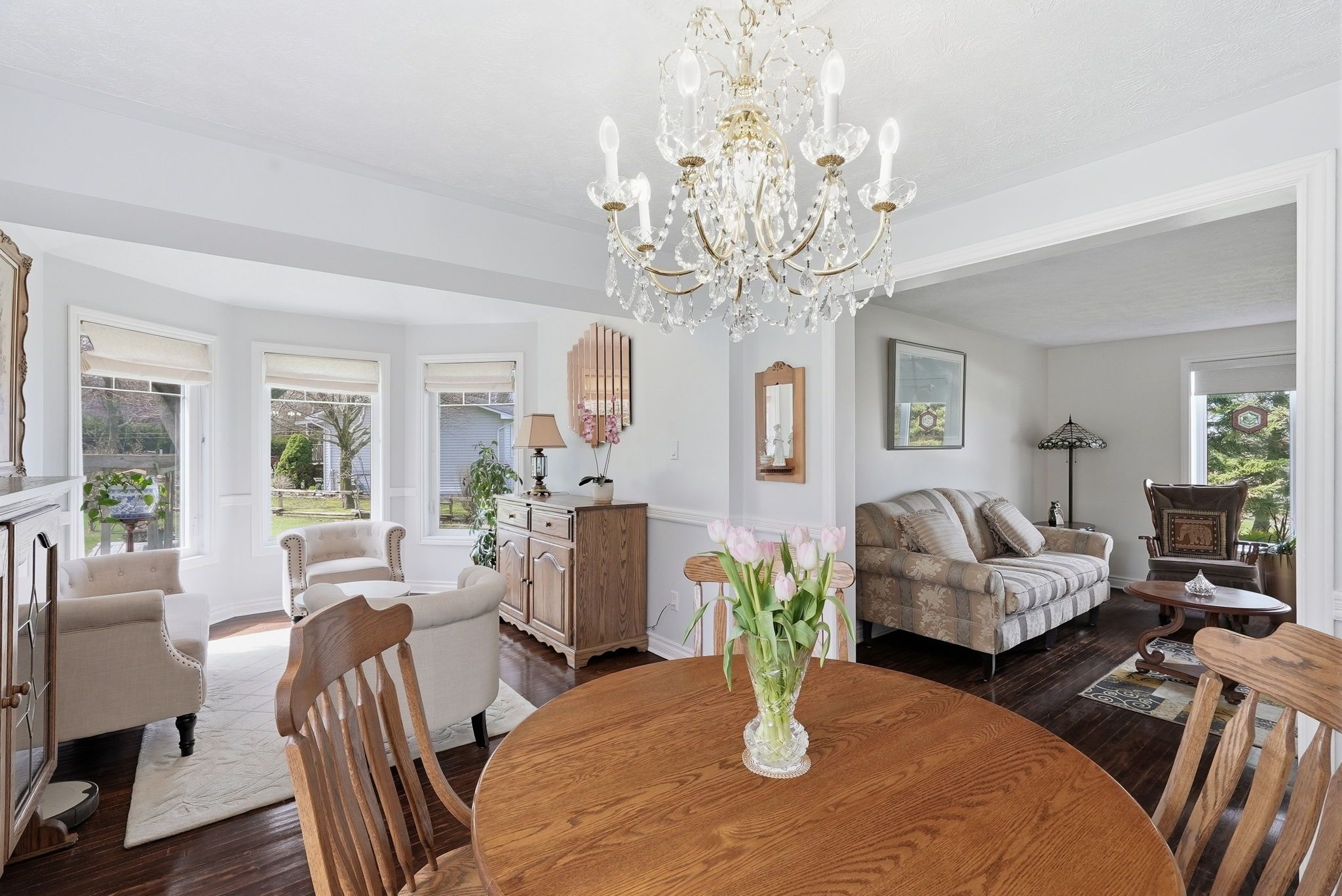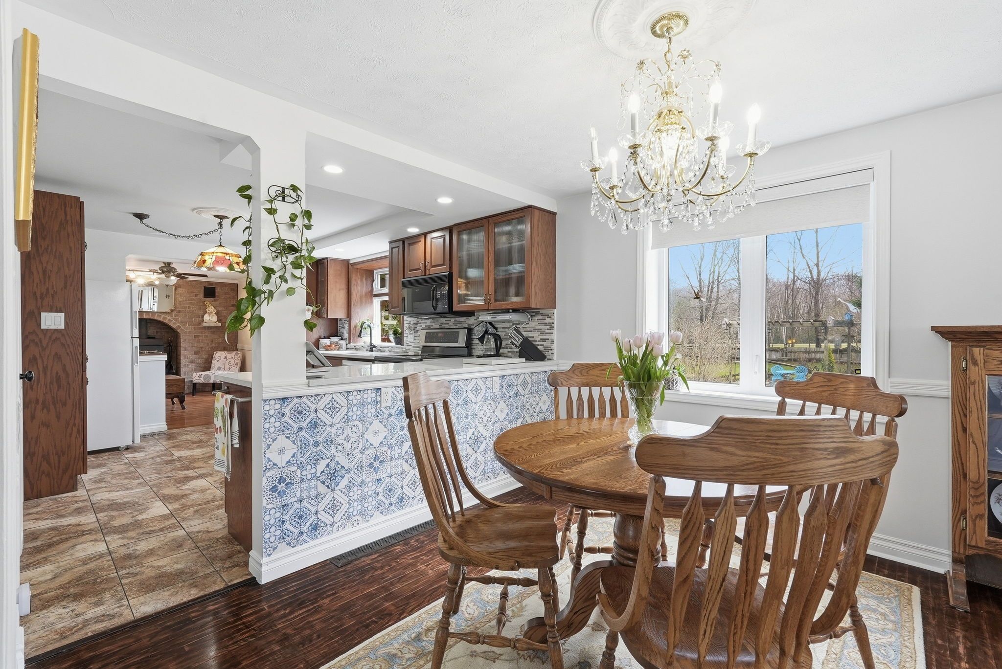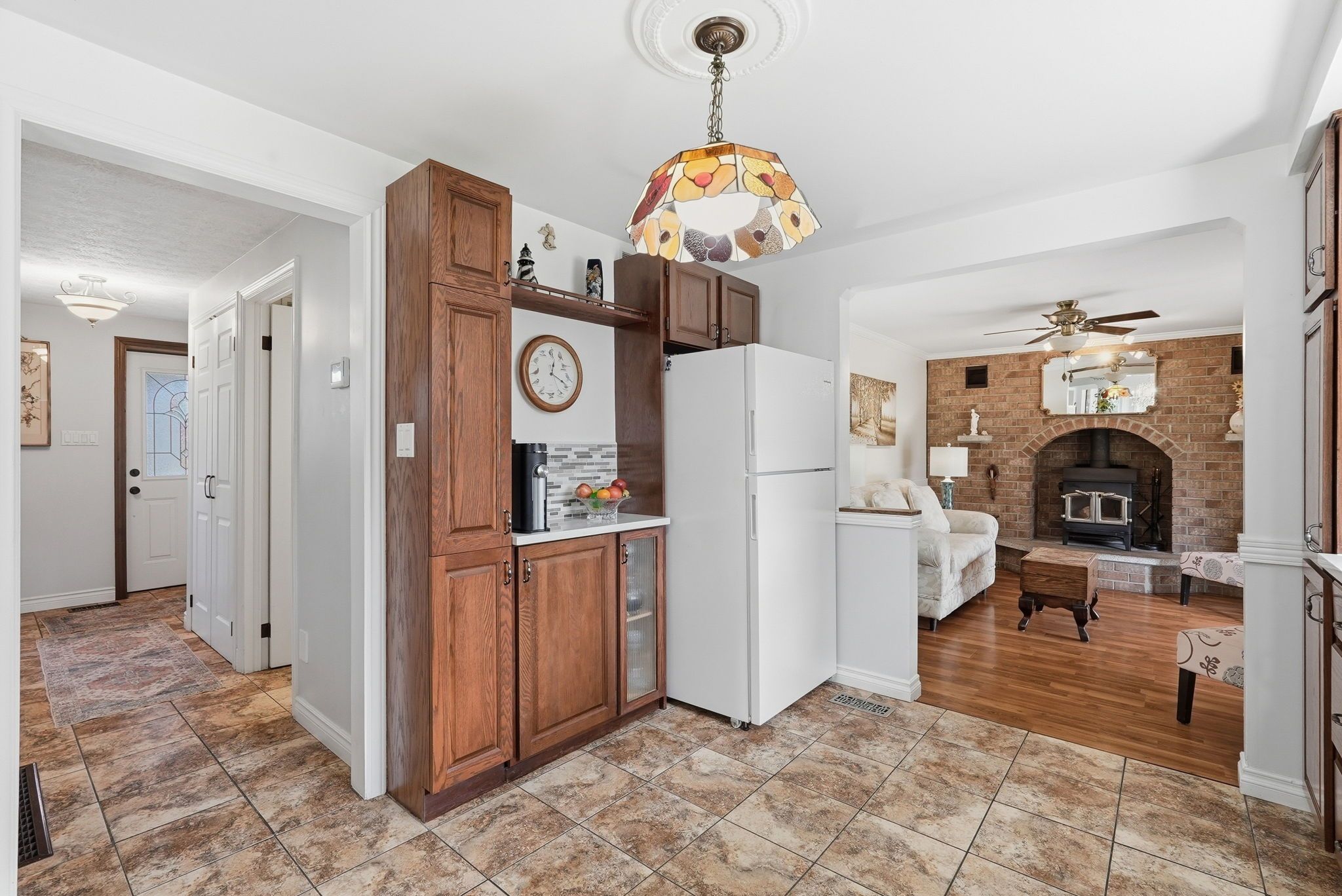 • Spacious main floor with multiple sitting areas and a wood-burning fireplace.