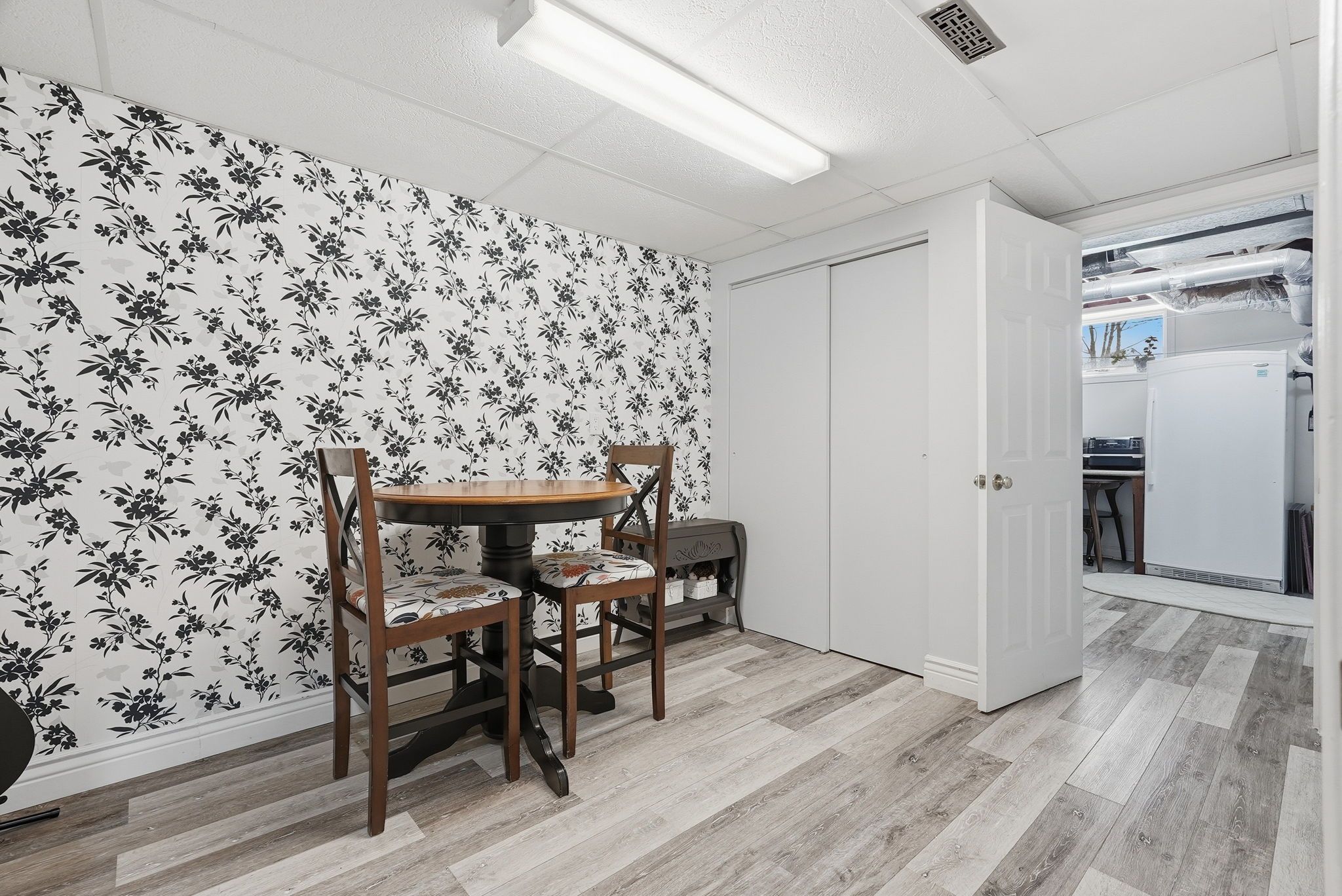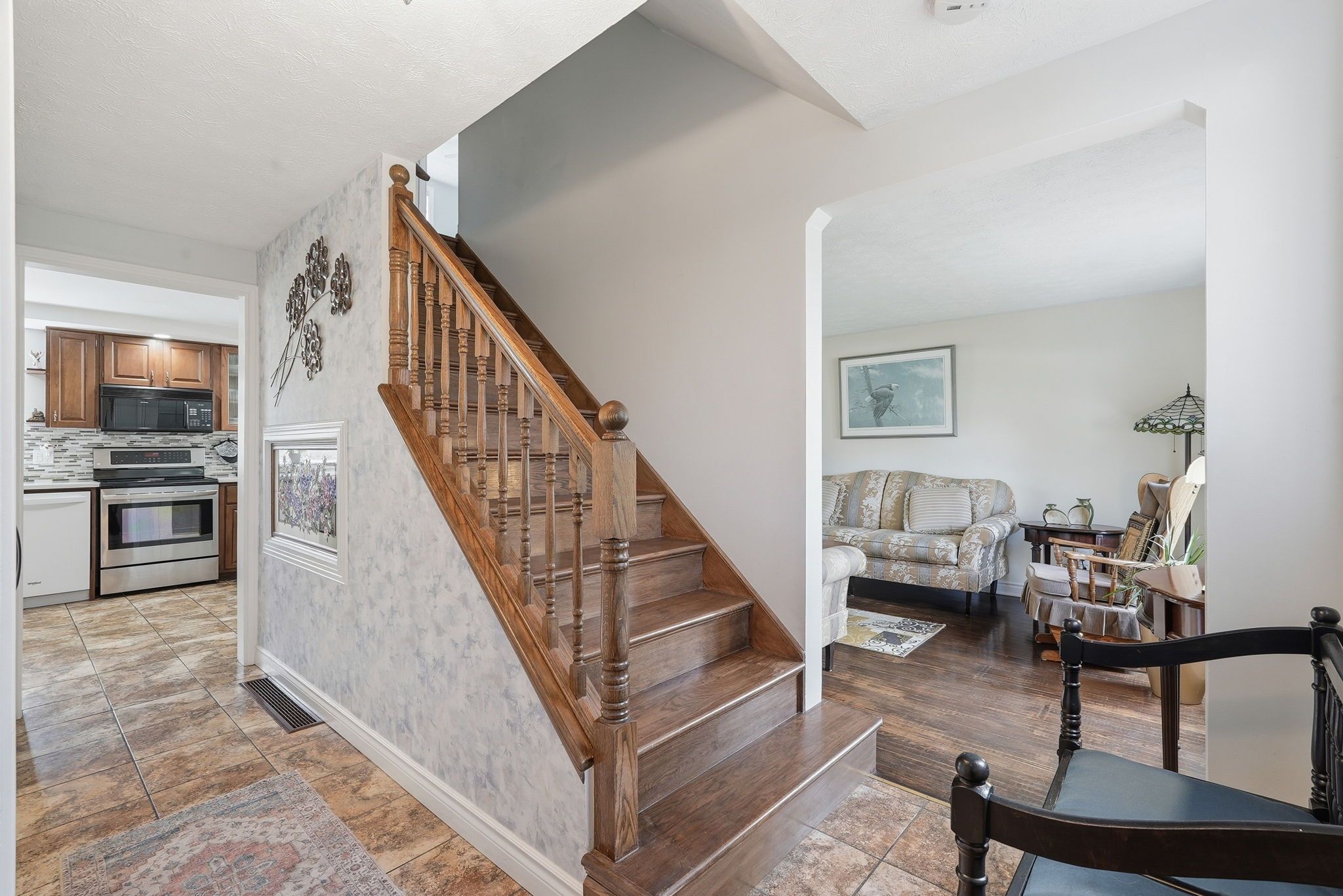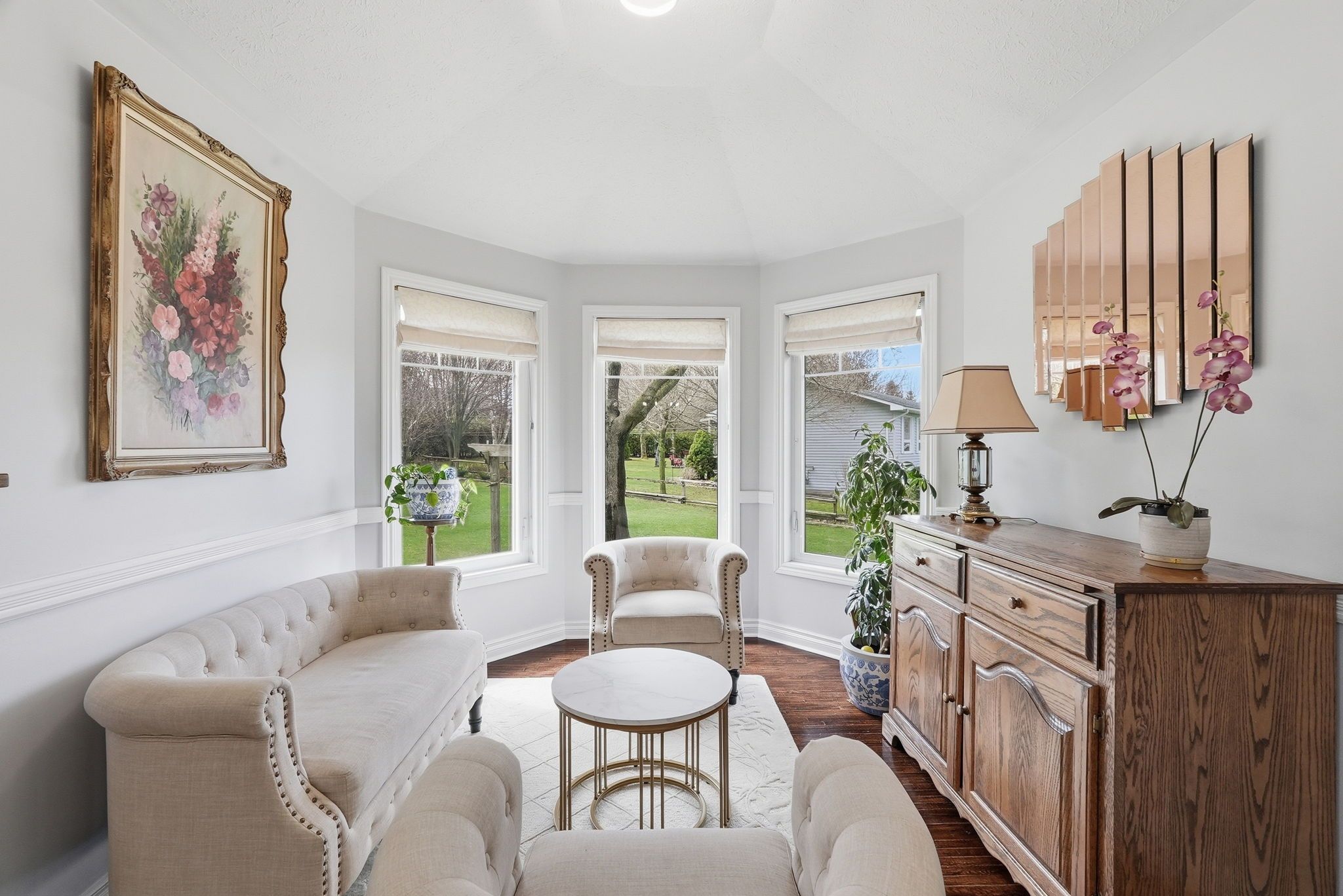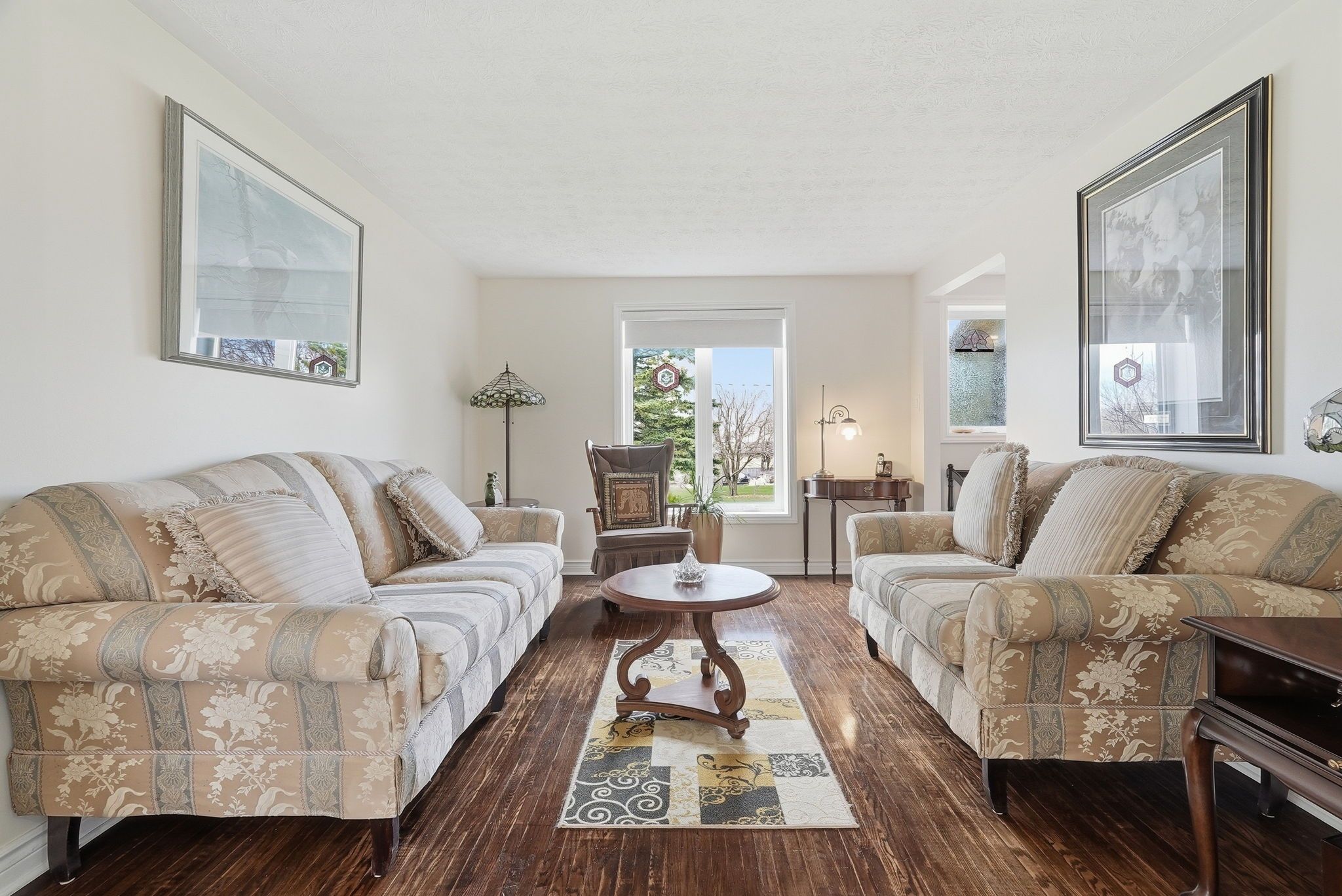 • Spacious main floor with multiple sitting areas and a wood-burning fireplace.