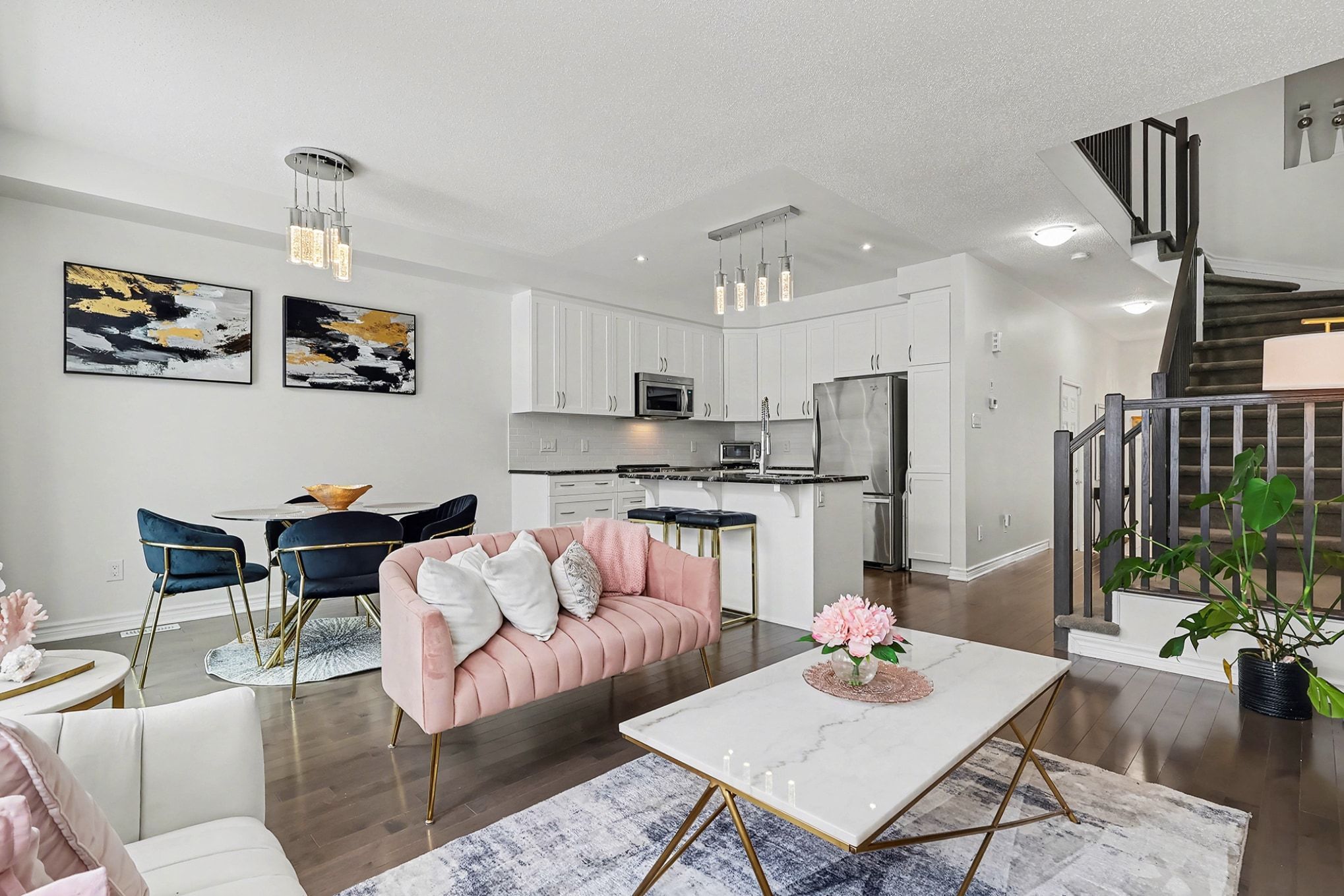 • Open main floor layout with 9 ft ceilings and large windows for natural light.
