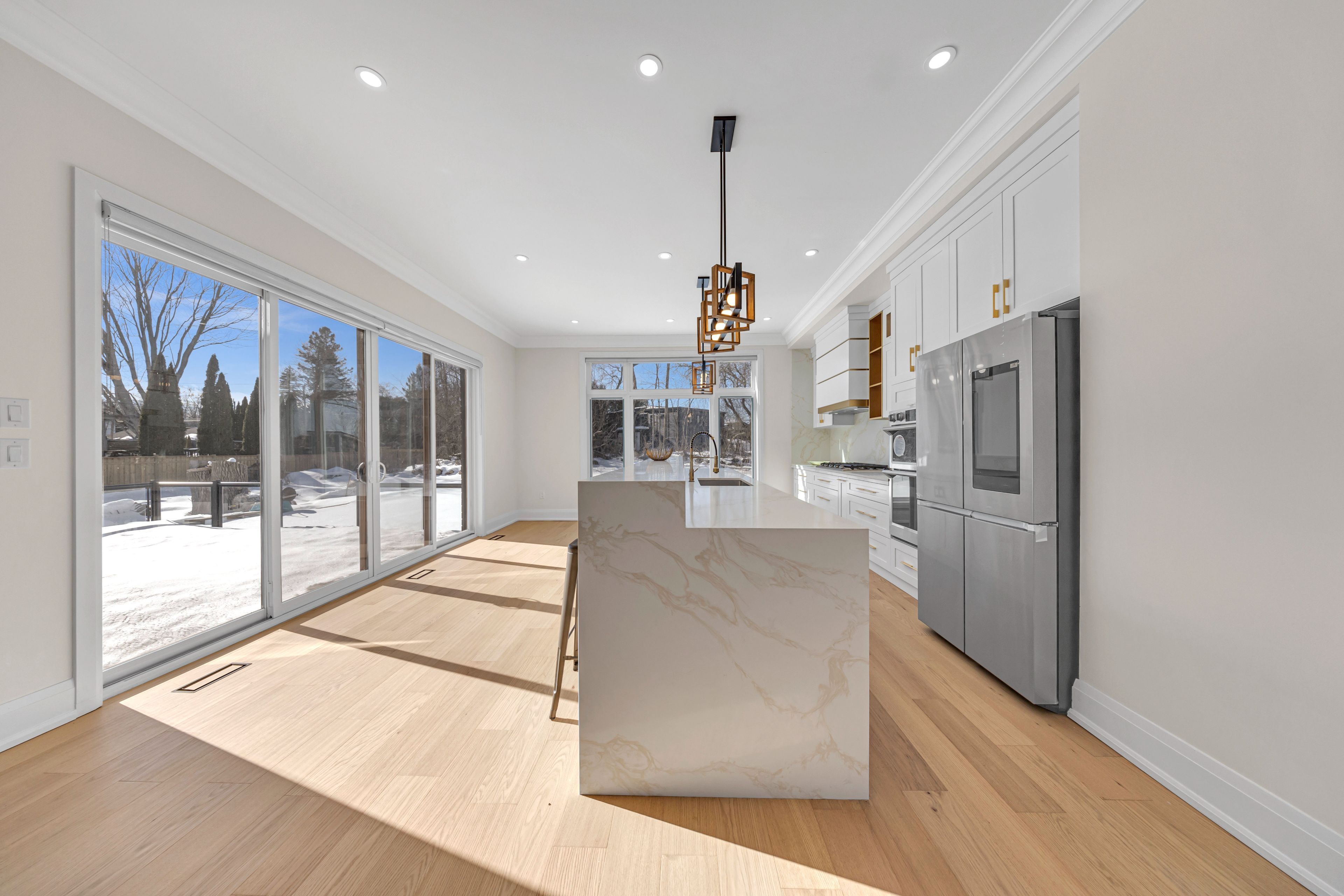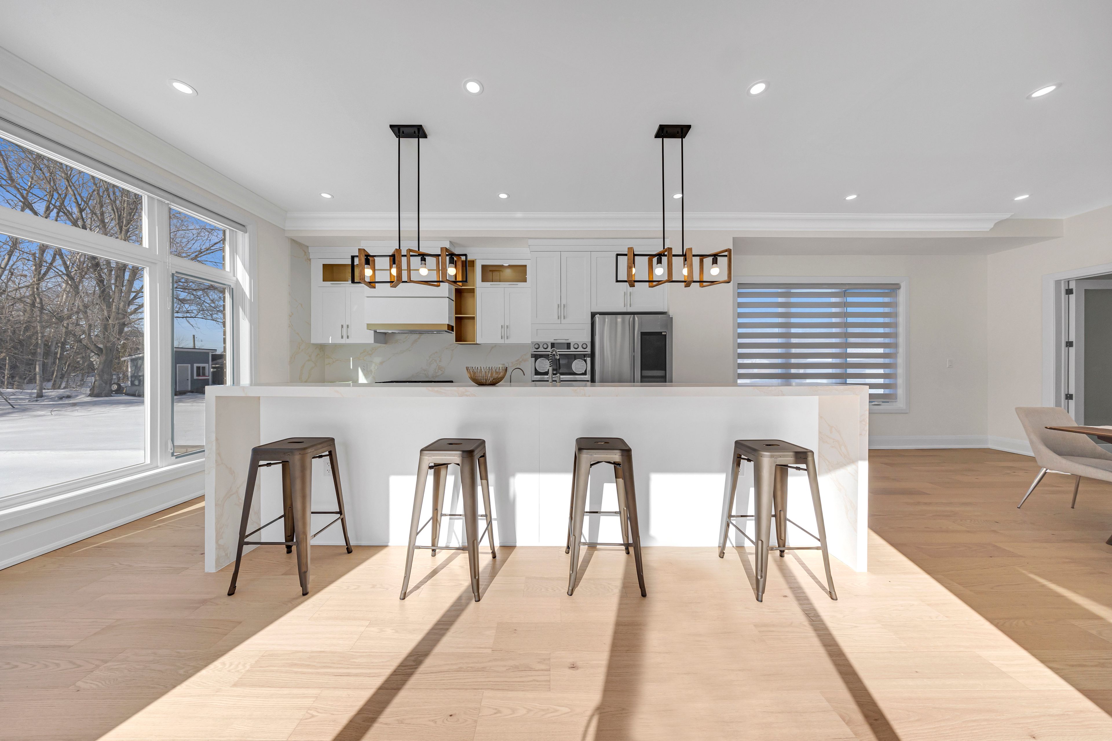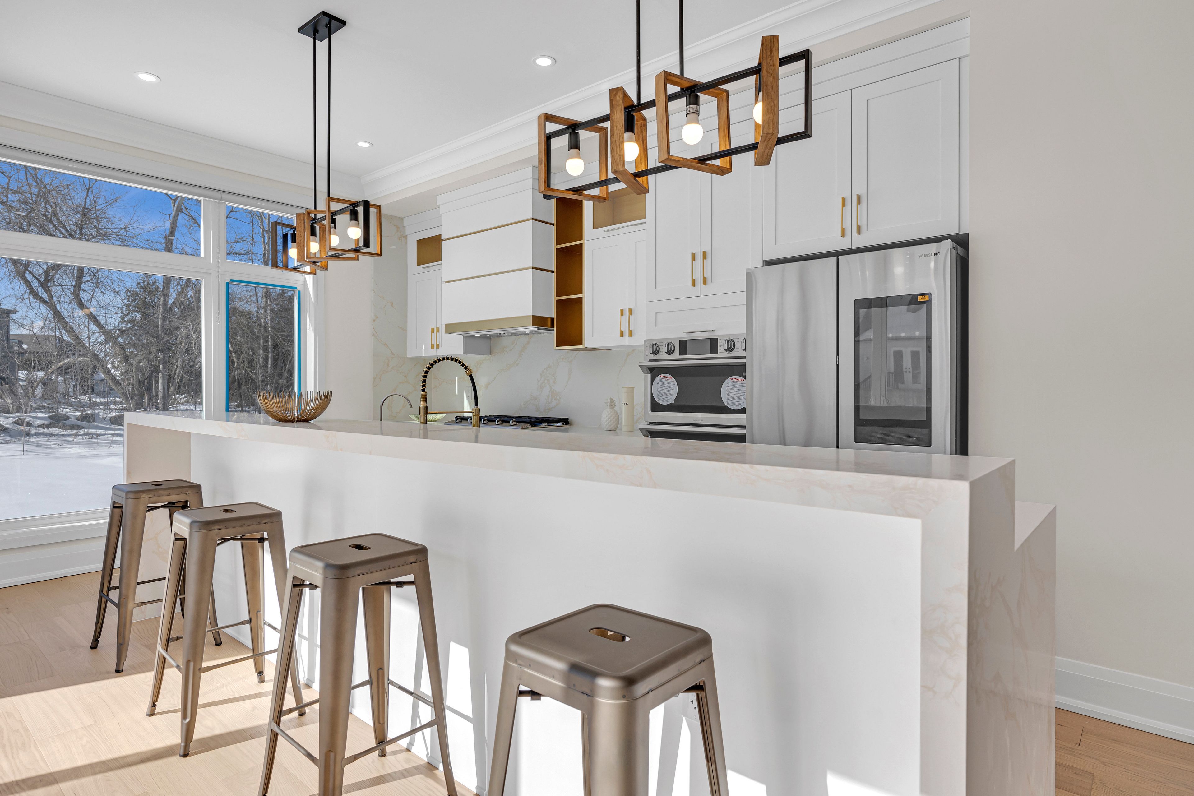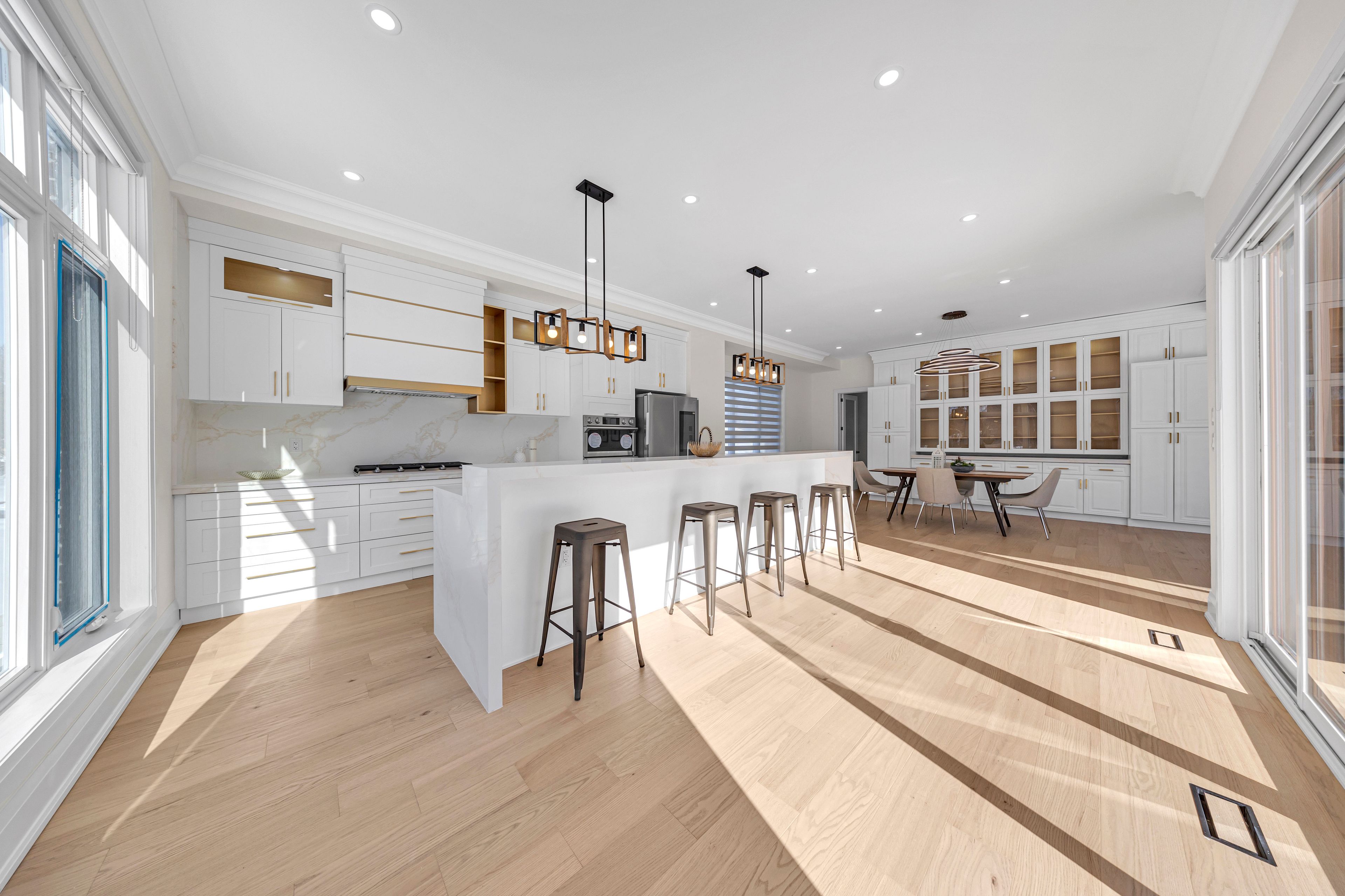 • Gourmet kitchen with a waterfall island and designed bar area.