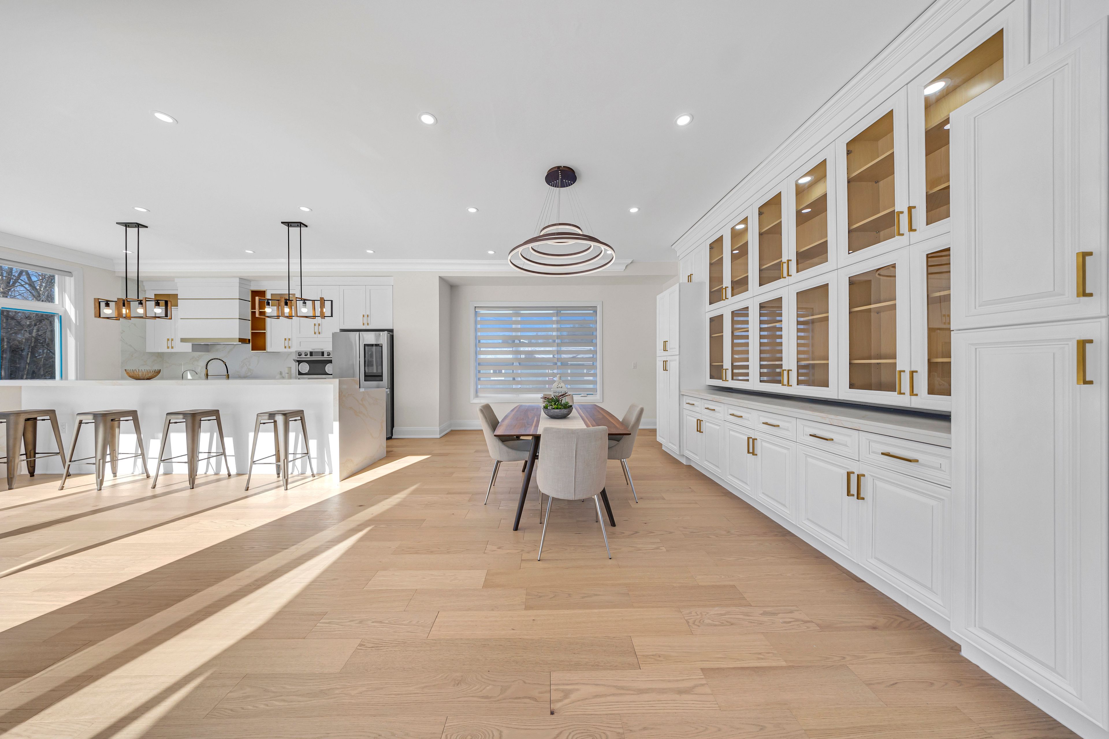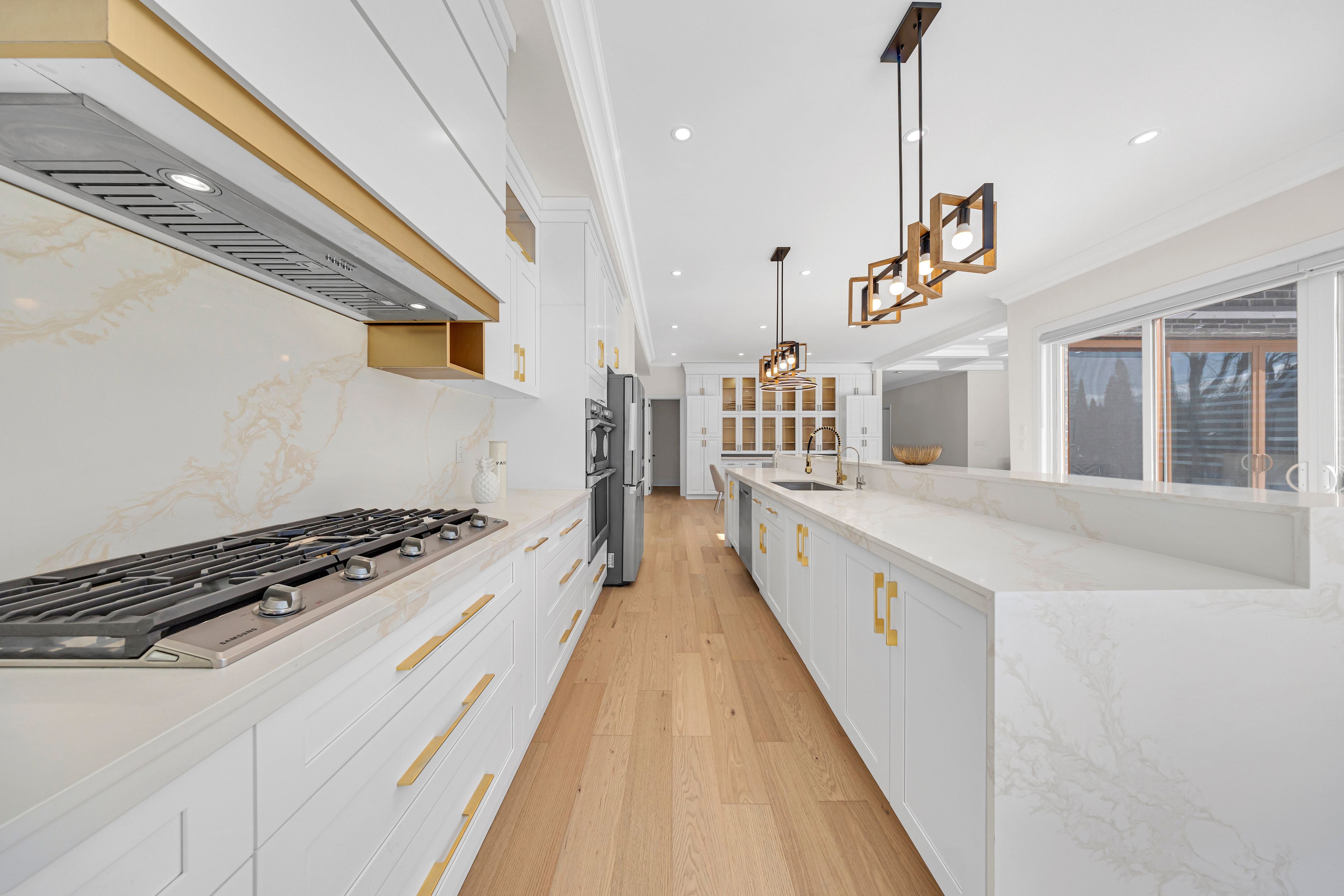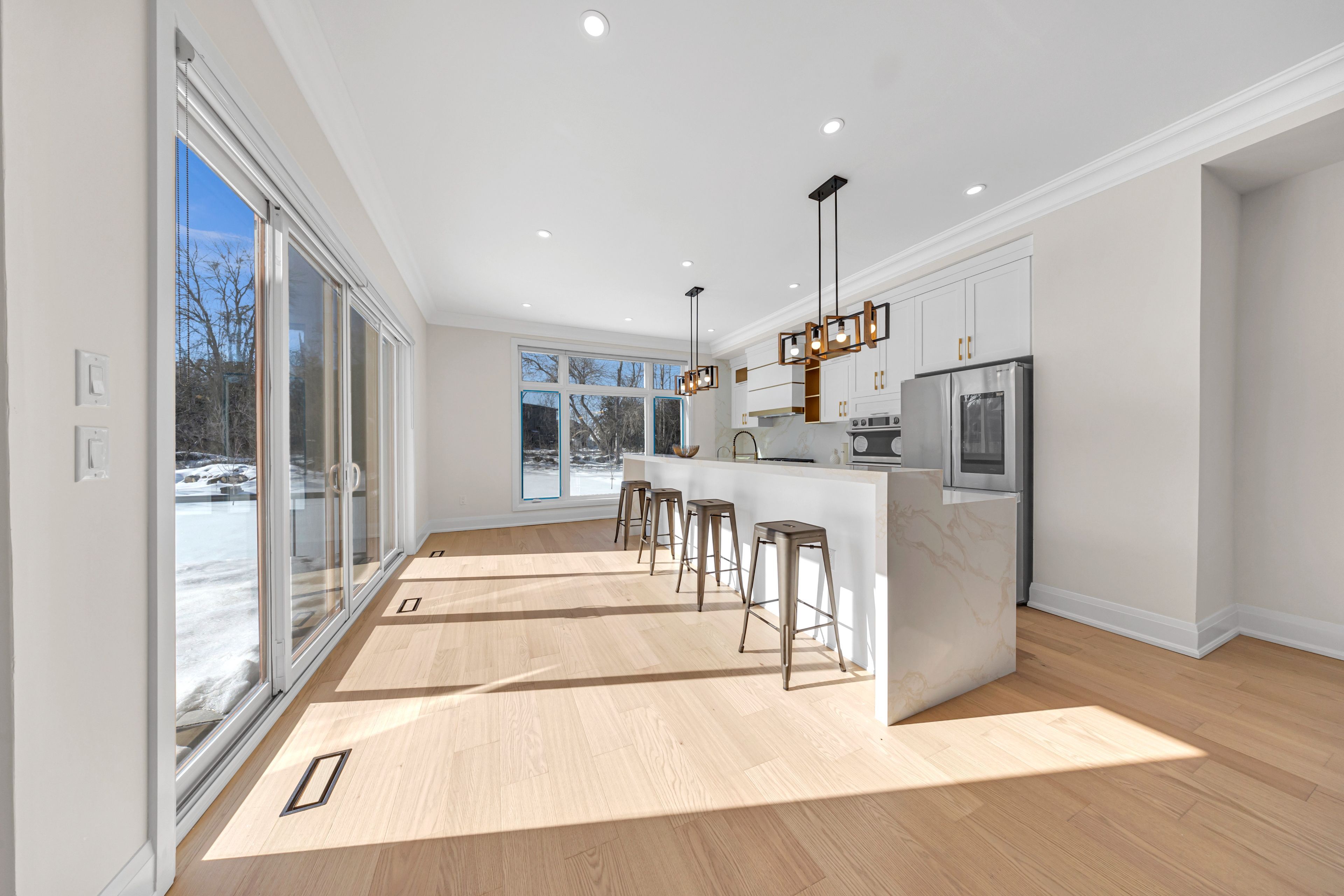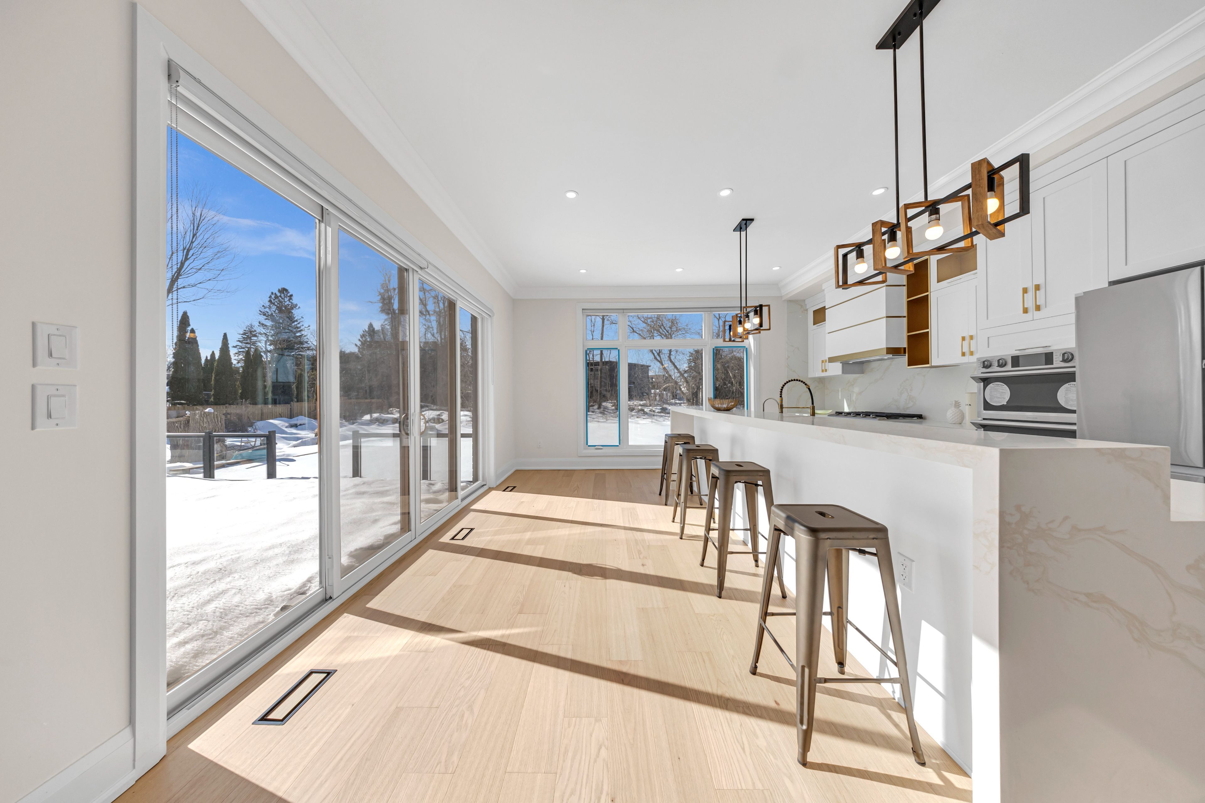 • Gourmet kitchen with a waterfall island and designed bar area.