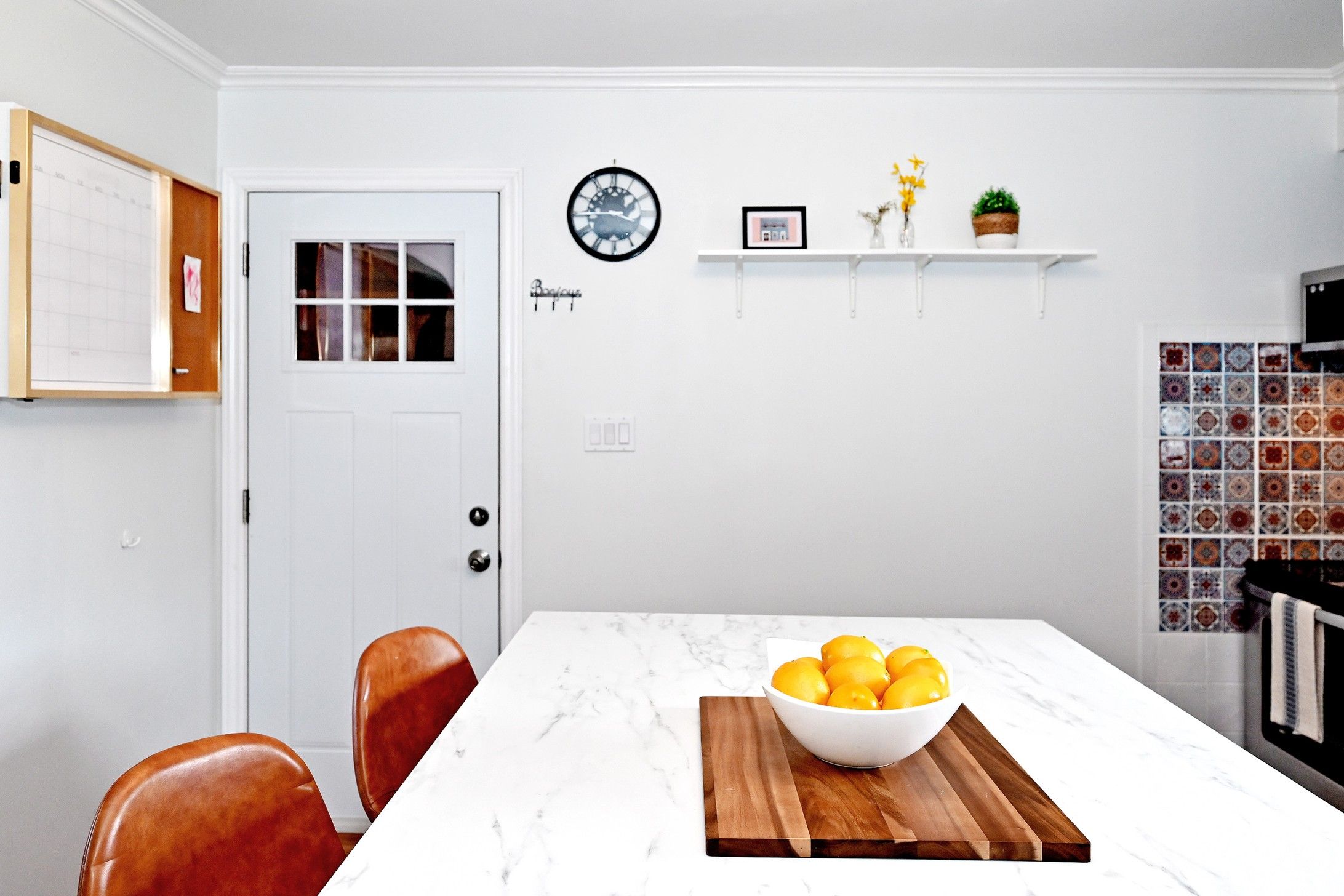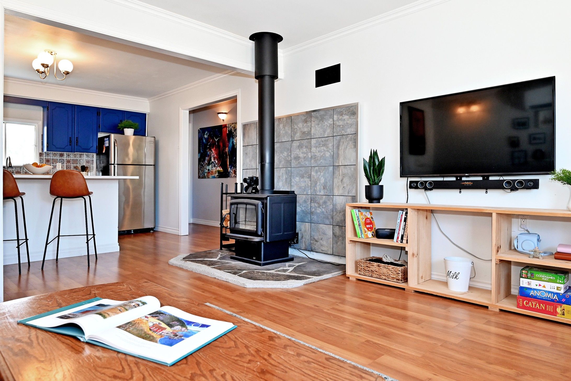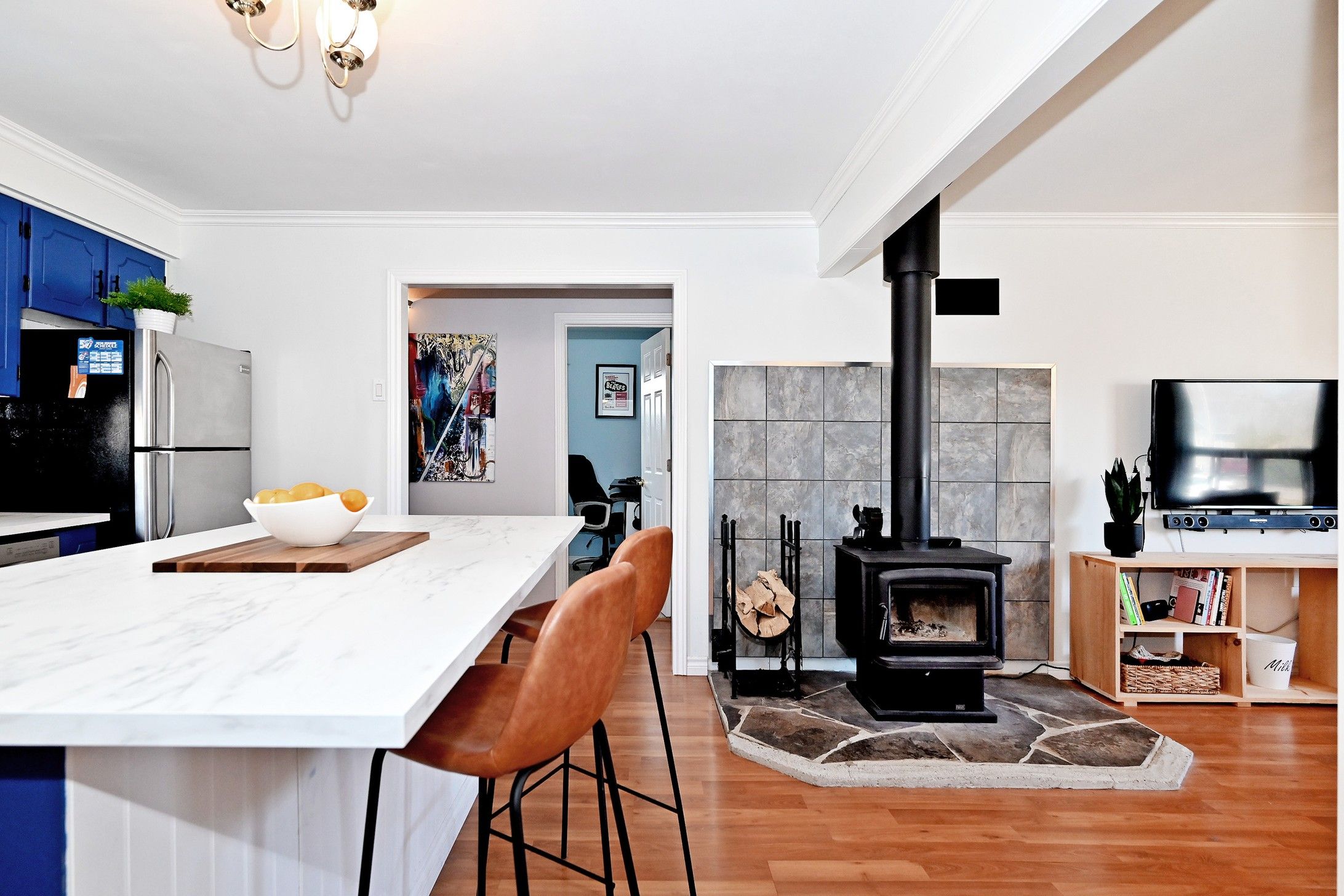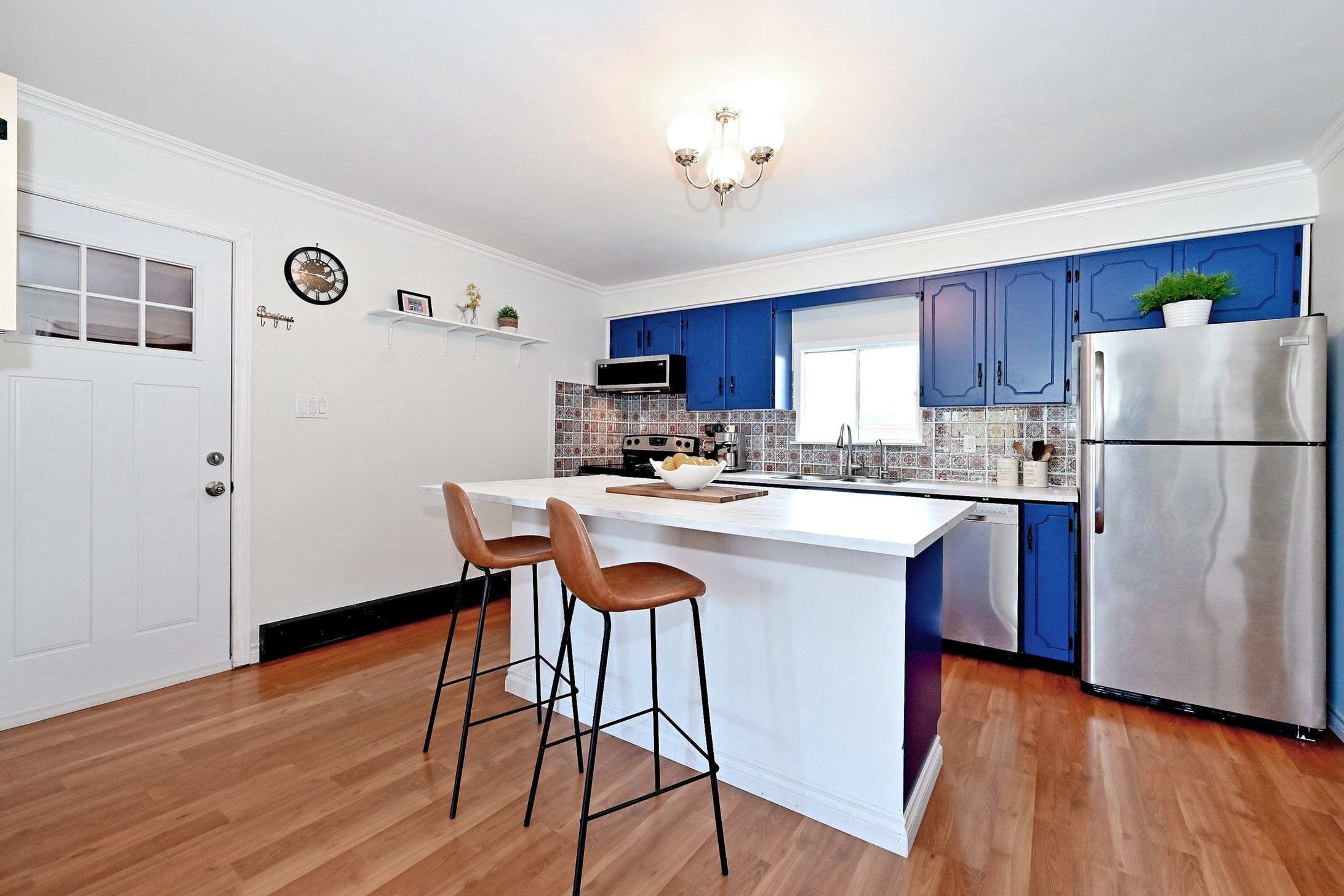 • Open-concept kitchen with stylish backsplash and stainless steel appliances.