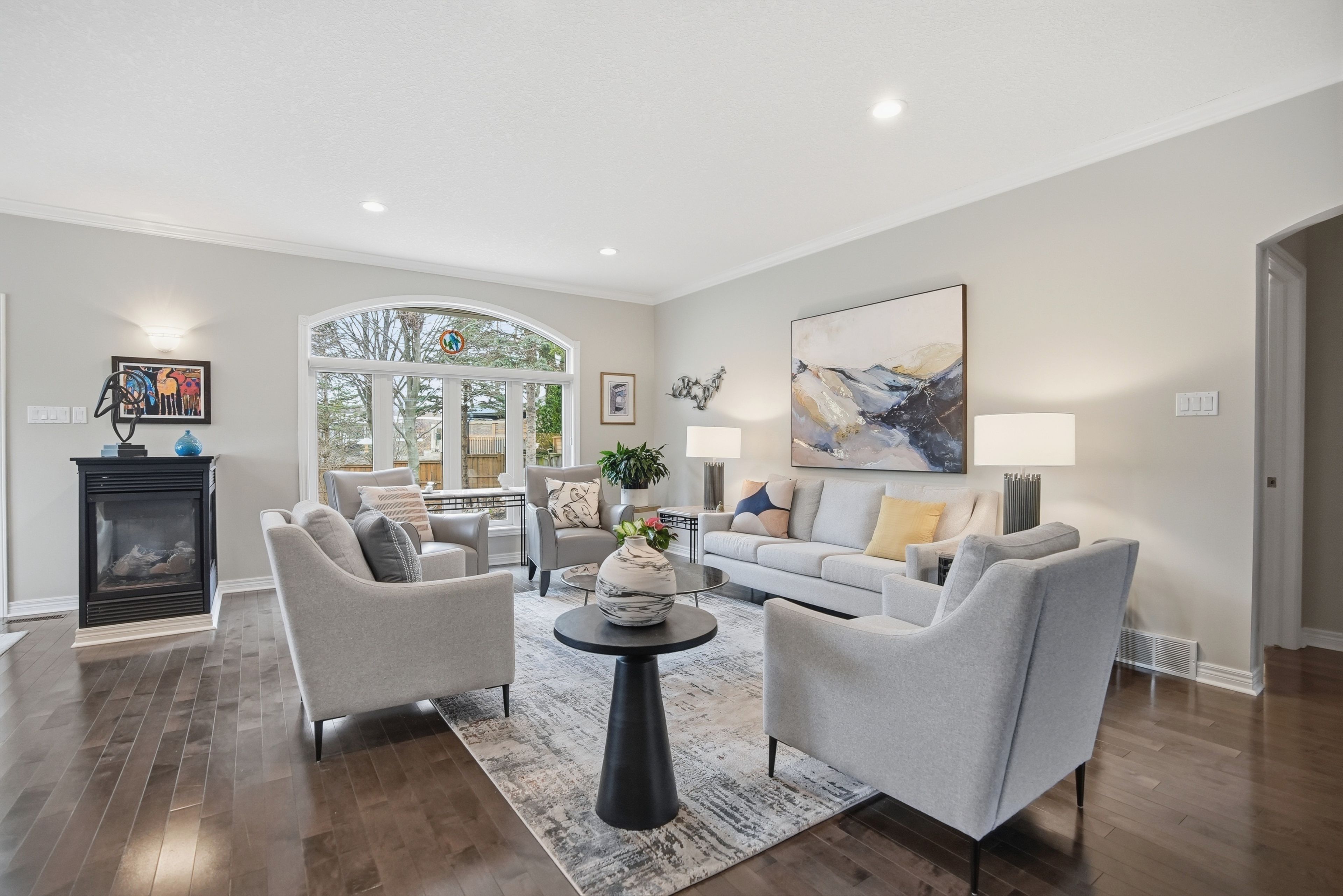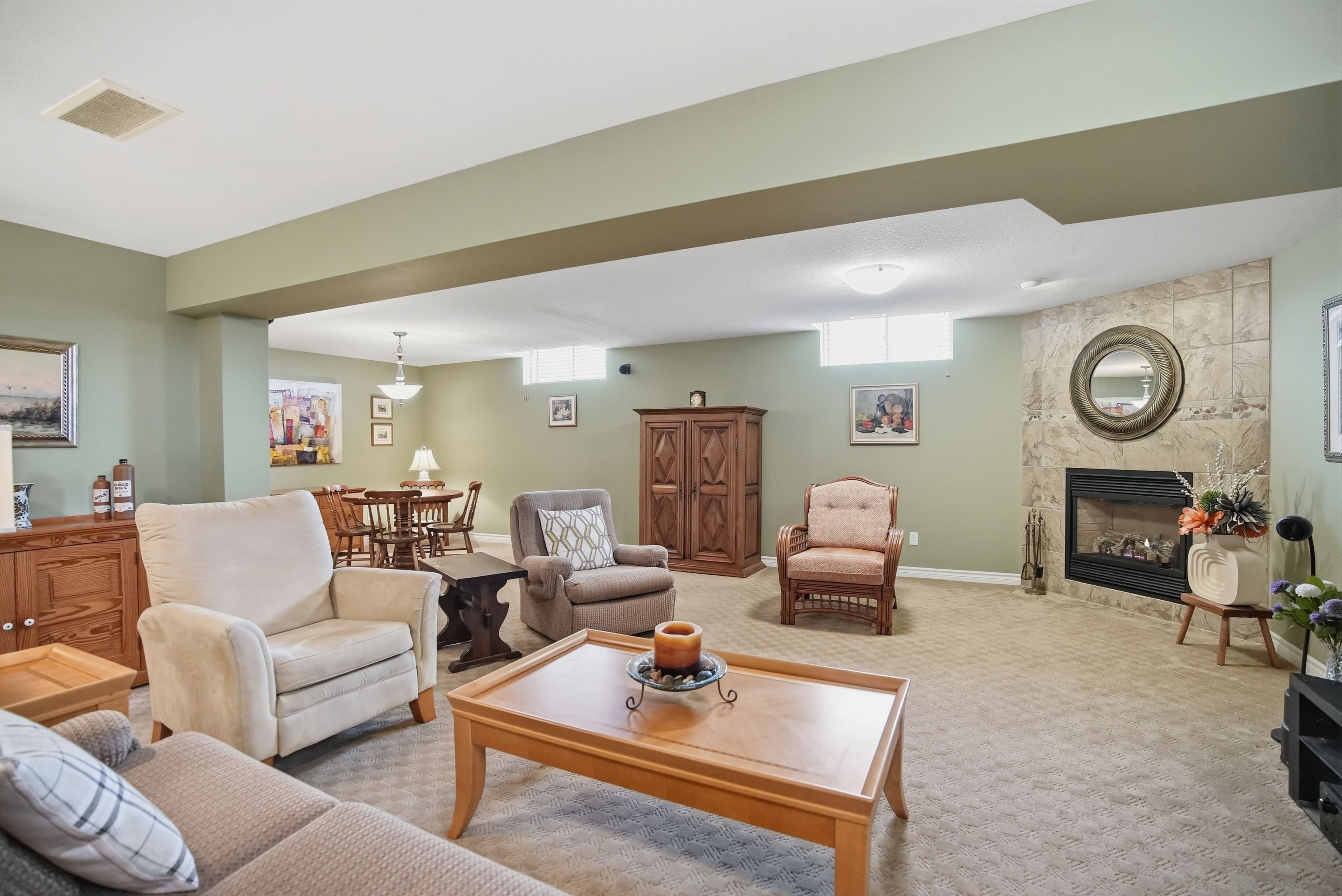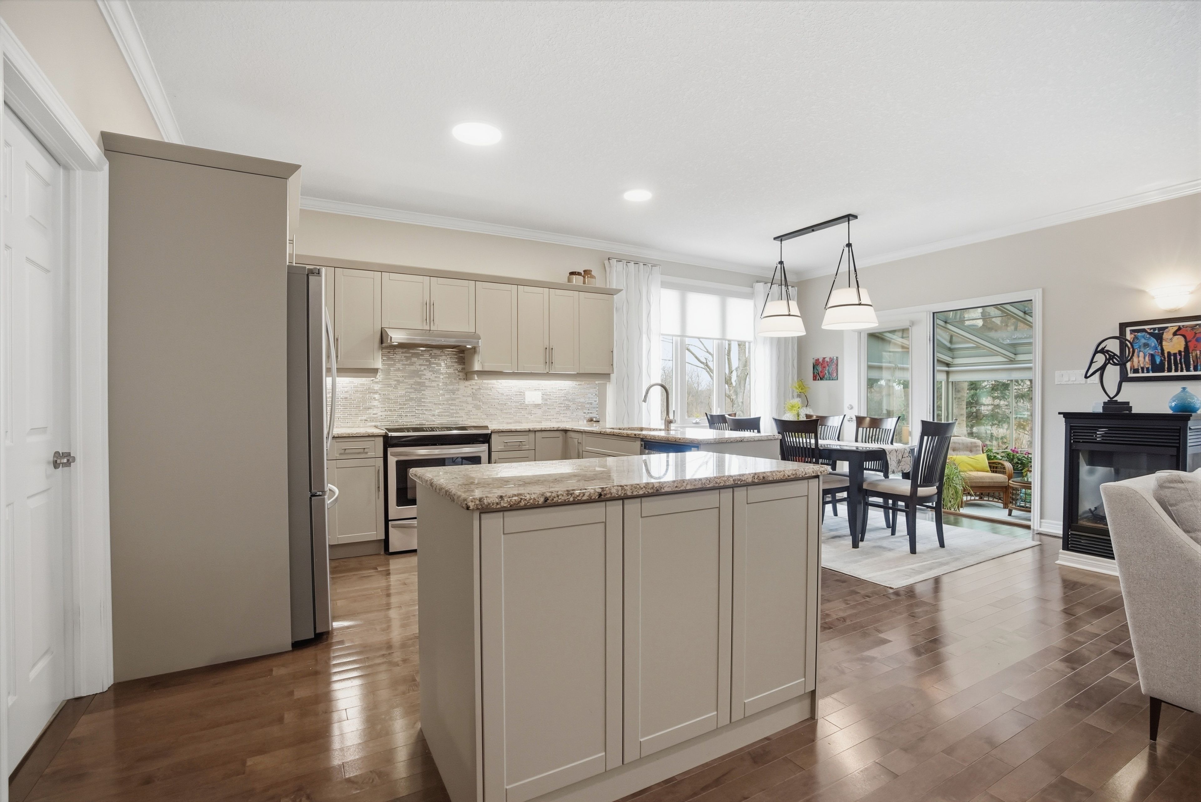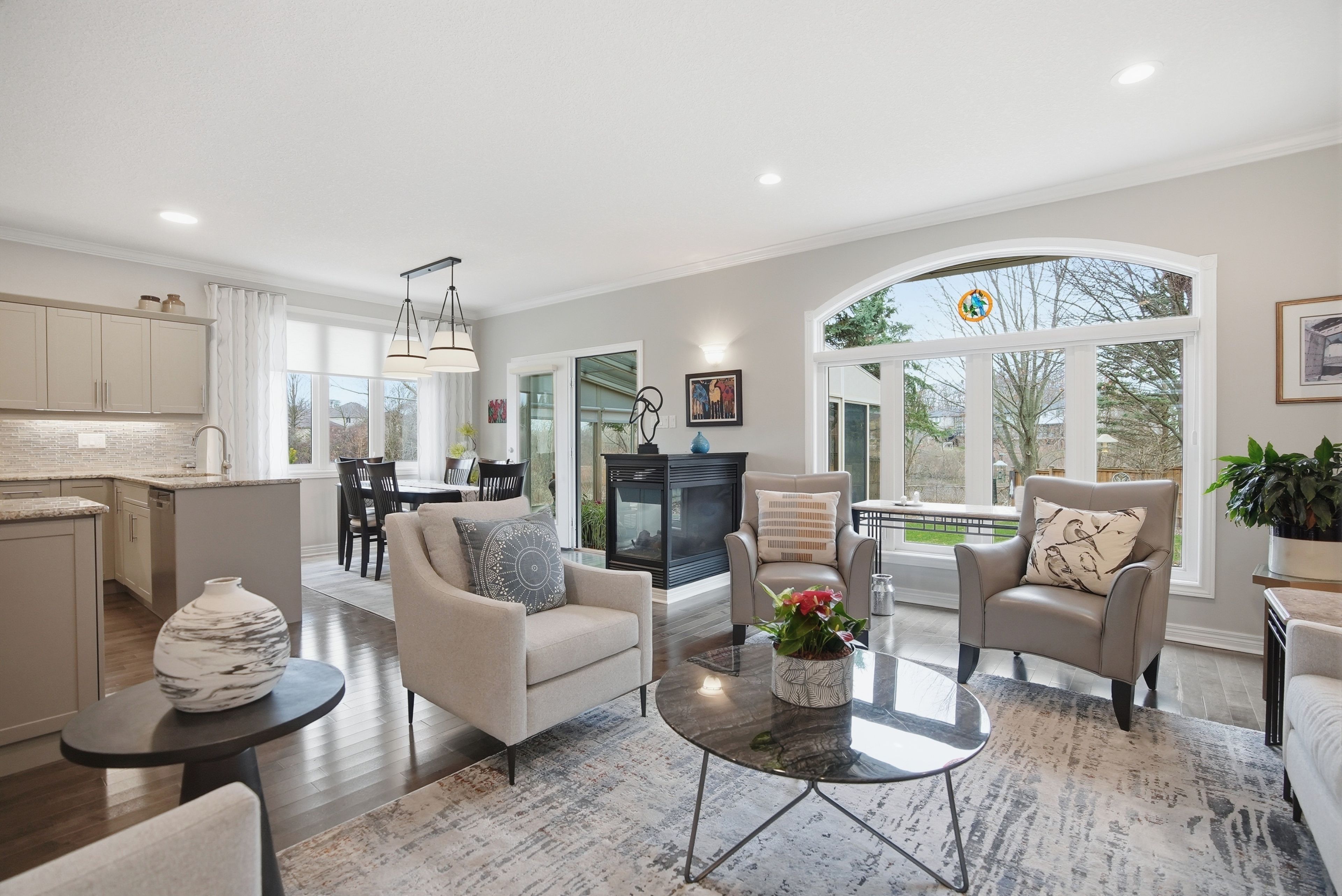 Welcome to this rare 2+2 bedroom open-concept bungalow - a true unicorn offering the best of city and cottage living. Offered for the first time ever on the market, this beautifully maintained home showcases a bright, airy main floor with a seamless flow between the kitchen, dining, and living areas. The space is enhanced by a stylish kitchen that features an island, modern cabinetry and granite countertops. The spacious living room features stunning three-sided fireplace that adds warmth and elegance. The primary bedroom features a private ensuite bathroom and walk-in closet. Rounding out the main floor is a second bedroom, a full 4-piece bathroom, and convenient main floor laundry adds to the ease of everyday living. Many upgrades over the years have brought a fresh, modern touch throughout. The finished lower level offers two additional bedrooms, a spacious family room with a cozy gas fireplace, and a 3-piece bathroom. Escape to the sunroom addition and enjoy picturesque views of the beautifully landscaped backyard and the tranquil pond next door-your own private retreat in the heart of the city. Frequent visitors include cranes, blue herons, king fishers, geese, ducks and much more. Additional updates include a new concrete driveway and walkway (2025), a grand front door entranceway (approx. 2018), and garage man door (2026). Complete with a spacious double car garage, this exceptional home blends comfort, charm, and convenience in one truly special package.