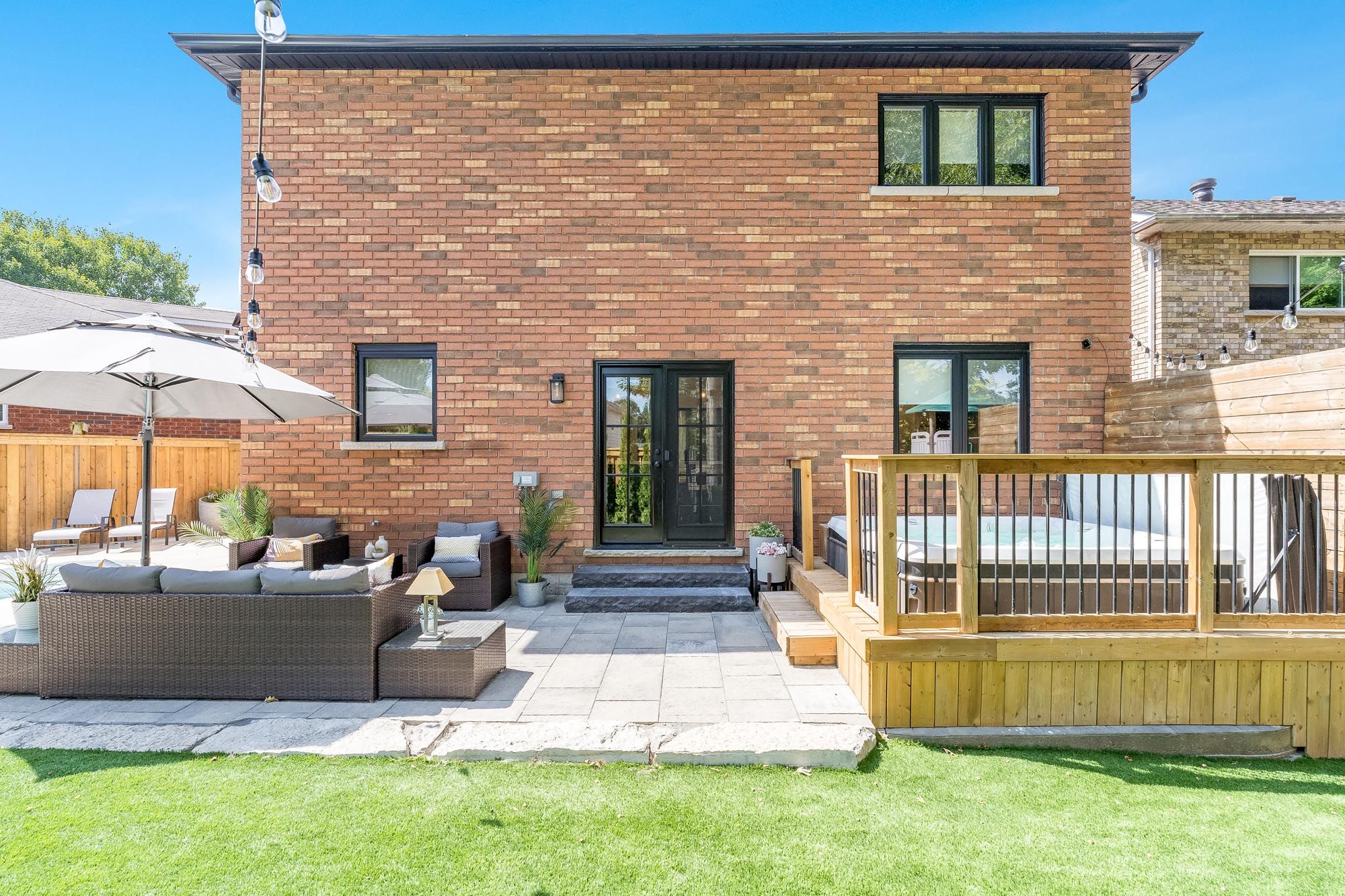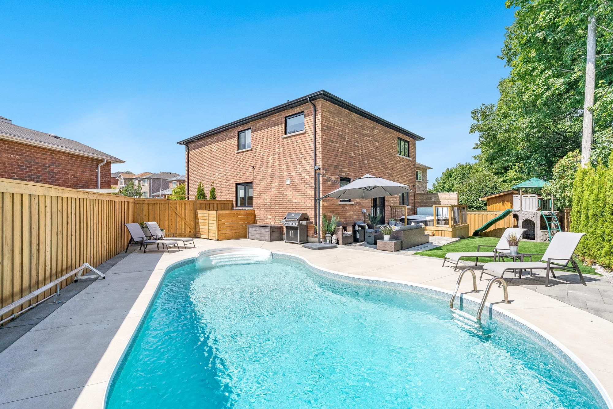 • Private backyard oasis with a patio, landscaping, and inground pool.