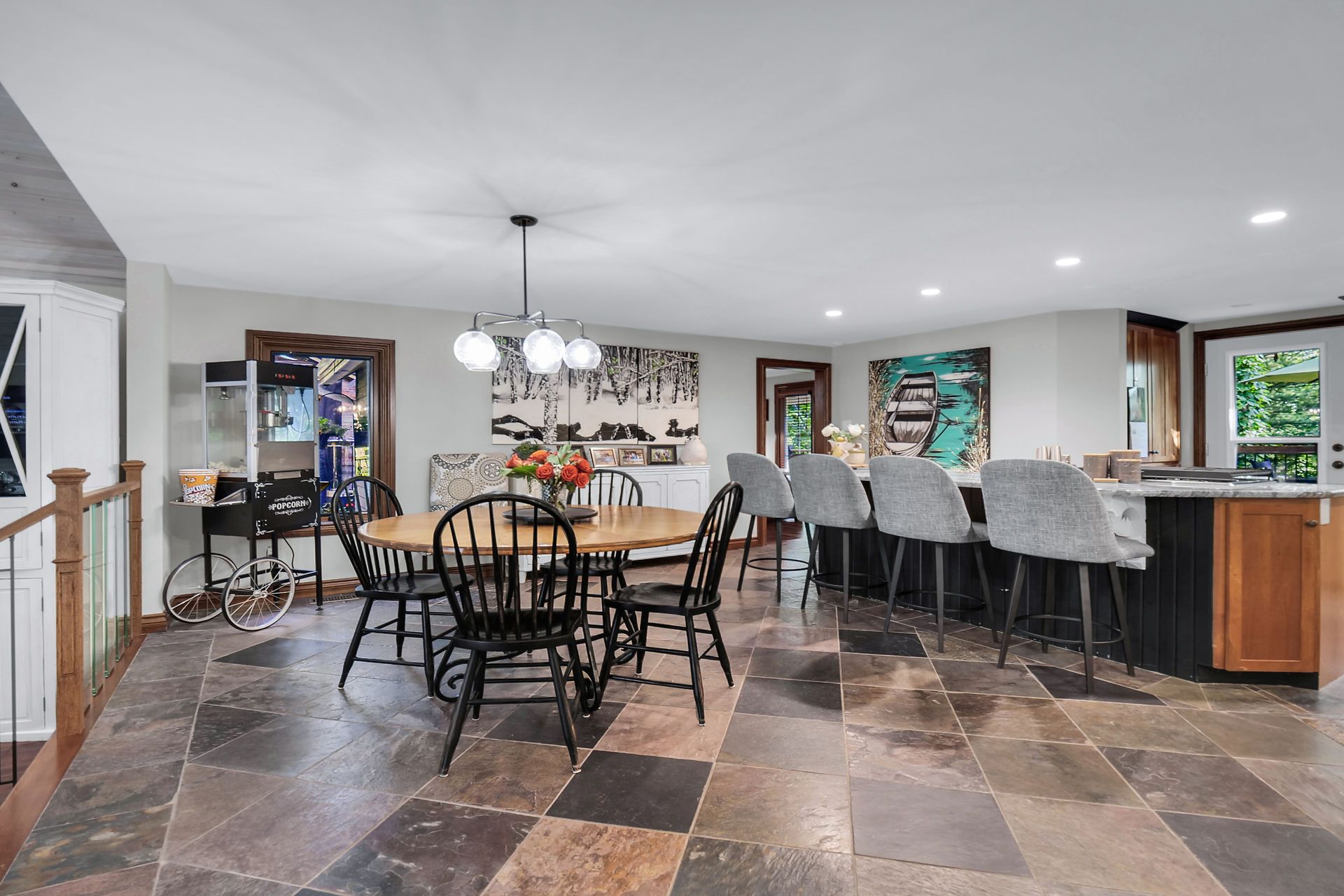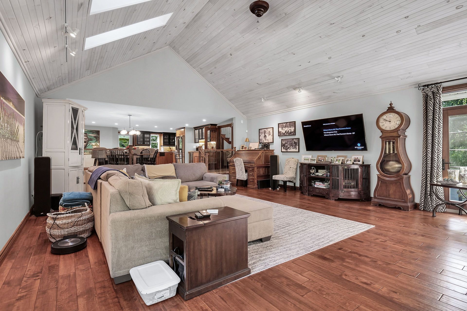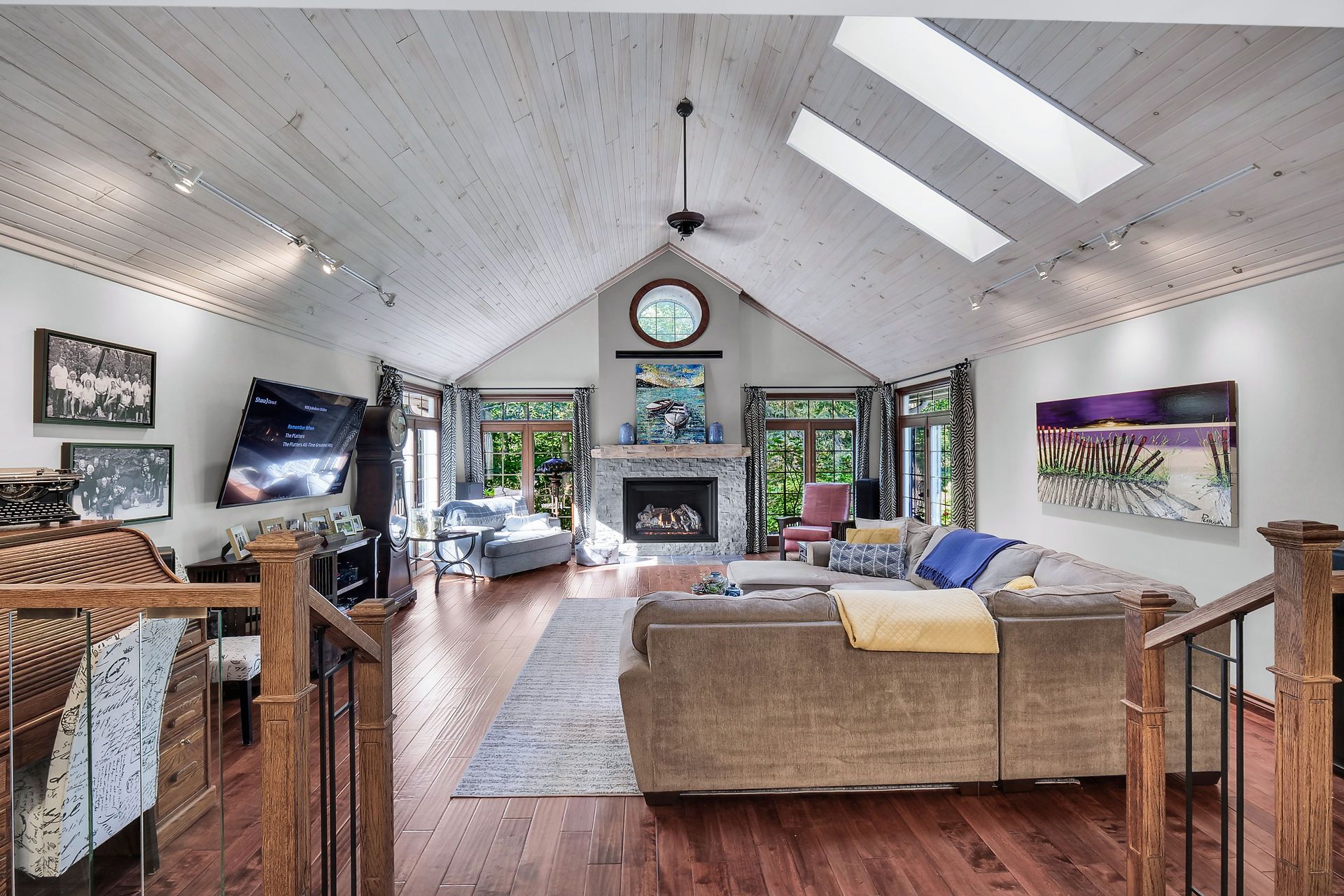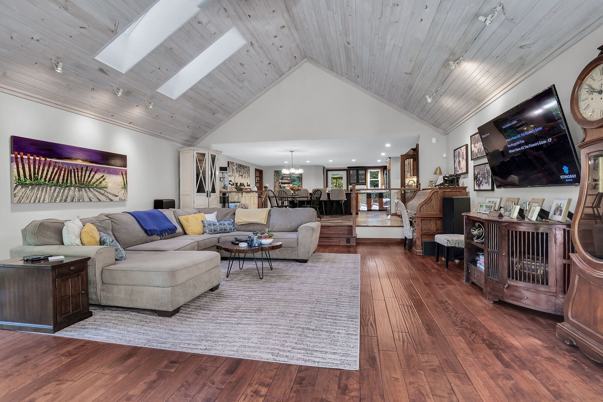 • Spacious open concept living area with vaulted ceilings and fireplace.