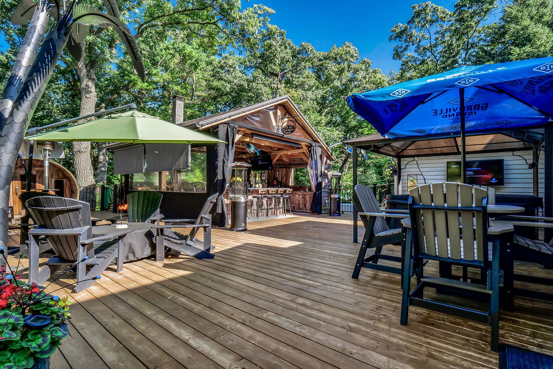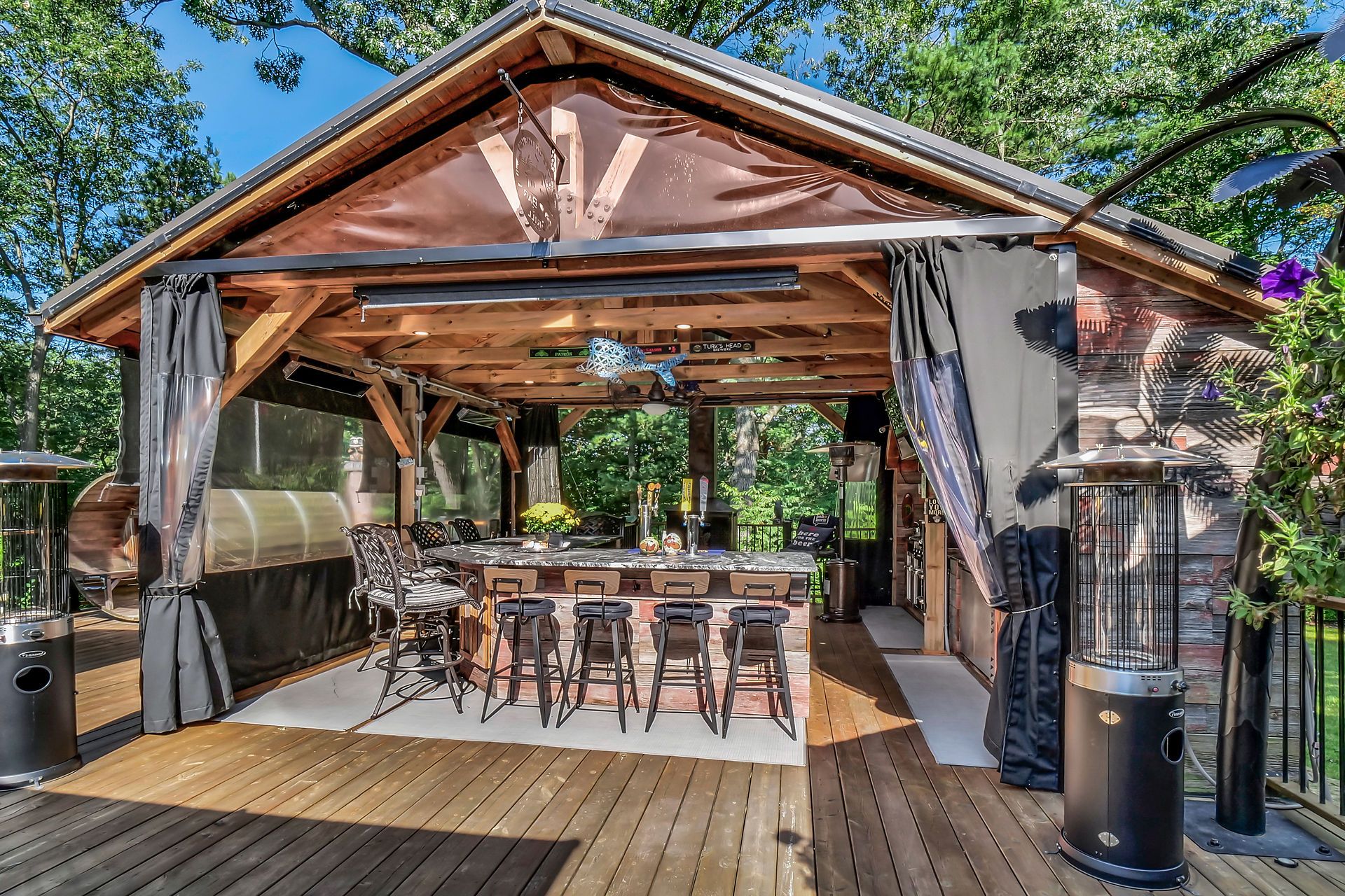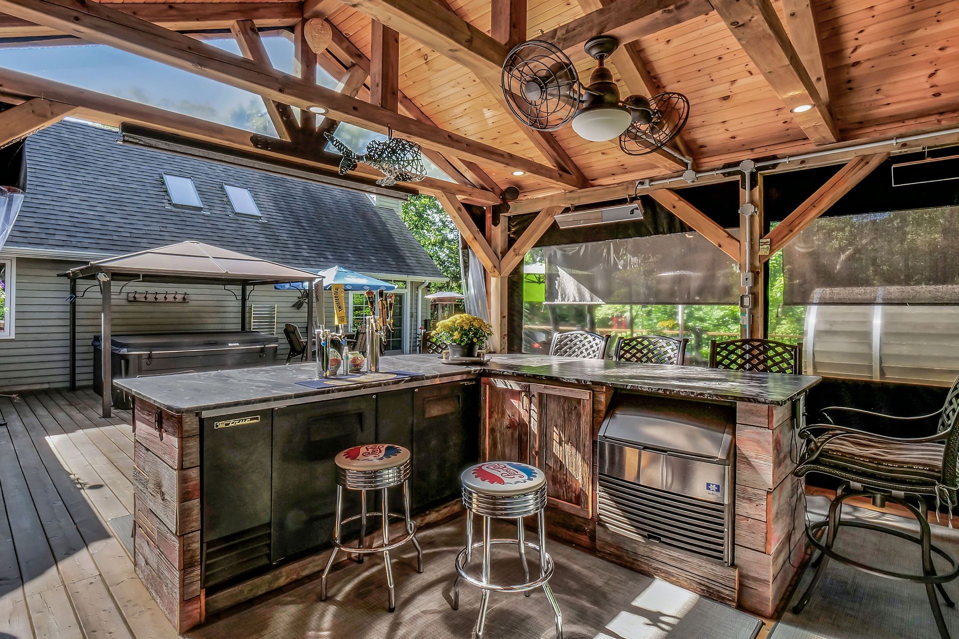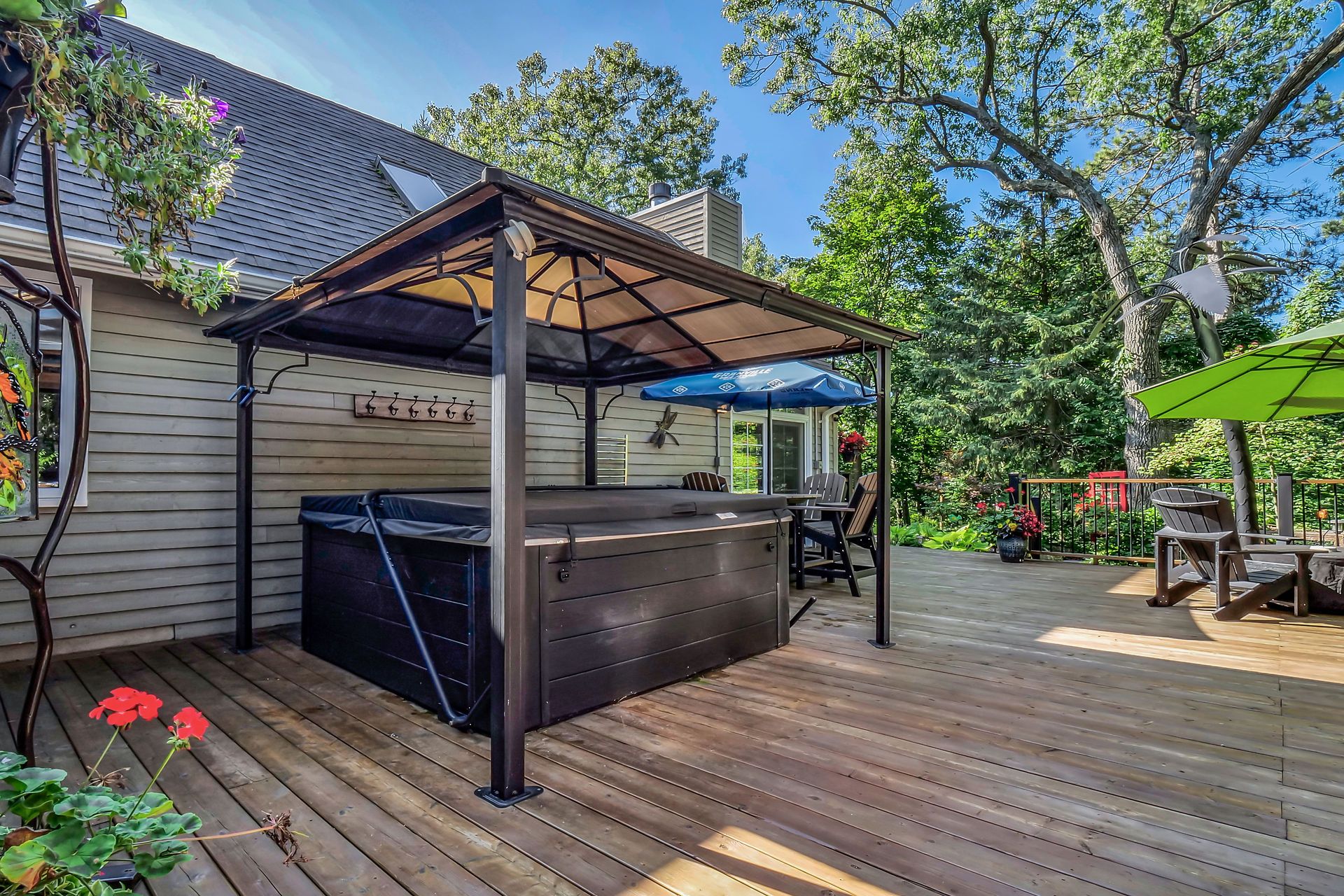 • Central outdoor entertainment area with gazebo, hot tub, and kitchen.