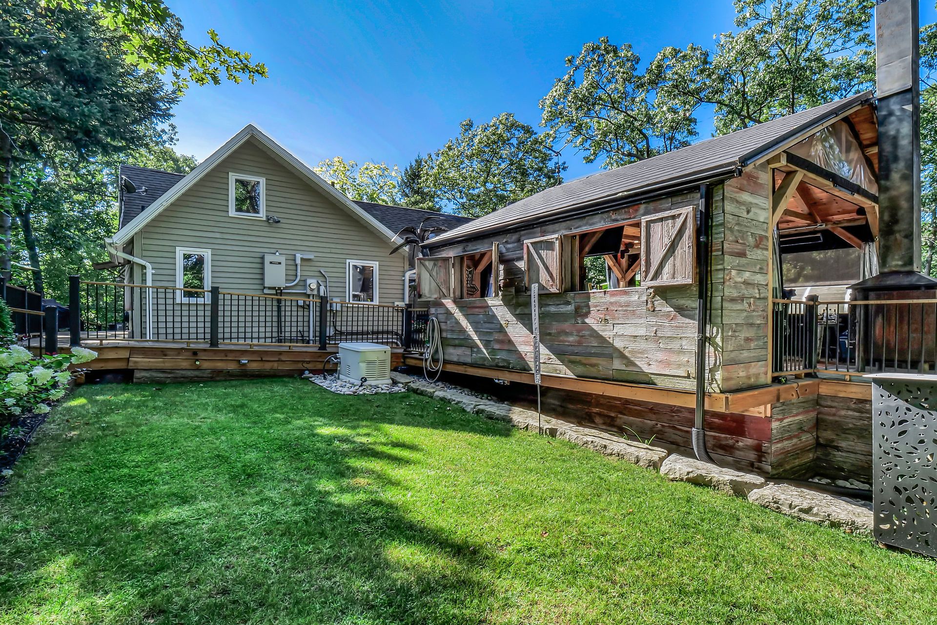 Relax and unwind at your private oasis nestled in the woods! This stunning home is situated on over 3 acres of lush green forestry in desirable port franks. Drive up one of the two private winding paths to this updated 1. 5 storey home boasting all the amenities for everyday life and play! Enter through the front door into the grand and spacious foyer, through to the sprawling open concept main level featuring great room with hardwood floors, vaulted ceilings, fireplace with stone surround, skylights and access to the large rear deck; updated kitchen loaded with storage, wet bar, granite counter tops, large island with breakfast bar, and direct access to side deck perfect for a serene dinner in the treetops. Lovely main floor primary suite with walk in- closet and updated ensuite including double sinks, granite countertops and tiled shower with glass enclosure. The convenience of mudroom, laundry and 4-piece bathroom complete the main level. Travel up one of the two staircases to the additional 2 bedrooms and generous den/recreation room with fireplace. You can't miss the central outdoor entertainment spot! Boasting large timber framed gazebo (2018) with wet bar, outdoor kitchen, beer taps, ice maker, multiple fridges, tvs, wood burning fireplace, hot tub and sauna you have everything you need to entertain your friends and family all day and night long! Wander down the path to the beautiful 1 bedroom guest house with living room, kitchenette, bathroom, laundry, covered deck, fire pit and parking- the perfect private place for your guests to unwind or to rent out for additional income. Down the path there are 3 storage sheds, space to park a camper, and potentially sever lots. The grand finale is the huge 40'x40' 4-car detached heated garage with 2-piece bathroom (separate septic), 2x30amp service for campers, and 14'x14' garage door perfect to park all of the toys you'll want for exploring beautiful lake huron! Steps to beach, community centre, trails and more!