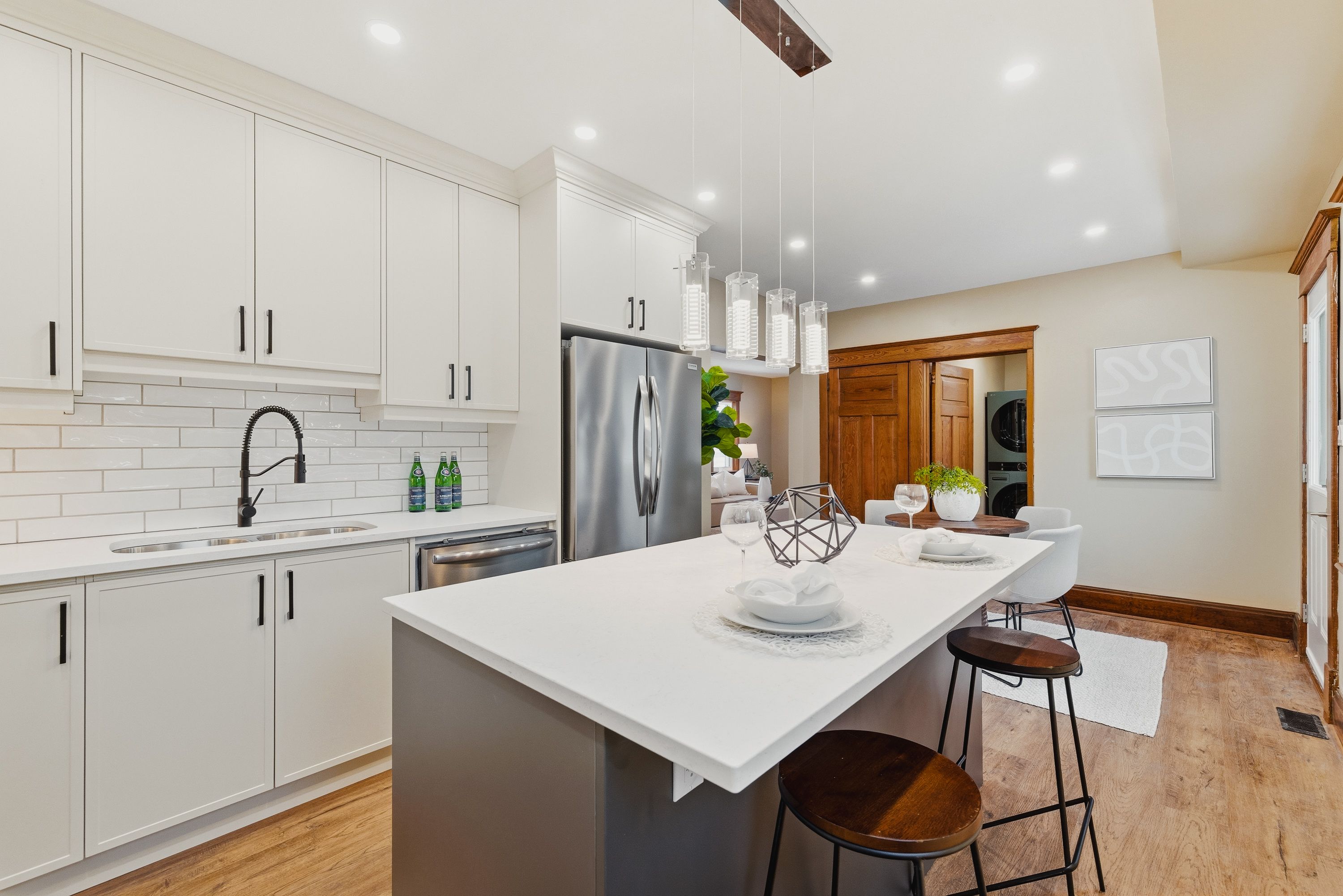 • Custom kitchen features quartz countertops and a large island with seating.
