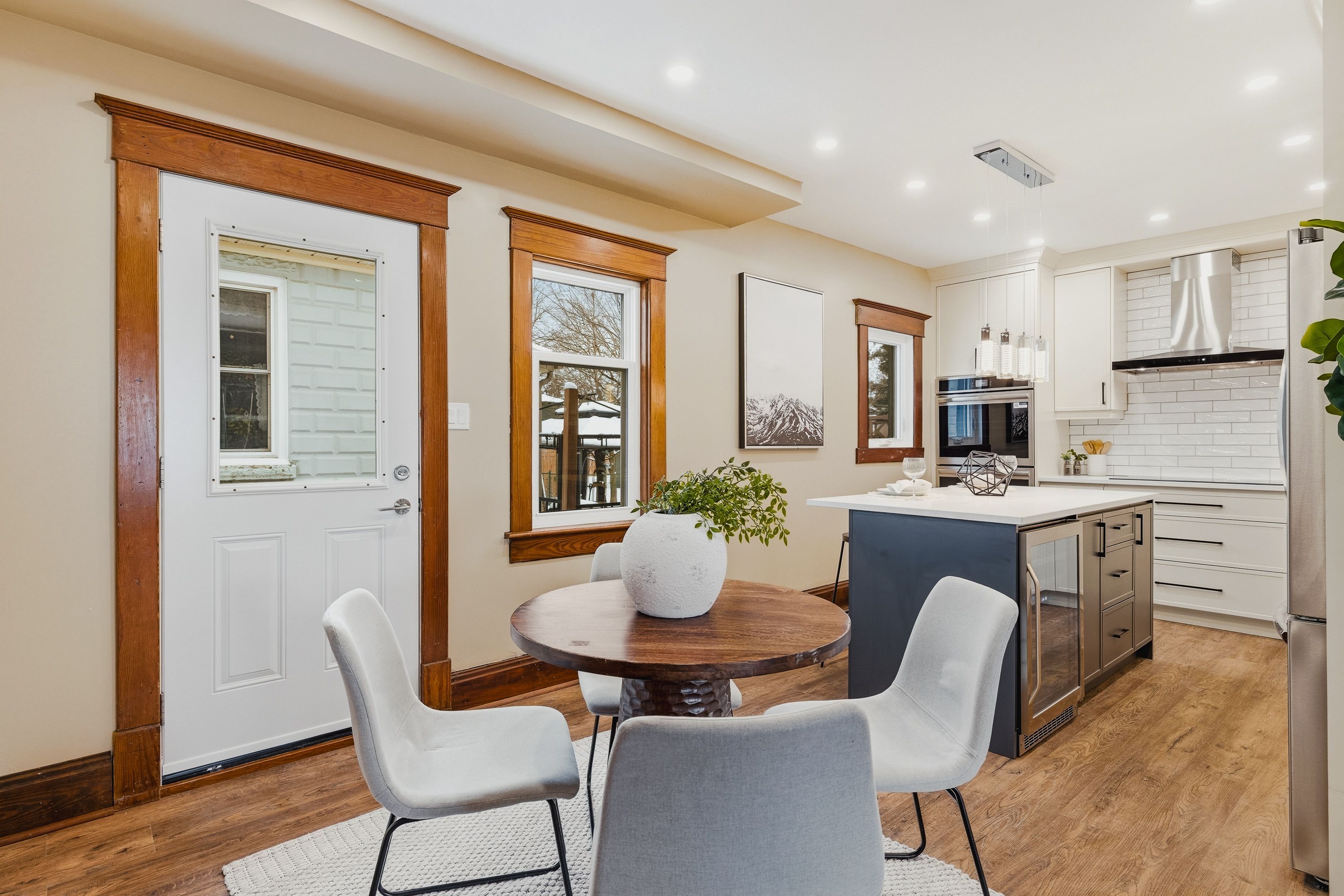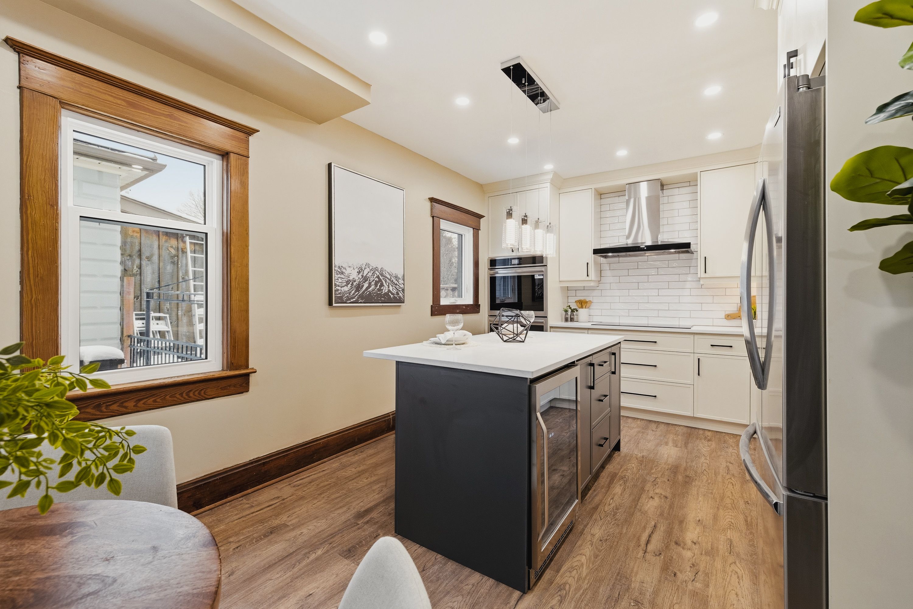 Welcome to 999 vine street, a fully modernized home in cambridge's sought-after preston neighbourhood where timeless character meets a comprehensive top-to-bottom renovation. This beautifully updated 3-bedroom, 3-bath detached home offers new flooring throughout, triple-seal custom windows, and all-new exterior entry doors that enhance efficiency while filling the home with natural light. The professionally designed custom kitchen (2026) is the centrepiece, featuring antique ivory cabinetry, quartz countertops, and a show stopping 72-inch island with seating and built-in beverage cooler. The premium appliance package includes double convection wall ovens, a 36-inch induction cooktop, jennair hood fan, frigidaire gallery counter-depth fridge with water and ice, dishwasher, and a 50-bottle dual-zone wine fridge - ideal for cooking and entertaining alike. Offering a rare 1:1 ratio of bedrooms to full bathrooms, the layout features two bedrooms upstairs and a third on the lower level, providing excellent separation for guests, teens, or a home office while ensuring every bedroom is paired with its own full bath. Beyond the stunning finishes, this home has undergone a full mechanical overhaul with all new wiring, new gas line and meter, new york furnace (oct 2025), new air conditioning (oct 2025), new hot water heater, all new pro pex water lines, and completely replaced drain lines beneath the basement floor to the foundation - delivering long-term reliability and peace of mind. Original main-floor wood trim preserves warmth and character, while main-floor laundry features a rare matte-green lg thinq washtower. The basement includes walk-up access for future potential, and parking accommodates two vehicles on this desirable corner lot with city-cleared sidewalks. Set on a quiet, established street close to excellent schools, parks, shopping, and transit, this is a rare opportunity to own a home where the beauty you see is matched by the quality behind the walls.
