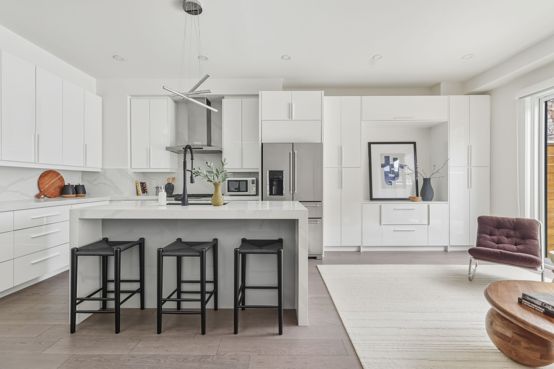 • Open concept kitchen with quartz counters and top-tier appliances for easy entertaining.