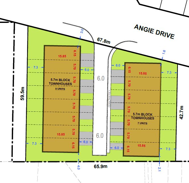 • Planned residential site for 15 townhouse units across two blocks.