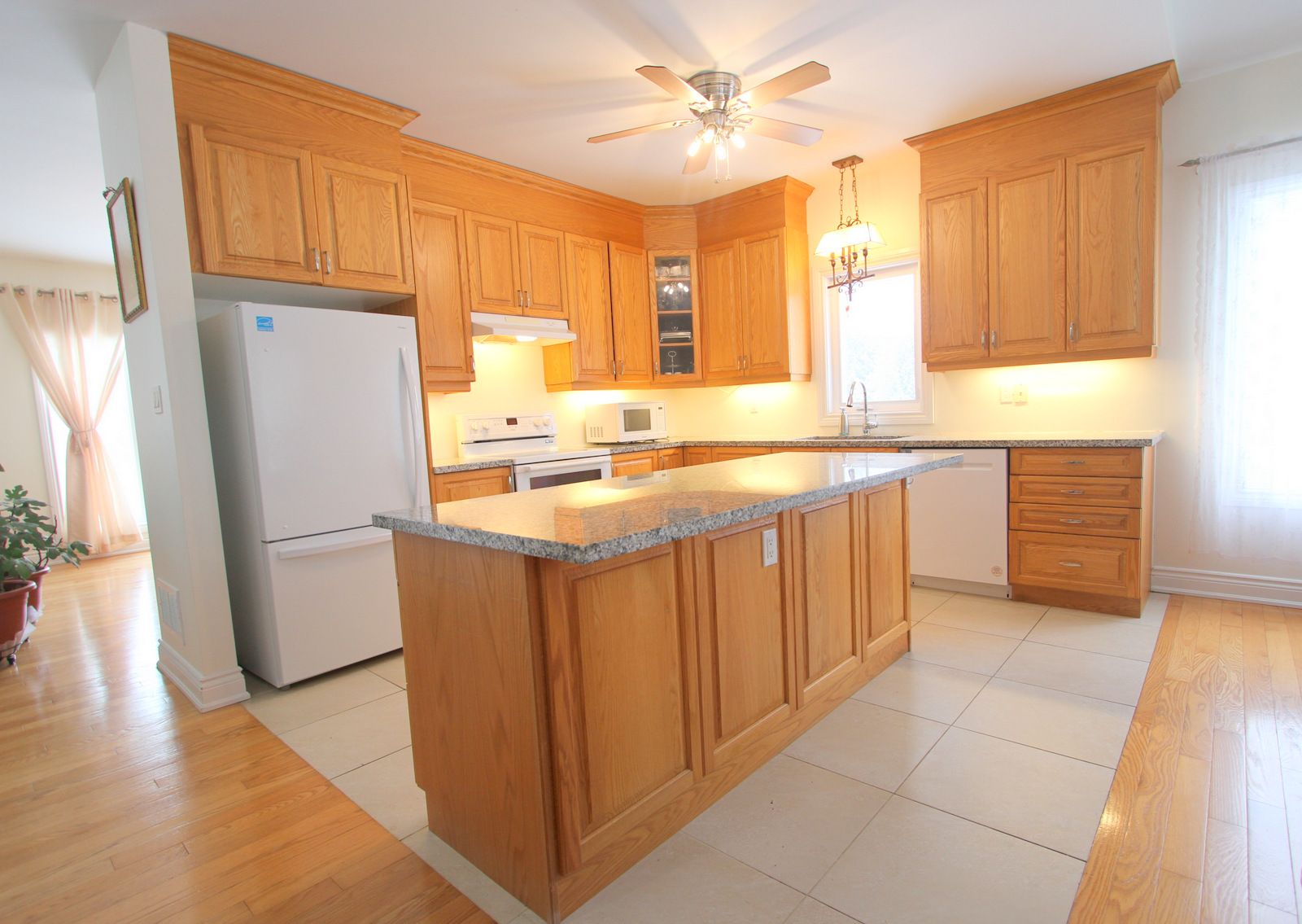 • Open-concept living area with cathedral ceilings and a central island.