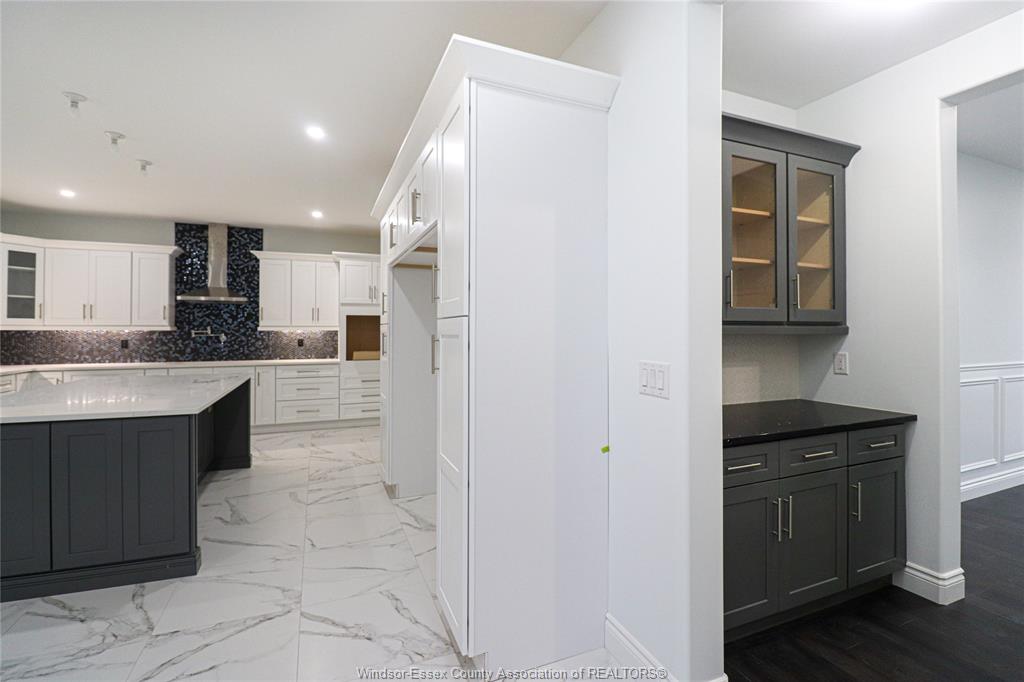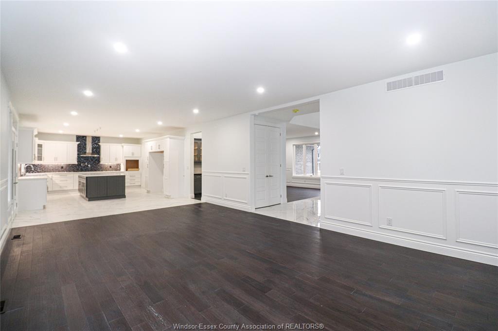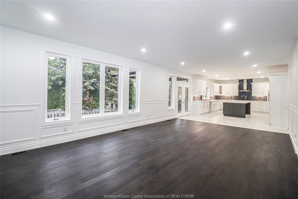 • Massive living, dining, and kitchen area with high ceilings.