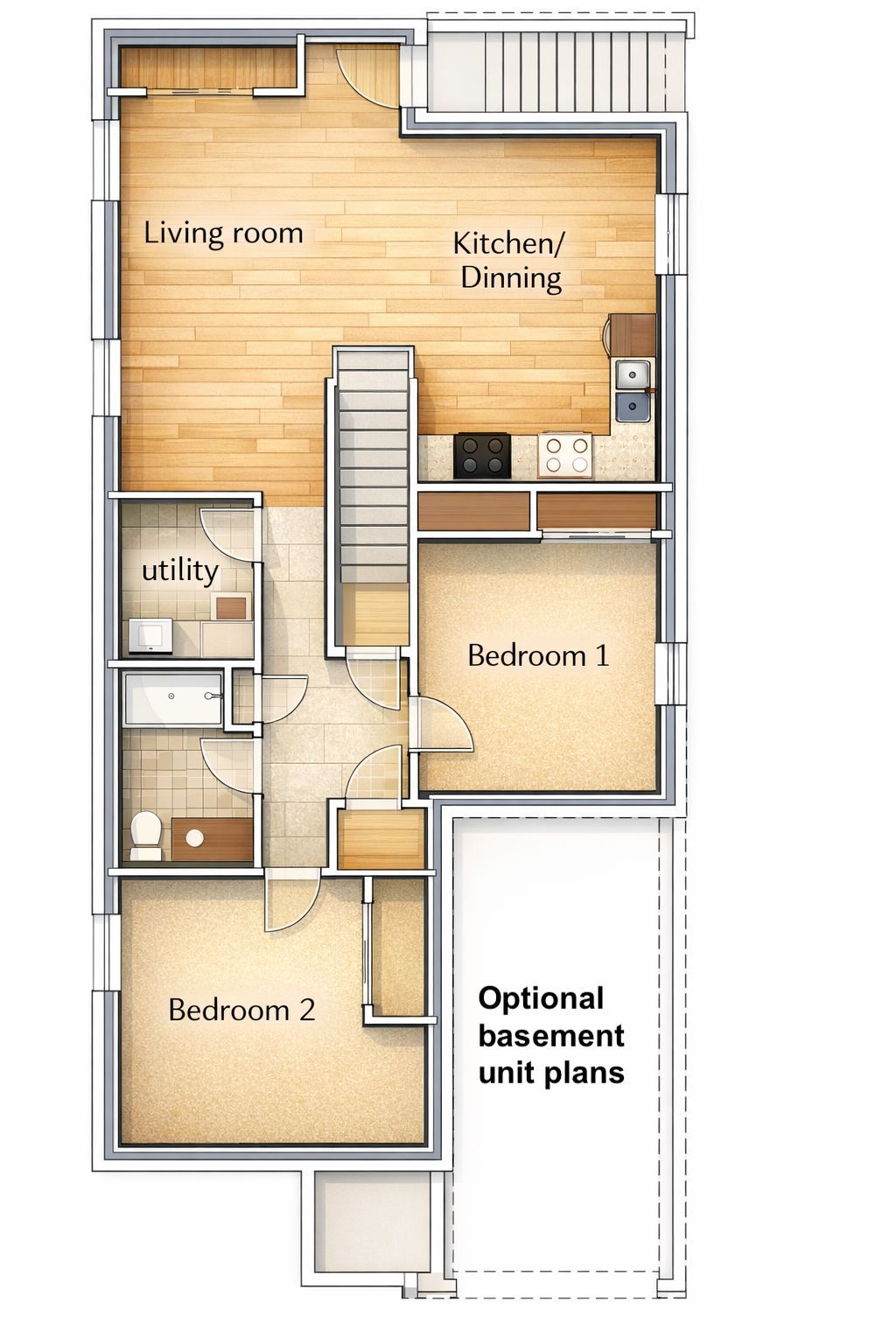 Introducing the rosie, a thoughtfully designed 1275 sq. Ft. Home by bakker design & build, offering smart use of space, functional flow, and elevated architectural details throughout. The main living area features an open-concept kitchen, dining, and living room designed for connection and comfort. A tray ceiling in the dining room adds character and dimension, while the kitchen is anchored by a central island and complemented by a walk-in pantry for added storage. Large windows bring in natural light, creating a bright and airy atmosphere. The private primary suite offers a comfortable retreat with a spacious closet and convenient access to a full bath 5-pc bathroom. A second bedroom provides flexibility for guests, a home office, or growing families. Main-floor laundry and direct access to the garage add everyday practicality. To be built! Other lots and designs are available. Price based on base lot, premiums extra. Check out more plans at buchanancrossings. Com