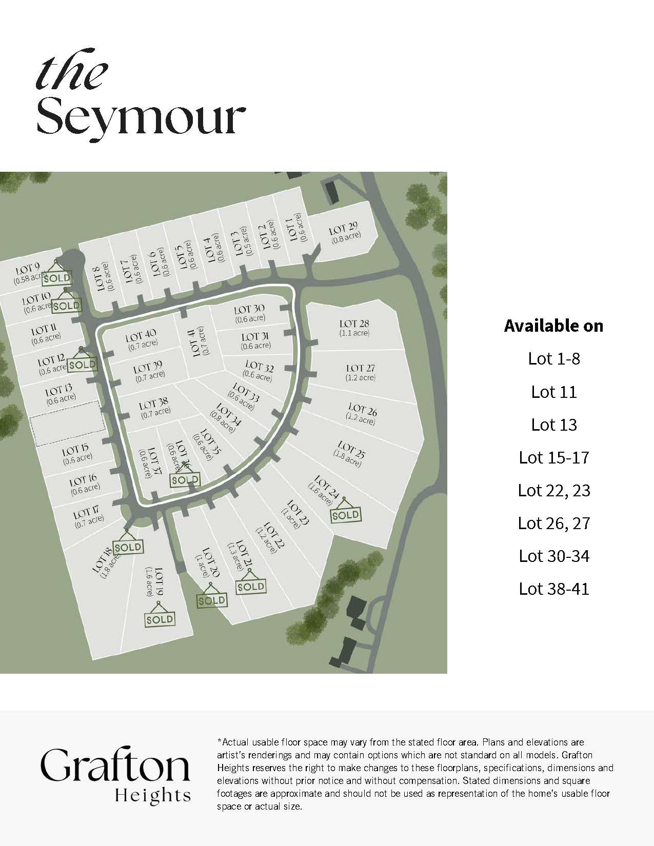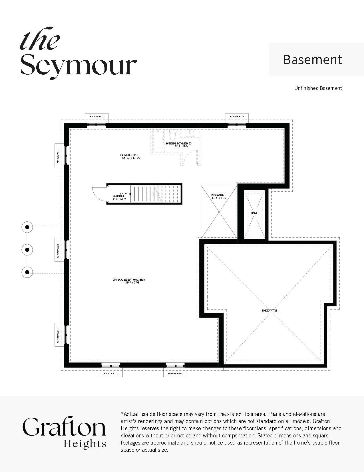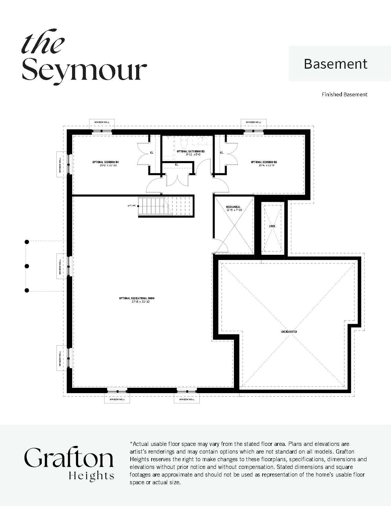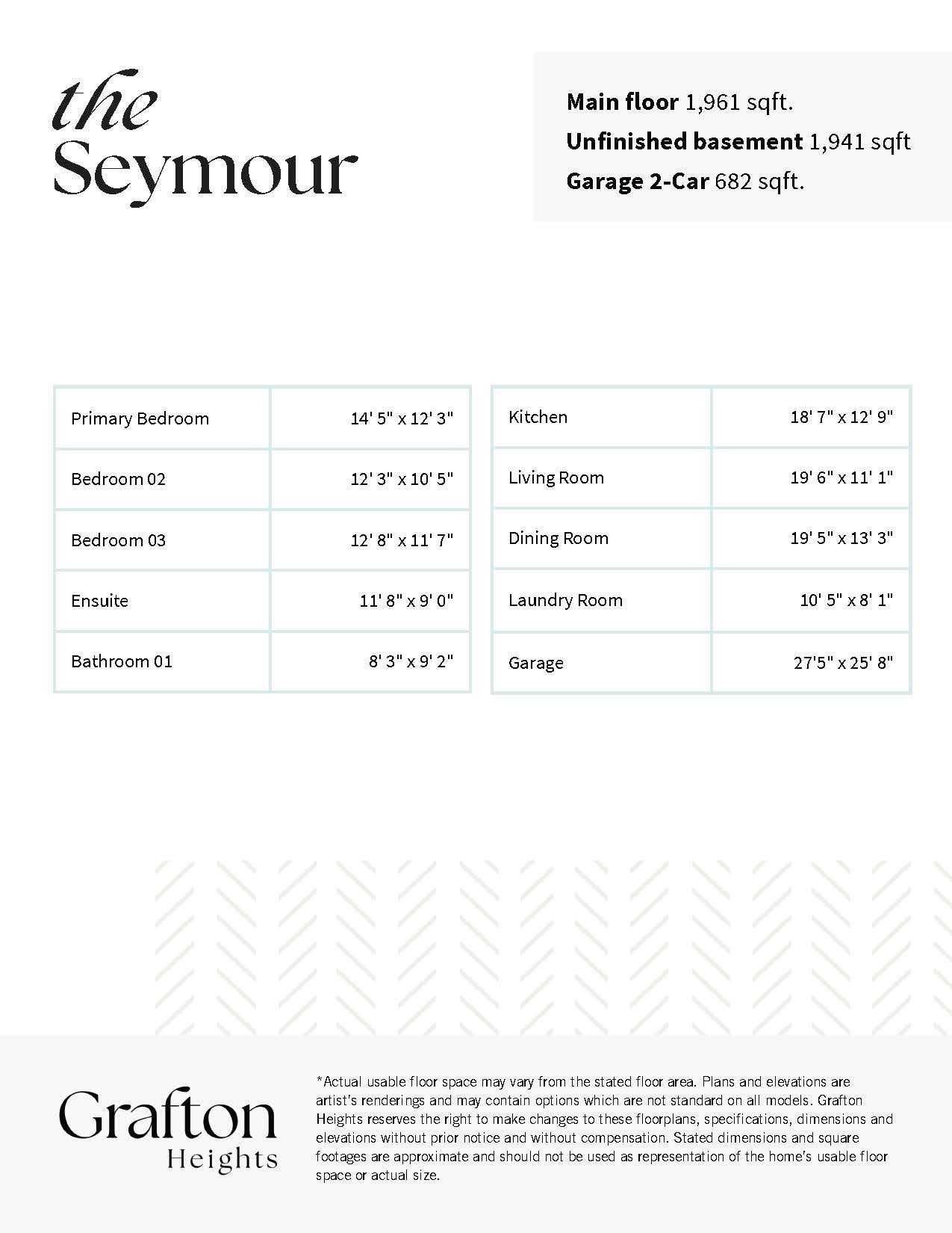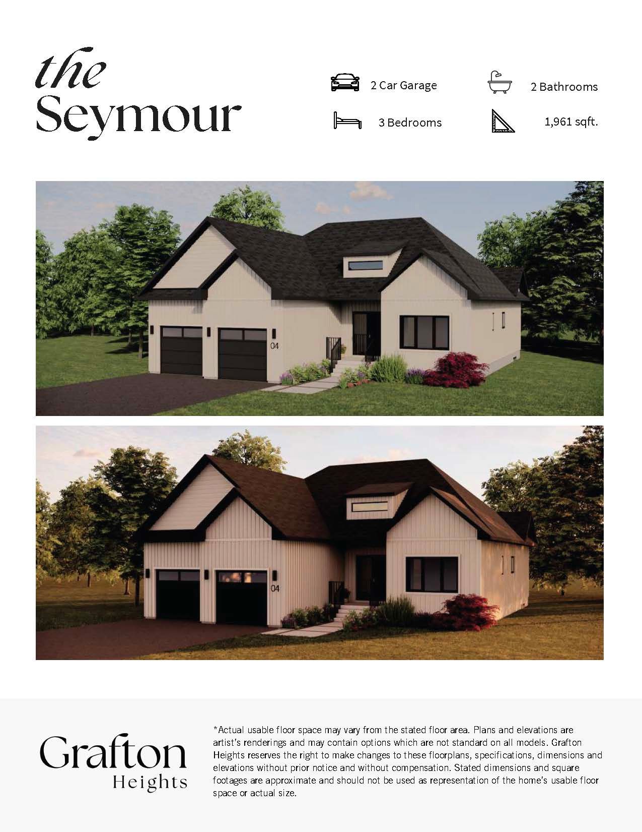 Introducing the seymour, a thoughtfully designed bungalow offering approximately 1,961 sqft of well-planned main floor living, plus an unfinished 1,941 sqft basement ready for future expansion. With 3 bedrooms, 2 bathrooms, and a 2-car garage, this home delivers comfort, functionality, and flexibility in a smart, manageable footprint. The seymour features a bright, open-concept living and dining area anchored by a spacious kitchen with excellent sightlines, ideal for both everyday living and entertaining. The primary bedroom offers a private retreat complete with ensuite, while two additional bedrooms provide versatility for family, guests, or a dedicated home office. A main-floor laundry room and direct garage access add to the home's practical appeal, making daily life easy and efficient. Located within grafton heights, this carefully planned hillside community is known for its peaceful setting, neighbourhood streets, and scenic views across grafton's landscape and toward lake ontario. Homes are serviced by municipal water, natural gas, fibre optic internet, private septic systems, and feature pool-sized lots, a rare combination for new construction. Perfectly positioned just minutes to cobourg and highway 401, and within 45 minutes of the gta, grafton heights offers an ideal balance of rural charm and urban accessibility. Enjoy close proximity to the village of grafton, wicklow beach and public boat launch, excellent public and catholic elementary schools, and the extensive trails of the northumberland forest for hiking, biking, and year-round exploring. Photos and renderings are for illustration only and may include upgrades. Specs, finishes and pricing subject to change.