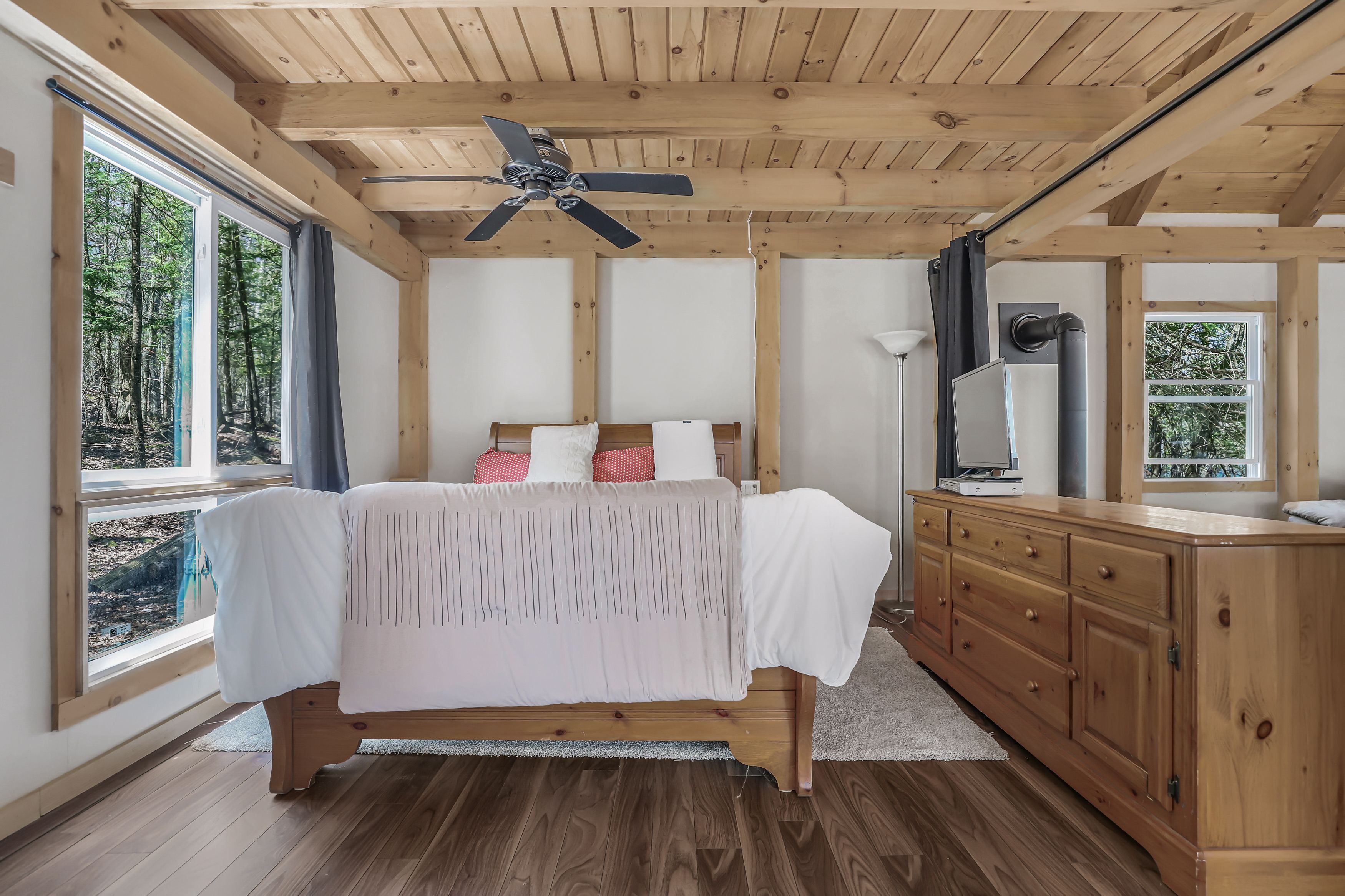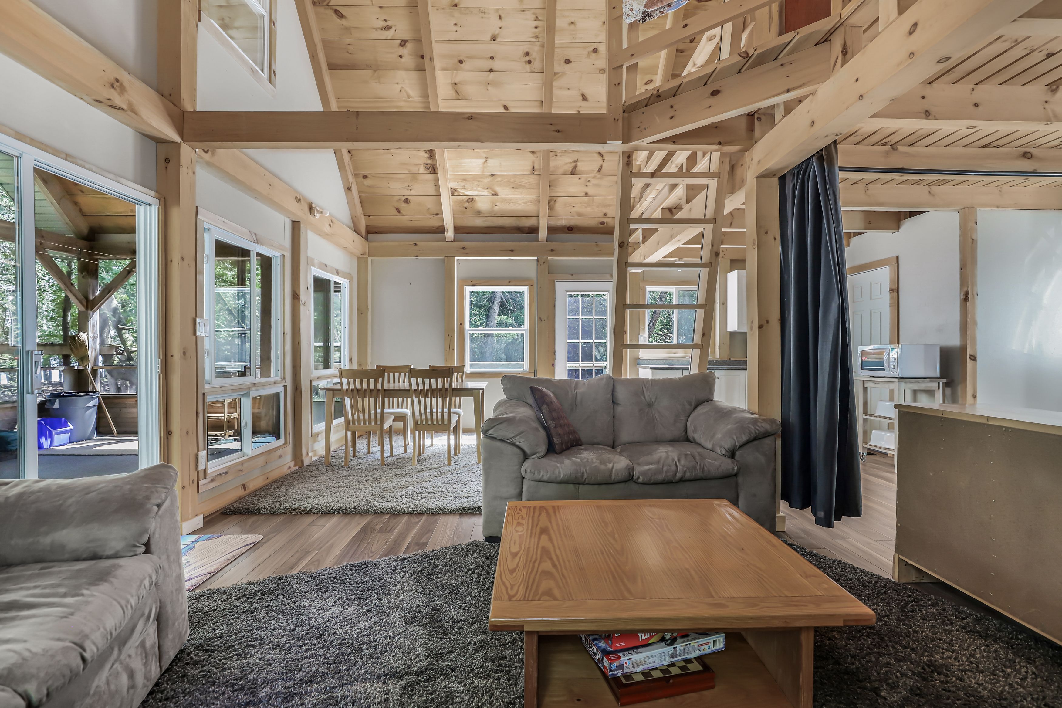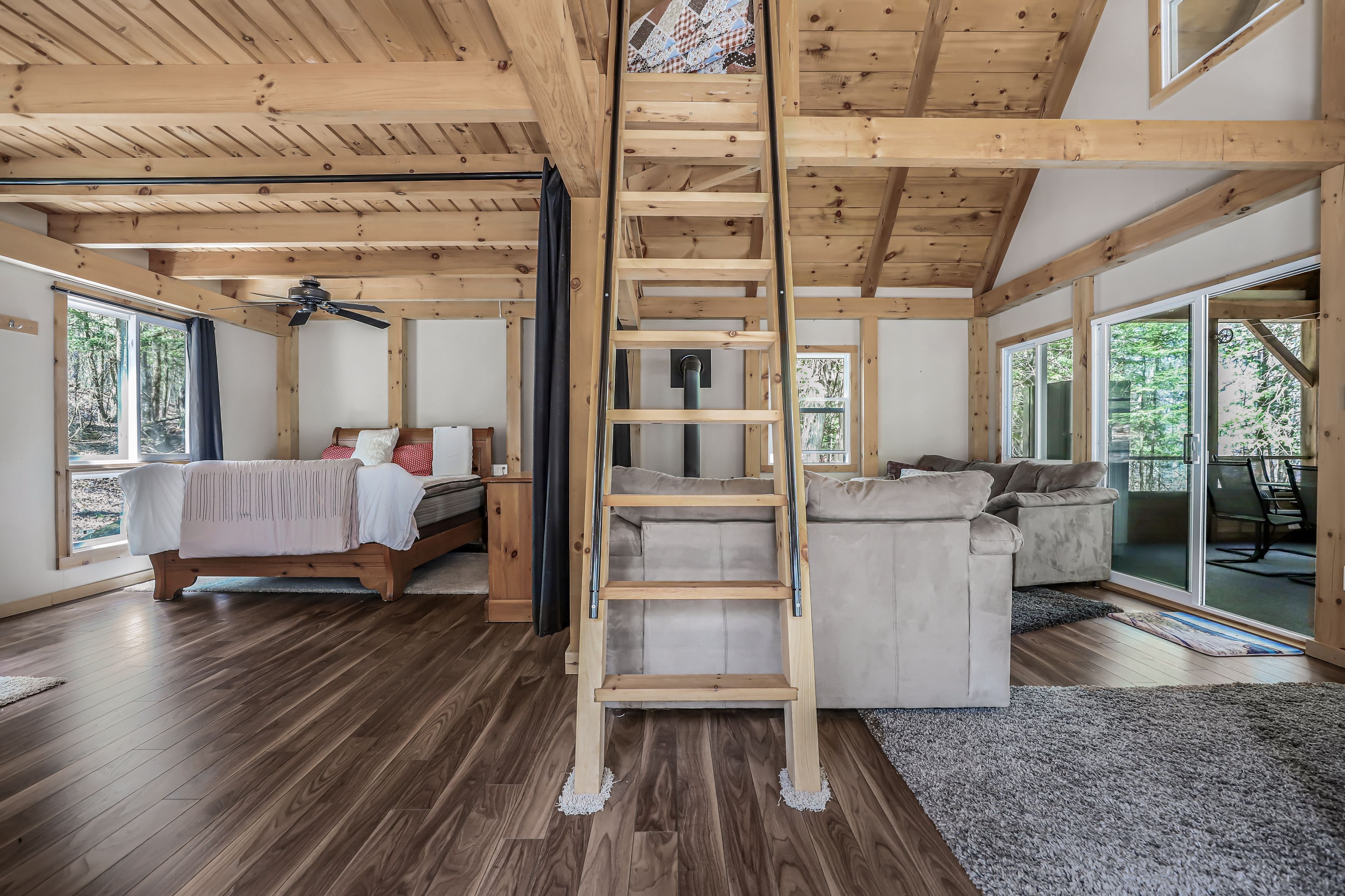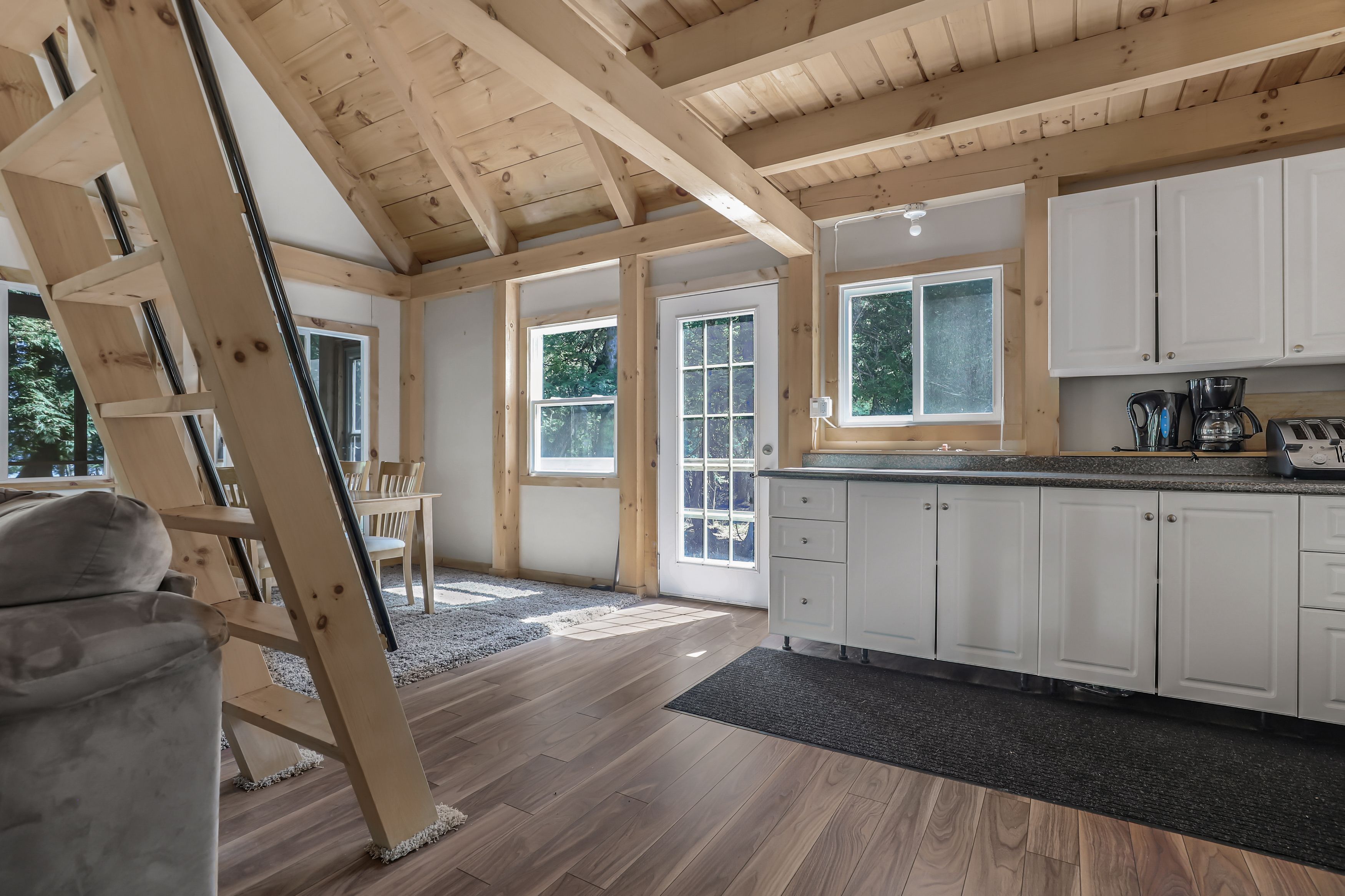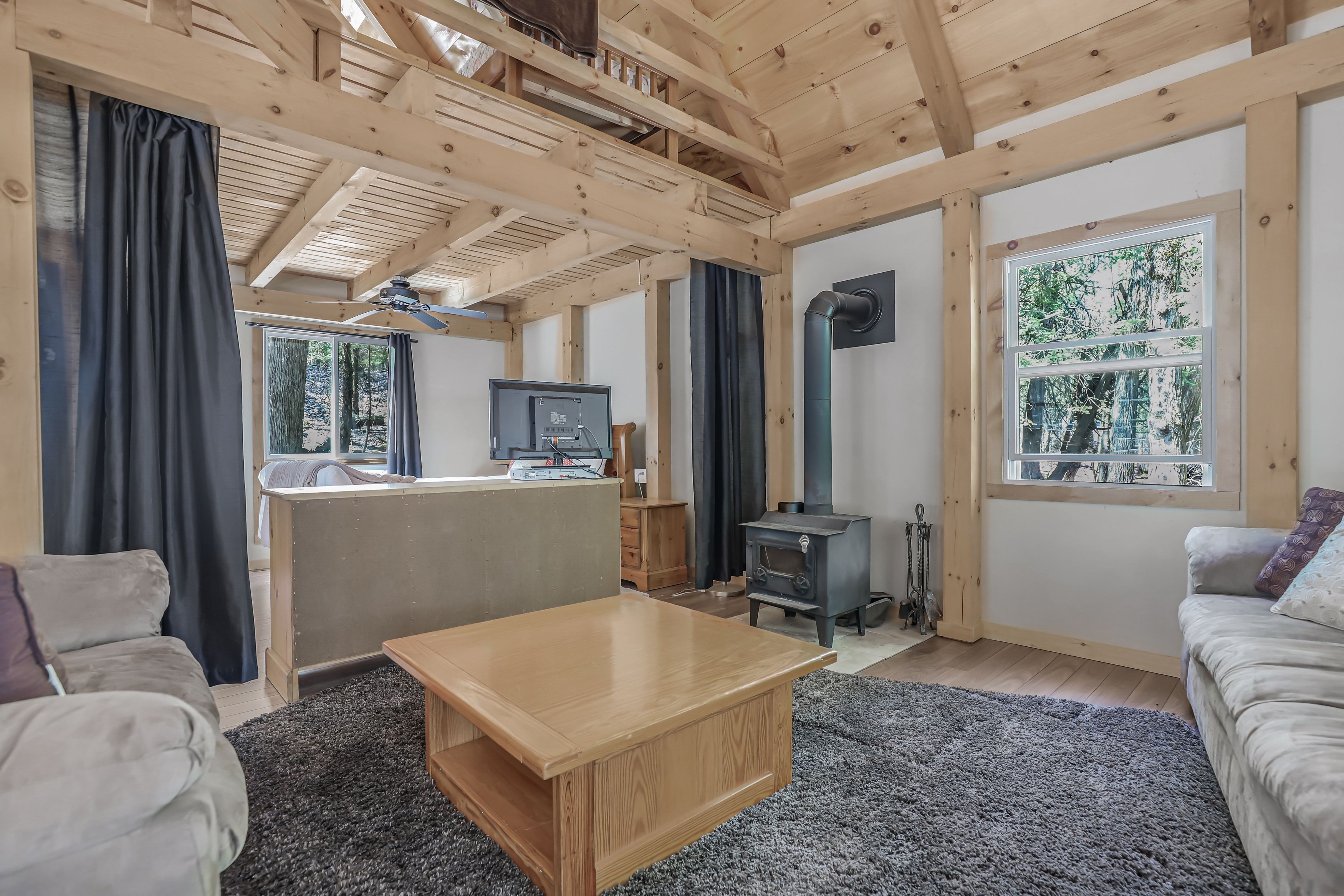 • Chalet-style cabin with functional kitchen and wood stove.