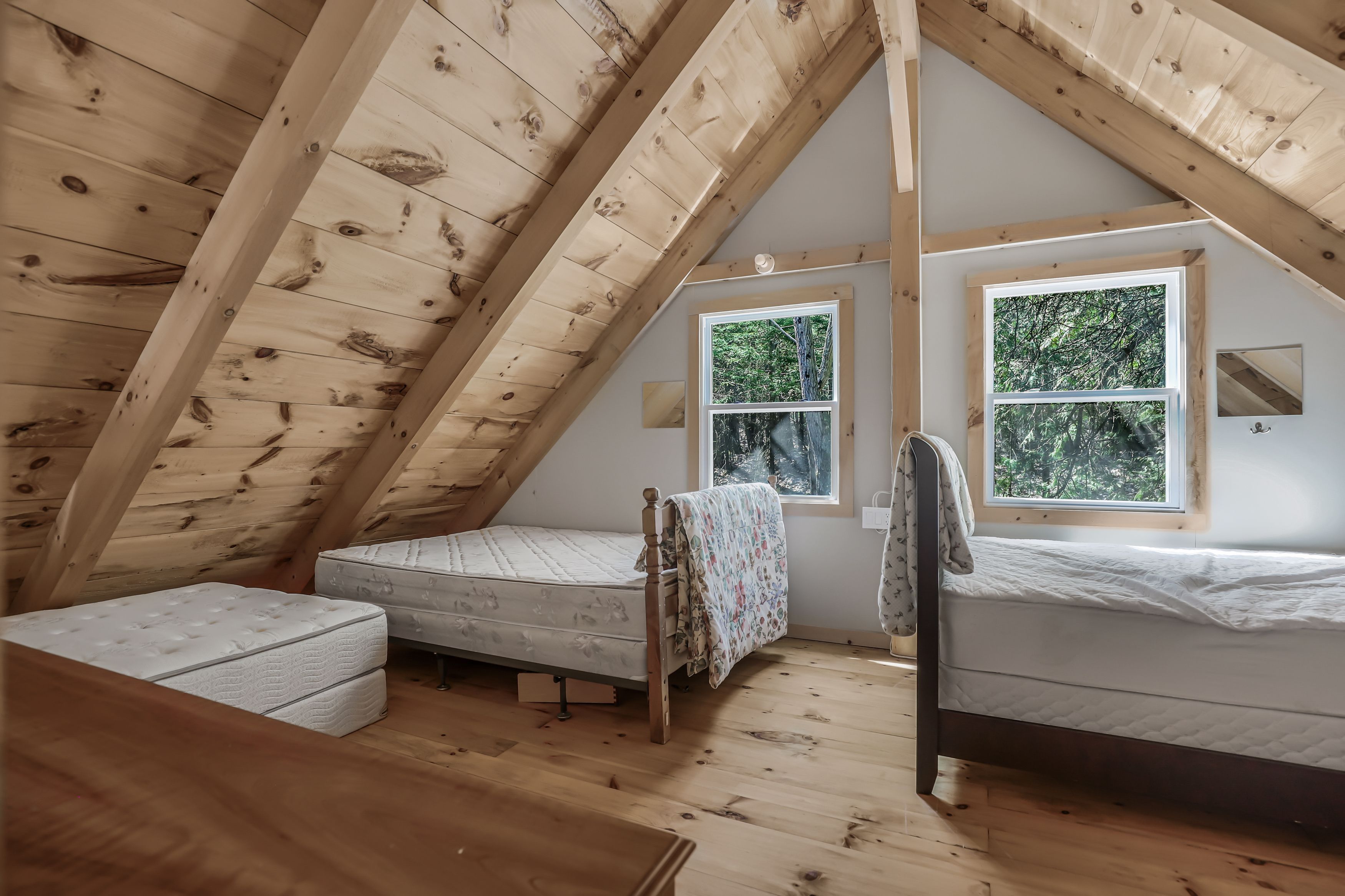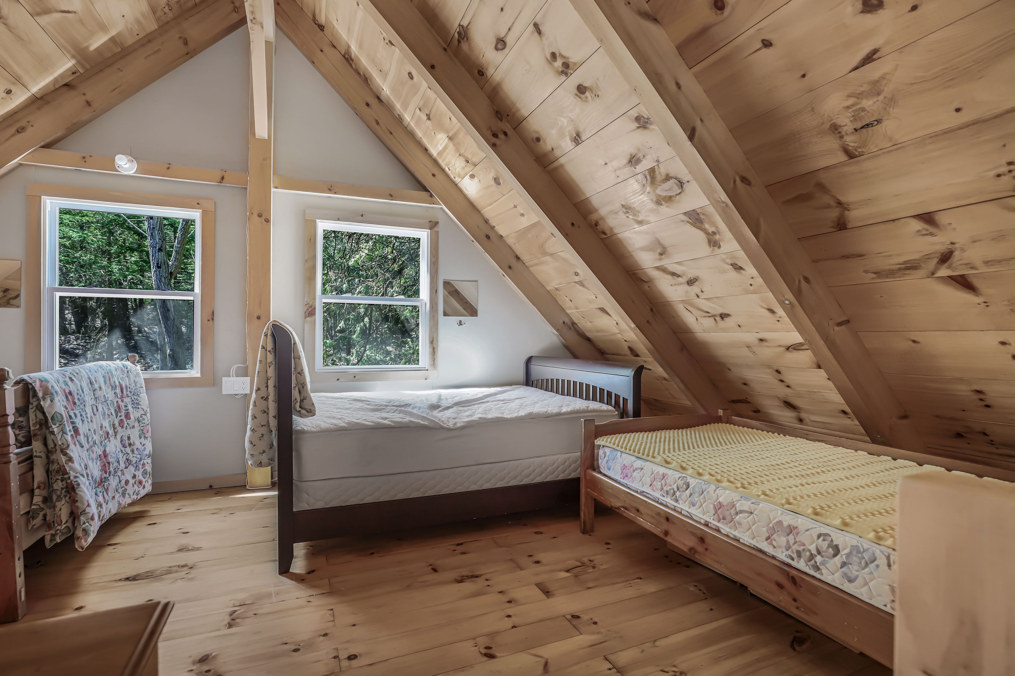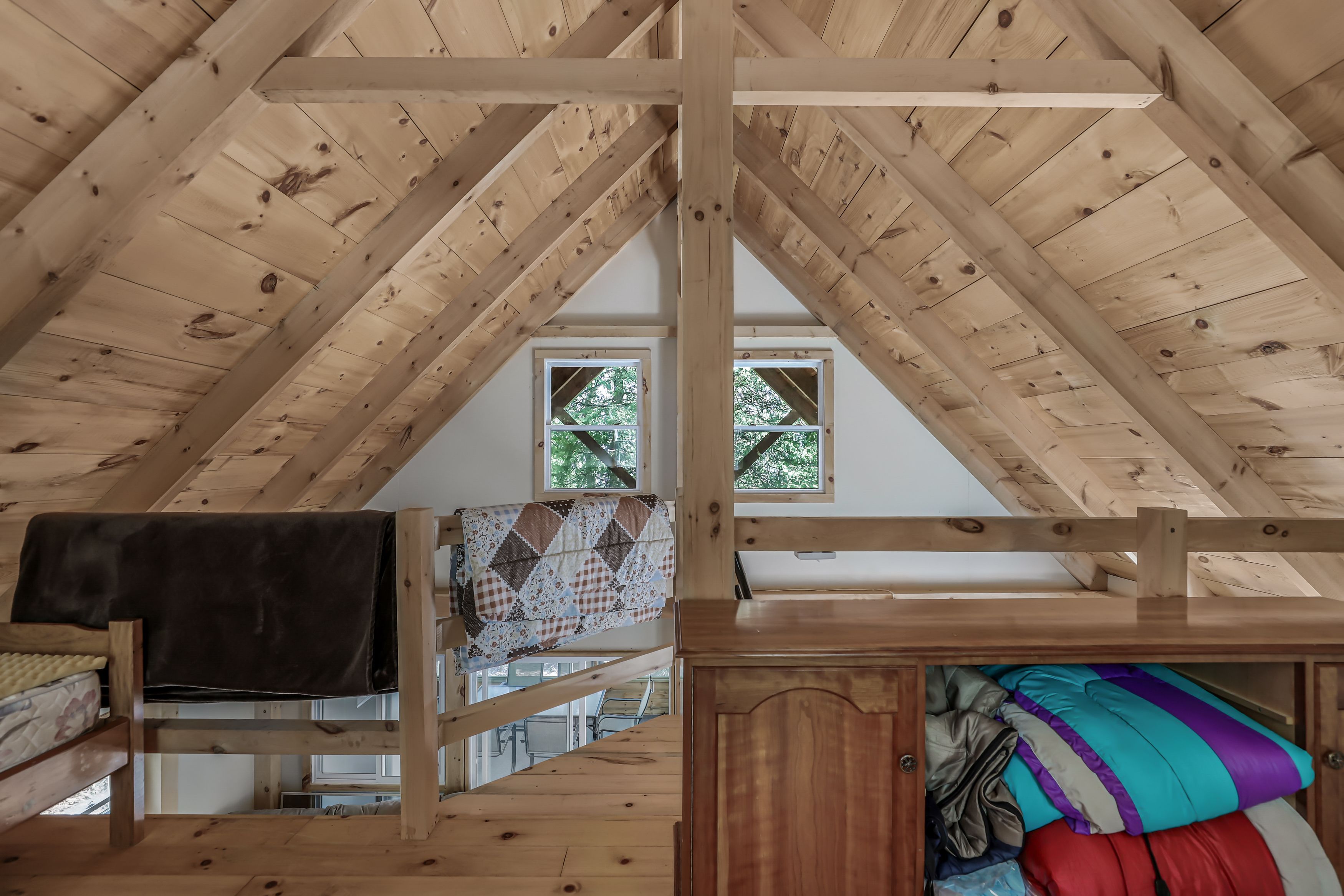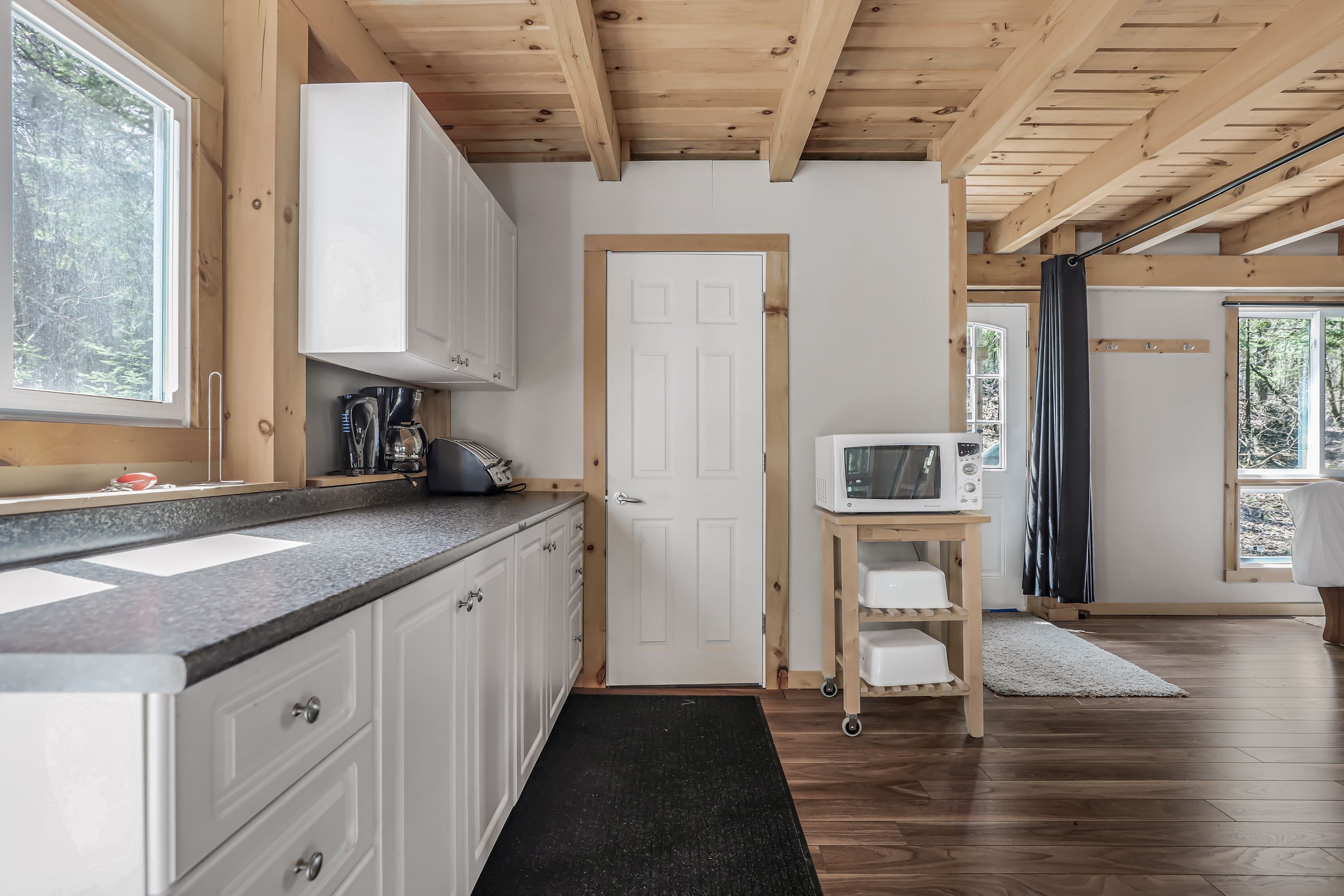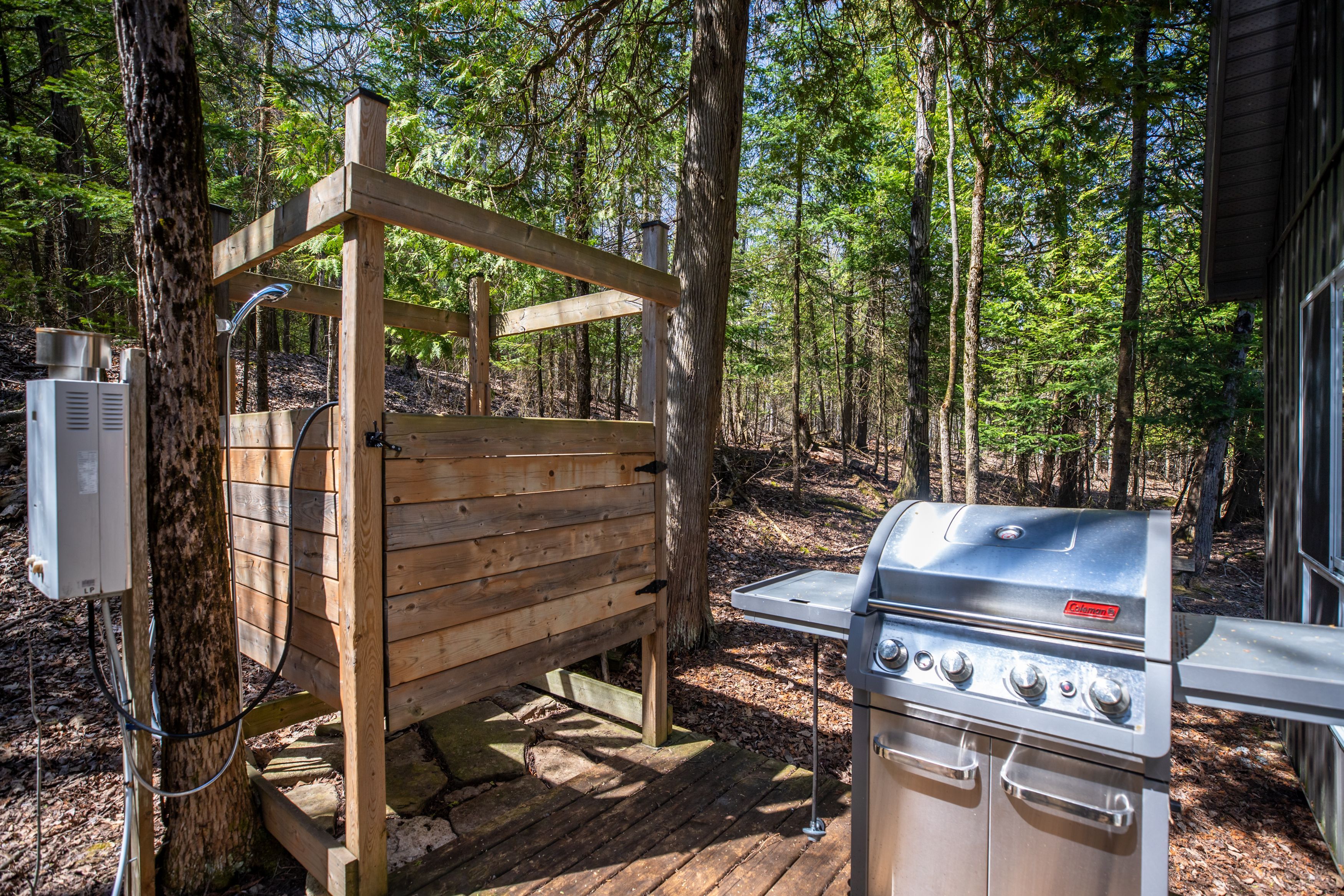 • Chalet-style cabin with functional kitchen and wood stove.