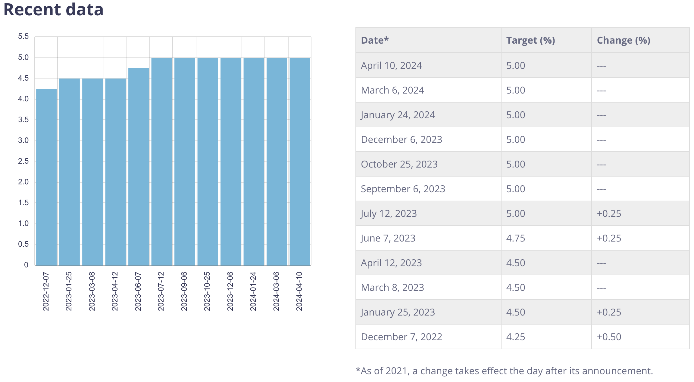 The Bank of Canada has made their key rate decision for April 2024. As widely expected, they announced this morning that they are maintaing their key interest rate at 5%. This makes it seven consecutive decisions to hold their key rate after increasing the rate on ten occassions between early 2022 and July 2023.