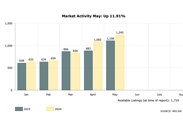 On the flip side, market activity, or the number of home listed at time of reporting, for the region remained high in May with an increase of 11.91%. 1,240 active at reporting in May 2024 compared to 1,108 at reporting in May 2023. Activity also remains up year-to-date with an increase of 9.83%. Through this May the area has seen 4502 listings versus 4099 through May of 2023.