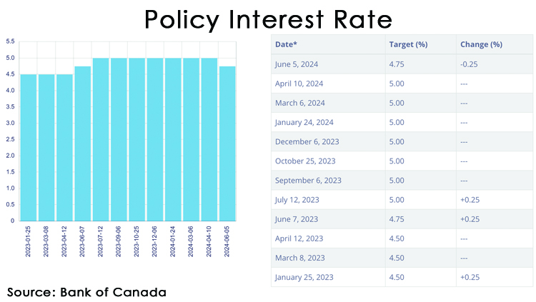 After 7 consecutive rate holds, the Bank of Canada has reduced their key rate by 25 basis points, this brings the policy rate to 4.75%. This marks the first rate cut since the country's central bank began increasing rates in early 2022 in response to inflation concerns, increases that occurred on ten occasions between then and July 2023.