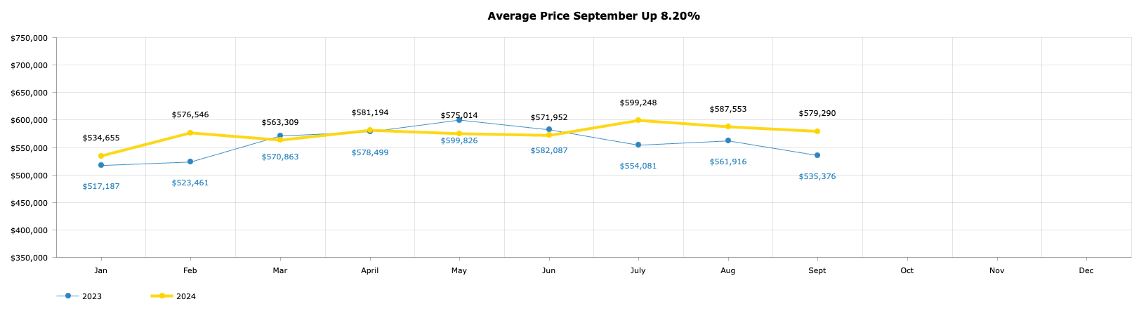 The average sales price of a home in Windsor-Essex was up 8.20% this past September compared to September of the previous year. $579,290 was the average for September 2024 versus $535,376 in the same month last year. Year to date, the average sales price is up 2.22%, $576,390 through Q3 this year compared to $563,853 through Q3 2023.
