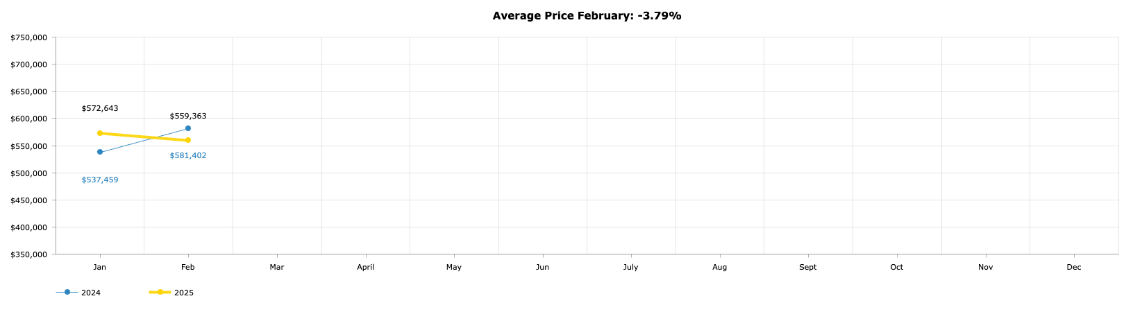 Along with a decrease in average price, there was also a decrease in the reported number of sales compared to last year. February 2025 saw 307 homes sold versus 351 in February 2024, a 12.54% decrease. Year-to-date, sales are down 10.21%, with 642 homes sold through February last year compared to only 577 sold this February.