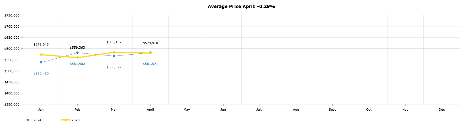 The average sales price of a home in Windsor-Essex this April was $579,910 which is almost identical to the April 2024 aver age of $581,571. An extremely modest 0.29% decrease. For year-to-date, the average sales price for a Windsor Essex home in 2025 is $573,923 again a very modest 0.87% increase over the year-to-date average of $568,955 in 2024.