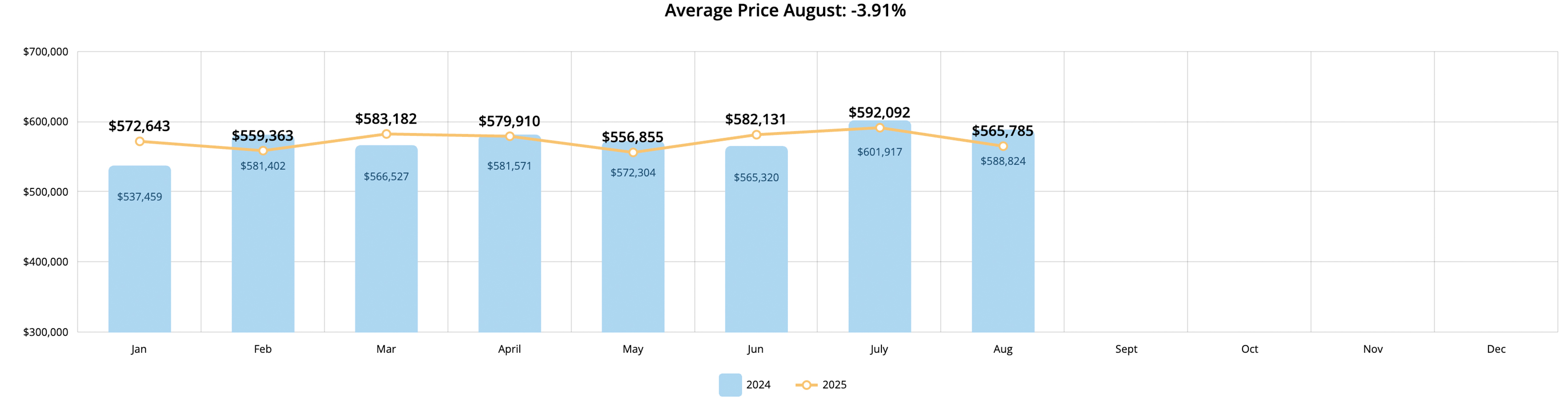 The average price of a home in Windsor this past August was $565,785, a 3.91% decrease from the August 2024 average of $588,824. Year-to-date, the average cost of a Windsor home is $573,593, down 0.42% from this time last year. This follows the recent May, June, and July trends of being nearly identical to the 2024 year-to-date average price. The Year-to-date average after August 2024 was $575,993.