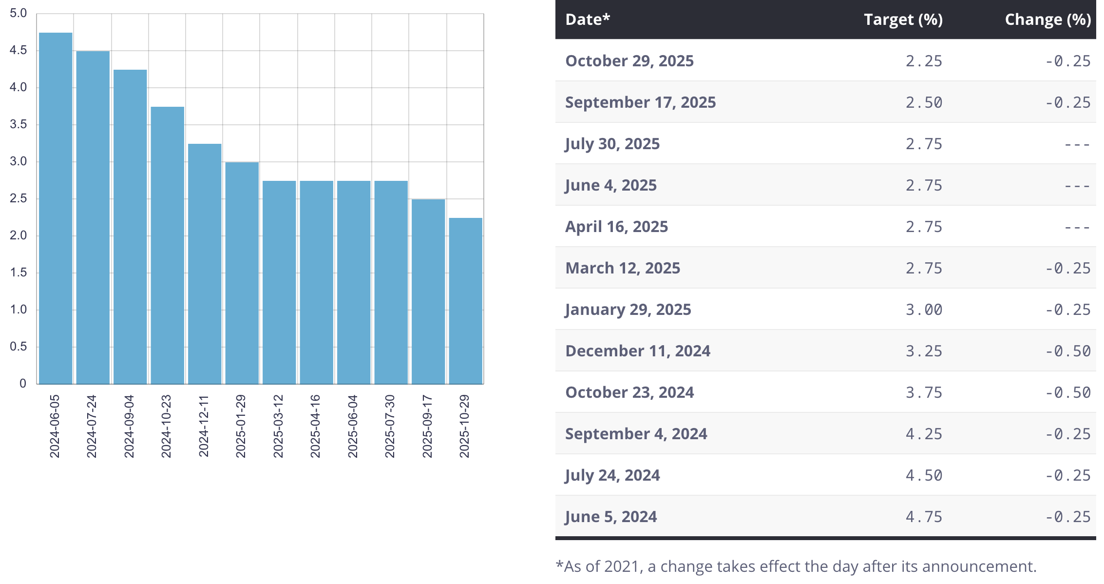 It's two decisions in a row with a rate from the Bank of Canada. After a 25 basis point cut in September the Bank of Canada announced an additional 25 basis point decrease. Today's rate decrease brings the Bank of Canada policy rate to 2.25%.