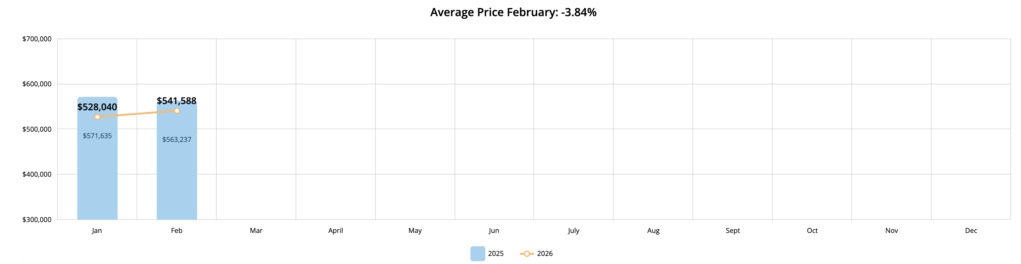 The average price for a Windsor-Essex home in February 2026 was $541,588, a 3.84% decrease from the 2025 average of $563,237. Year-to-date for 2026 the average home price is $535,717, a 5.52% decrease from the 2025 average through February of $567,043.