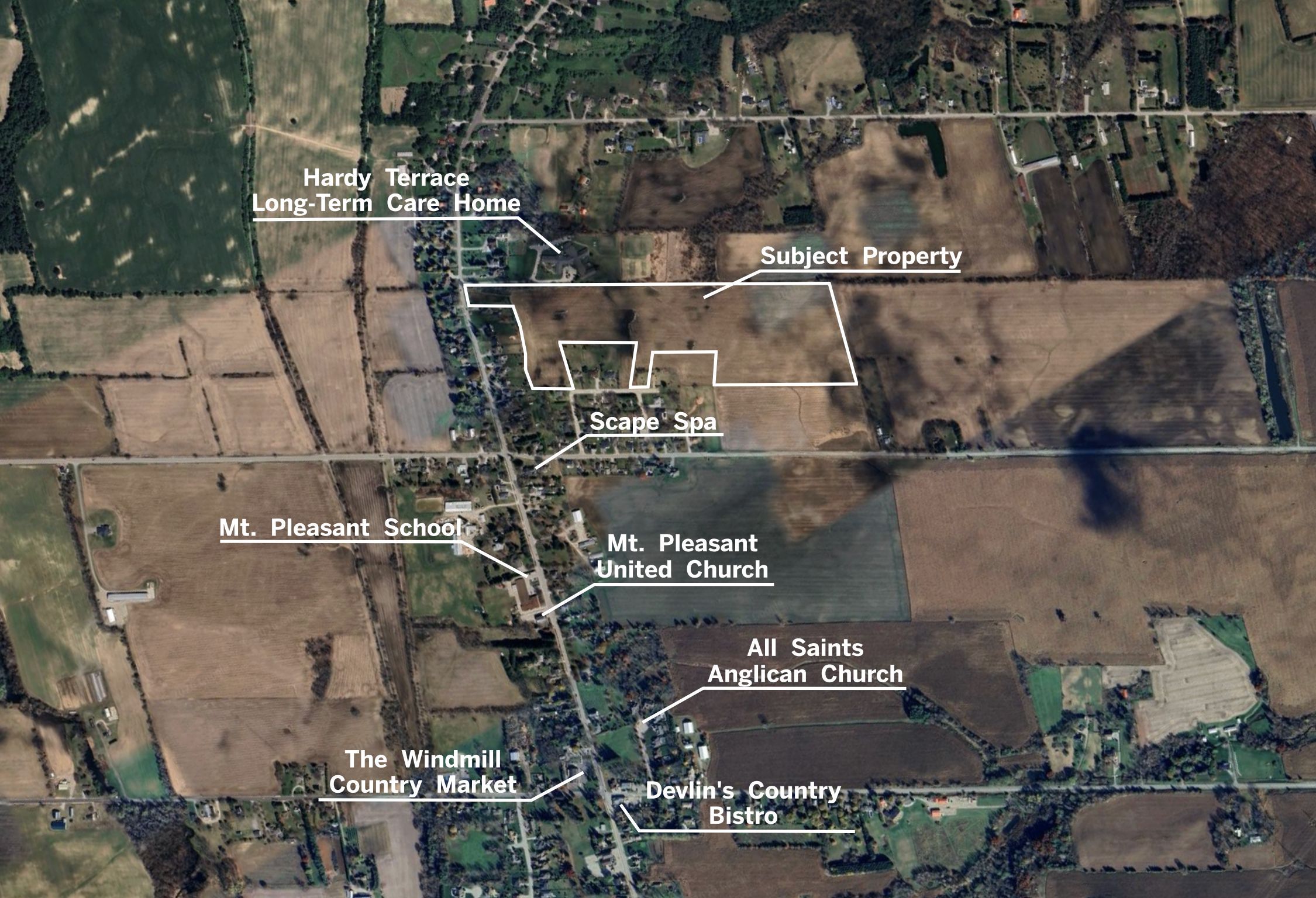 An exceptional opportunity to acquire 40 acres of strategically located land on mount pleasant road, offering a rare combination of settlement-area designation and development potential in one of brant county's most desirable rural-residential corridors. Walking distance to extensive trails, school, church, restaurants, spa and the famous windmill country market in the upscale village of mount pleasant just south/west of brantford. Approximately 19 acres are designated village community lands, creating immediate potential for estate residential development, low-density housing, or thoughtfully planned country-estate lots, while the balance of the property remains in productive agricultural use providing both crop income and future land-banking value. With multiple entrances, tableland topography, and attractive rural setting, the property is ideally suited for a signature estate enclave, luxury country homes, or a boutique residential concept. The location offers excellent connectivity to the community while maintaining the privacy and character increasingly sought by discerning buyers. A rare chance to acquire scale, designation, and future potential in one of the region's most tightly held rural-settlement markets.