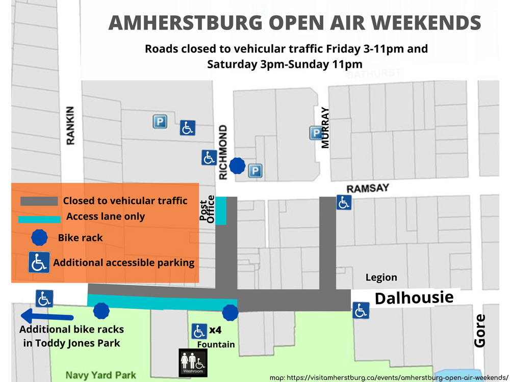 Are you looking for something to do this weekend? Be sure to check out the Town of Amherstburg’s Open Air Weekends, now until September 27th, 2021. Every Friday night from 3:00pm to 11:00pm and Saturday from 3:00pm until 11:00pm on Sunday Downtown Amherstburg streets are open for visitors to enjoy all the businesses Amherstburg has to offer such as outdoor patios, cafes, and sidewalk retail. Check out the map below to find out which streets are closed during these hours and where you can park including bike parking!