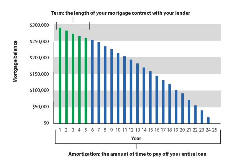 First let's talk about what a mortgage term is. Simply, it is the length of time your mortgage contract is in effect. Your mortgage contract outlines the details of your agreement with the lender including your interest rate. Terms can range in length from months to five years to sometimes even longer. At the end of each term, you must renew your mortgage and most people require multiple terms to pay their mortgage back in full.