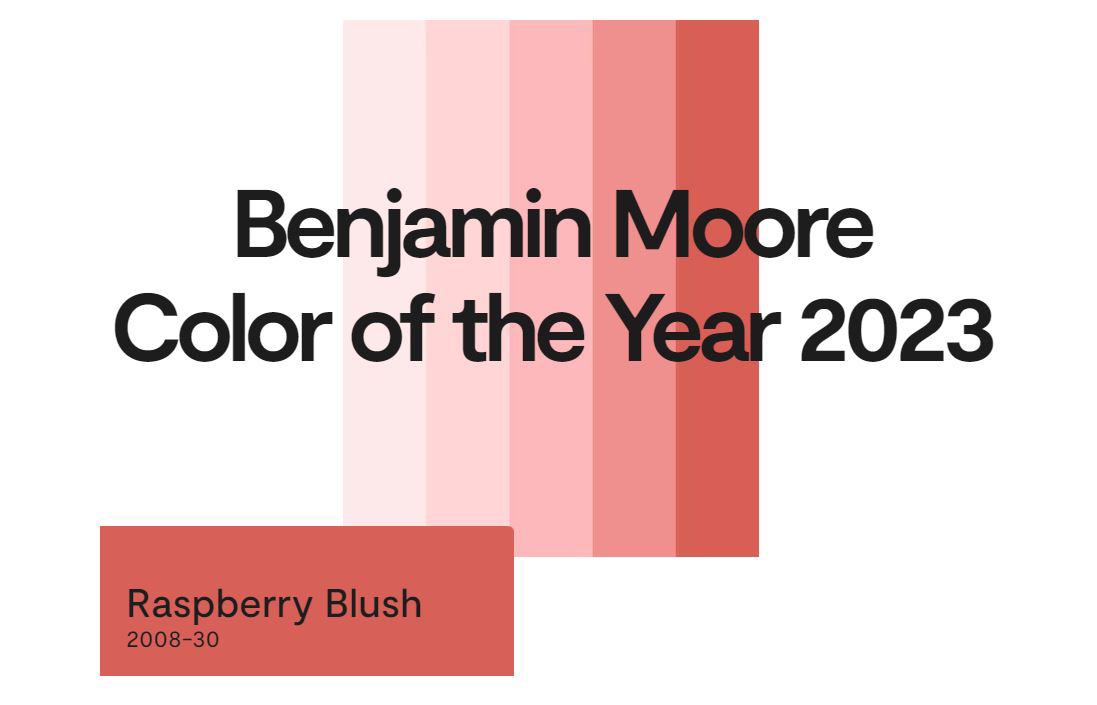 “A vivacious shade of coral tinged with pink, Raspberry Blush enlivens the senses with an electric optimism. Never a backdrop, Raspberry Blush is the definition of charismatic color (sic). This unapologetic shade of red orange had us thinking: bold, bolder, boldest. This sentiment flows through the rest of the palette as we immerse ourselves in hues that make a statement.” (Benjamin Moore, 2023)
