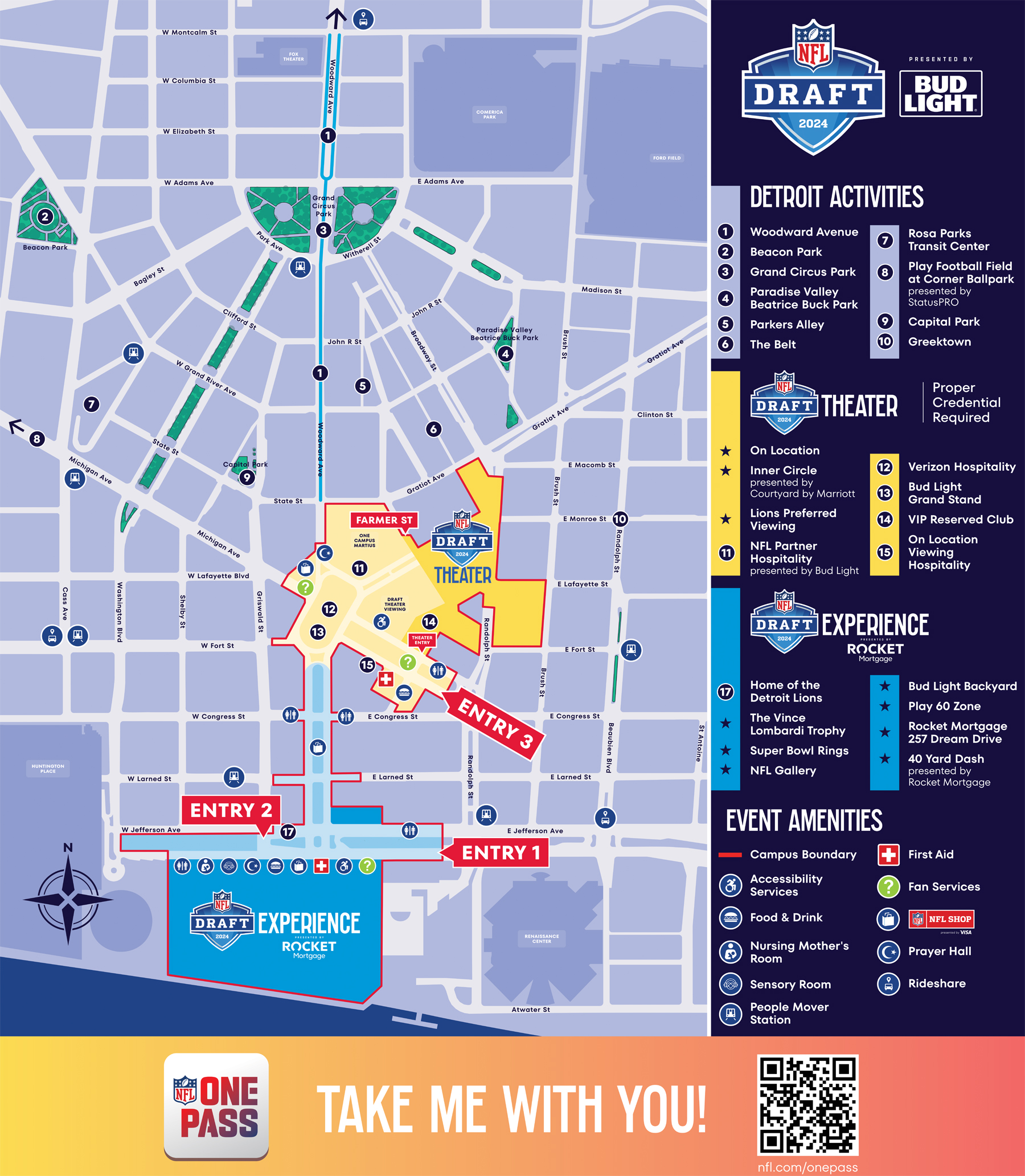On April 25th, the football world will descend on Detroit, Michigan for the 2024 NFL Draft. Starting on Thursday night and running until April 27th, the annual NFL Draft will welcome all 32 teams and their fans to the area as the nation's best college football players hear their name called and enter the NFL. The 2024 NFL Draft Experience will take place at Hart Plaza and will be home to games, exhibits, experiences, live entertainment and more over the 3 days. The Draft Experience is a free event for all to enjoy. Draft Day in the D will be hosted at a variety of parks surrounding the the Draft Experience and the Draft Theater. Also a free event, there will be local vendors, entertainment, and more. The Draft Theater where the selections will be made is being constructed and will be at Campus Martius. The portion of the event is ticketed, with virtually all packages already sold out. Want to see all the events happening around Detroit? Check out the map below.