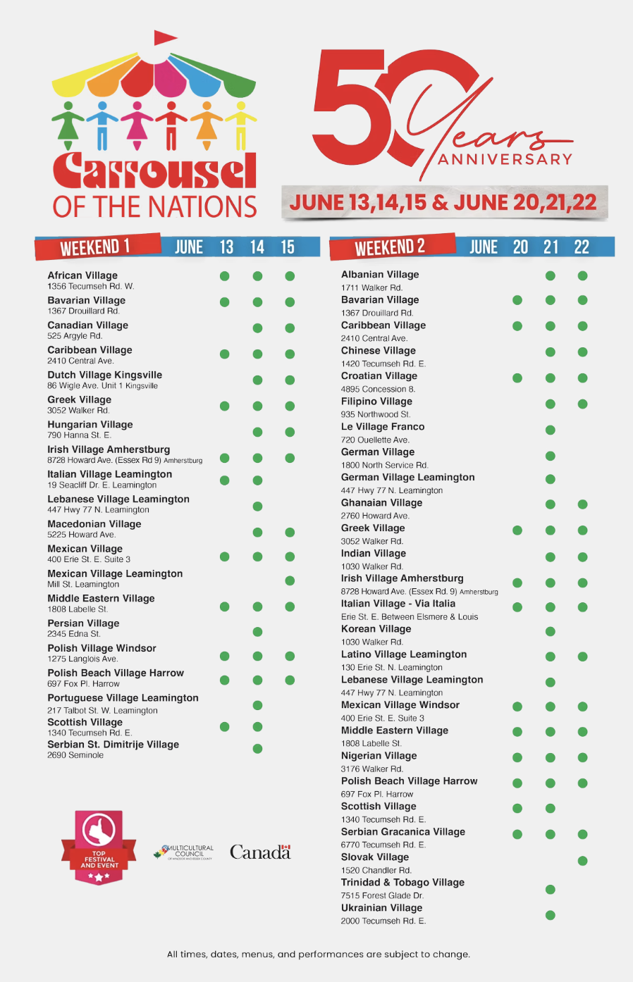 Each cultural village offers an immersive experience into the traditions of local communities — many of which have called Windsor home for generations. Whether you're sampling traditional foods, watching live performances, or learning about family heritage through storytelling and crafts, each village brings its own heartbeat to the event.