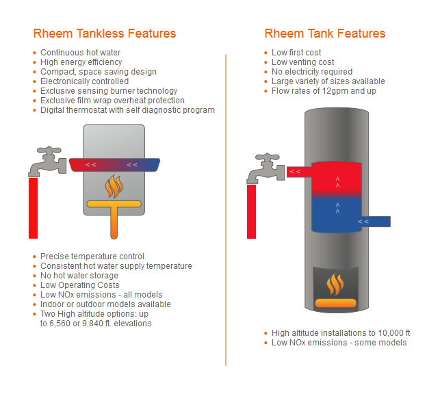 Once you decide between renting or buying you’ll be faced with one last choice. Tank versus tankless. Tanked water heaters store and heat water in an insulated tank. When you use hot water, the hot water leaves the tank and comes out whichever tap you have turned on. Behind in the tank, cold water enters to be heated and reheated and available when needed. One thing to consider is that when hot water is in high demand in your household, it’s not uncommon to completely empty the tank’s supply and have to wait for it to heat a new supply of hot water. Tankless water heaters on the other hand do not store water. They deliver a constant supply of hot water by passing water through a heat exchanger. They are extremely efficient, as water is heated only when needed, ensuring that you’ll never run out of hot water. Tankless water heaters are also compact meaning that they can be installed anywhere in your home. This option provides endless hot water and is more energy-efficient than tanked water heaters. Below is a breakdown of the two options.