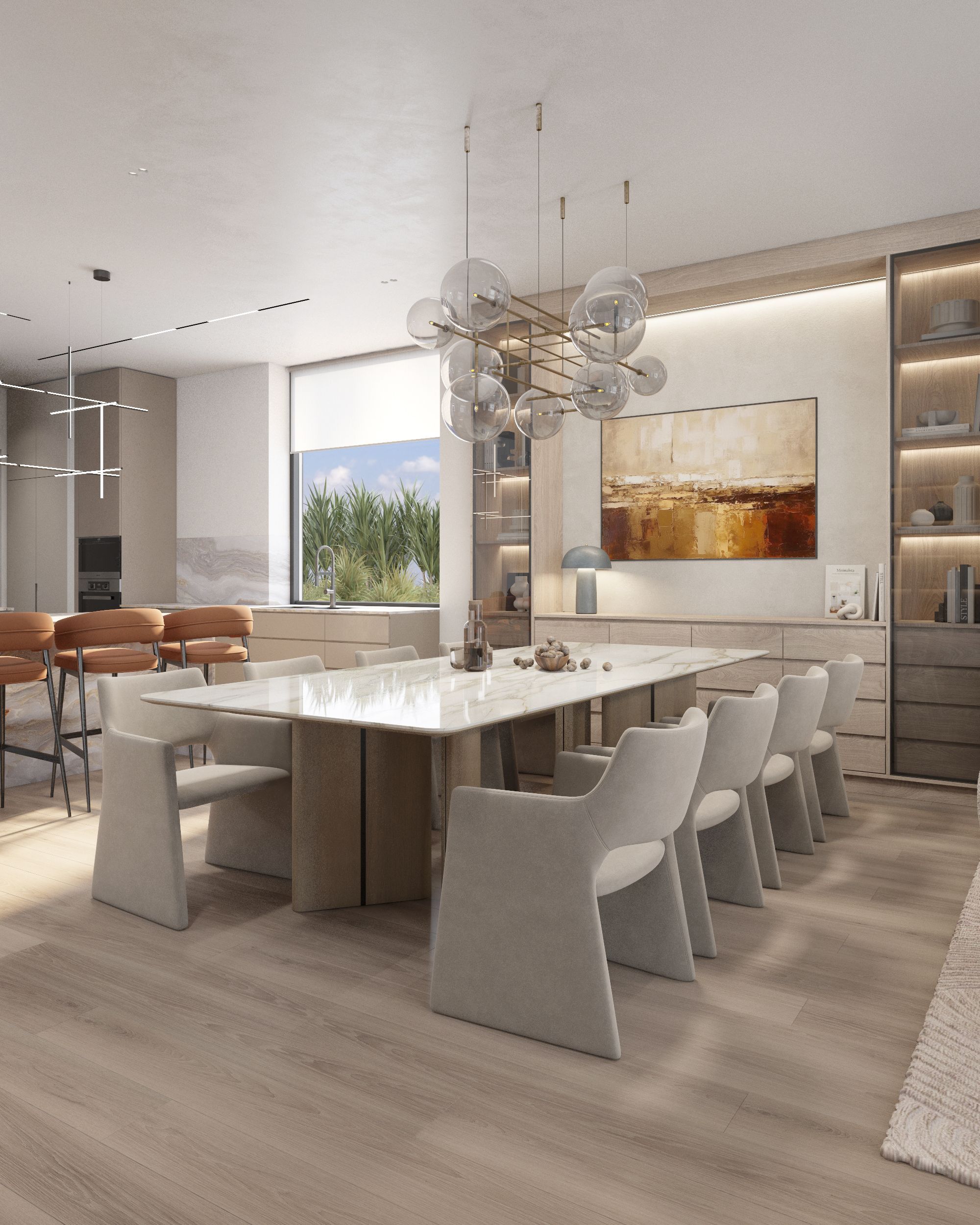 • Open-concept layout with 14-foot ceilings and retractable glass doors.