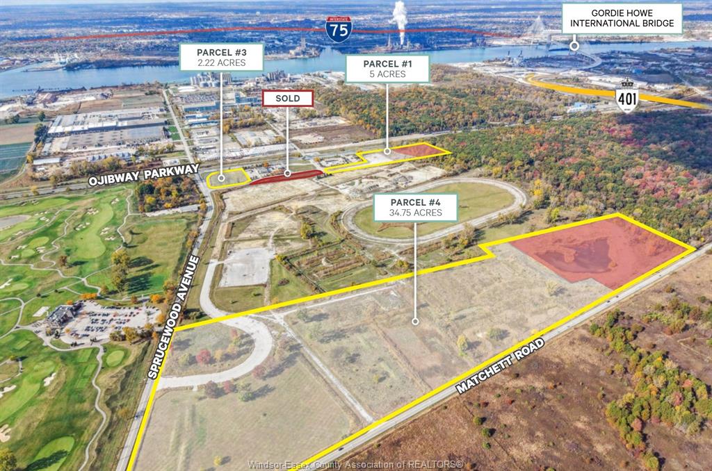 Approximately 43. 39 acres across four (4) separate land parcels located between ojibway parkway, sprucewood ave and matchett road in windsor. This prime development opportunity is perfectly suited for numerous commercial/retail/medical applications. Each parcel is also available for sale separately. Please contact listing brokerage for more information and complete offering package.